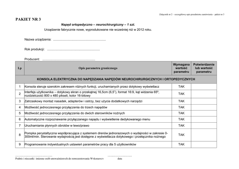 Załącznik nr 2 – szczegółowy opis przedmiotu zamówienia – pakiet nr 3 PAKIET NR 3 Napęd ortopedyczno – neurochirurgiczny – 1 szt. Urządzenie fabrycznie nowe, wyprodukowane nie wcześniej niż w 2012 roku. Nazwa urządzenia: ............................................................ Rok produkcji: ............................................................ Producent: ............................................................ Lp Opis parametru granicznego Wymagana wartość parametru Potwierdzenie lub wartość parametru KONSOLA ELEKTRYCZNA DO NAPĘDZANIA NAPĘDÓW NEUROCHIRURGICZNYCH I ORTOPEDYCZNYCH 1 Konsola steruje szerokim zakresem różnych funkcji, uruchamianych przez dotykowy wyświetlacz TAK 2 Interfejs użytkownika – dotykowy ekran o przekątnej 16,5cm (6,5”), format 16:9, kąt widzenia 65º, rozdzielczość 800 x 480 pikseli, kolor 16-bitowy TAK 3 Zatrzaskowy montaż nasadek, adapterów i ostrzy, bez użycia dodatkowych narzędzi TAK 4 Możliwość jednoczesnego przyłączenia do trzech napędów TAK 5 Możliwość jednoczesnego przyłączenia do dwóch sterowników nożnych TAK 6 Automatyczne rozpoznawanie przyłączanego napędu i wyświetlenie dedykowanego menu TAK 7 Uruchamianie płynnych obrotów w lewo/prawo TAK 8 Pompka perystaltyczna współpracująca z systemem drenów jednorazowych o wydajności w zakresie 0300ml/min. Sterowanie wydajnością jest dostępne z wyświetlacza dotykowego i przełącznika nożnego TAK 9 Programowanie indywidualnych ustawień parametrów pracy dla 5 użytkowników TAK ....................................................... Podpis i pieczątki imienne osób upoważnionych do reprezentowania Wykonawcy .................................... data Załącznik nr 2 – szczegółowy opis przedmiotu zamówienia – pakiet nr 3 Napęd przeznaczony do procedur neurochirurgicznych 10 Obroty wiercenia lewo/prawo TAK 11 Obroty maksymalne: 75 000 ± 1000 obr/min TAK 12 Zatrzaskowy montaż nasadek, adapterów i ostrzy, bez użycia dodatkowych narzędzi TAK 13 Zasilanie napędu z konsoli elektronicznej poprzez zintegrowany kabel o długości 3.6m ± 0.2m TAK 14 Płynna regulacja ruchu obrotowego TAK 15 Silniki bezszczotkowe - nie wymagają konserwacji i smarowania TAK 16 Zabezpieczenie przed przypadkowym uruchomieniem napędu ze sterownika ręcznego TAK 17 Zabezpieczenie przed przeciążeniem TAK 18 Metody sterylizacji – autoklaw („Flash”, „Hi-Vac”), tlenek etylenu (ETO) TAK 19 Waga: 399g ± 5g (łącznie z przewodem) TAK 20 Przełącznik ręczny do sterowania napędem TAK ....................................................... Podpis i pieczątki imienne osób upoważnionych do reprezentowania Wykonawcy .................................... data Załącznik nr 2 – szczegółowy opis przedmiotu zamówienia – pakiet nr 3 Przełącznik nożny do konsoli 21 Przewodowy sterownik nożny programowalny (pięć przycisków) TAK Nasadki do oferowanego napędu neurochirurgicznego 22 Nasadka narzędziowa perforator wolnoobrotowy do trepanu - 1 szt TAK 23 Ostrze trepanu 14/11mm jednorazowe typu Zyphr - 1 szt. TAK 24 Nasadka narzędziowa obrotowy kraniotom 12mm - 1 szt. TAK 25 Ostrze jednorazowe do kraniotomu średniego 1.5mm x 12.0mm - 1 szt. TAK Napęd przeznaczony do procedur traumatologicznych, chirurgii małych kości, medycyny sportowej - 1 szt 26 Zatrzaskowy montaż, nasadek, adapterów i ostrzy, bez użycia dodatkowych narzędzi TAK 27 Zasilanie napędów z konsoli elektronicznej TAK 28 Płynna regulacja ruchu obrotowego/oscylacyjnego TAK 29 Silniki bezszczotkowe - nie wymagają konserwacji i smarowania TAK 30 Zabezpieczenie przed przypadkowym uruchomieniem TAK 31 Zabezpieczenie przed przeciążeniem TAK 32 Metody sterylizacji – autoklaw („Flash”, „Hi-Vac”), tlenek etylenu (ETO), plazma TAK 33 Obroty wiercenia lewo/prawo TAK ....................................................... Podpis i pieczątki imienne osób upoważnionych do reprezentowania Wykonawcy .................................... data Załącznik nr 2 – szczegółowy opis przedmiotu zamówienia – pakiet nr 3 34 Obroty maksymalne: 1500 obr/min TAK 35 Obroty rozwiercania: 0÷520 obr/min TAK 36 Maksymalny moment obrotowy w trybie wiercenia: 1.58Nm TAK 37 Maksymalny moment obrotowy w trybie rozwiercania: 4.18Nm TAK 38 Kaniulacja wzdłuż osi napędu: 5mm Dwa przyciski do uruchamiania obrotów lewo/prawo osobnymi przyciskami oraz oscylacyjny tryb pracy 39 (wciśnięte dwa przyciski) 40 Moc: 140W TAK 41 Waga: 0.47kg TAK 42 Do wyboru 22 kompatybilne nasadki do wiercenia i rozwiercania TAK TAK TAK Nasadki do oferowanego napędu ortopedycznego 43 Nasadka do drutów Kirschnera 0.7-1.8mm TAK 44 Nasadka do drutów Kirschnera 2.0-3.2mm TAK 45 Nasadka wiertarska typu Jacobs 6.35 mm z kluczykiem TAK 46 Nasadka piła oscylacyjna, płynna regulacja częstotliwości oscylacji o minimalnym zakresie min. 0 – 30000 osc/min, z możliwością ustawiania ostrza w 8 pozycjach względem rękojeści TAK Kaseta sterylizacyjna - 1 szt. 47 Kaseta plastikowa do oferowanego zestawu ....................................................... Podpis i pieczątki imienne osób upoważnionych do reprezentowania Wykonawcy TAK .................................... data Załącznik nr 2 – szczegółowy opis przedmiotu zamówienia – pakiet nr 3 Wózek aparaturowy - 1 szt. 48 Powierzchnie łatwozmywalne standardowymi środkami dezynfekującymi TAK 49 Min. 8 szuflad z przekładkami do organizacji przestrzeni wnętrza szuflad TAK 50 Naklejki do znakowania zawartości szuflad w zestawie TAK 51 2 boczne uchwyty TAK 52 Koła obrotowe, 2 przednie z blokadą TAK 53 Z tyłu wózka uchwyt do zawijania przewodu zasilającego aparatury TAK GWARANCJA I SERWIS Gwarancja : min. 24 miesiące. Czas dotarcia serwisu i naprawy od momentu zgłoszenia: max 24 h. W przypadku braku możliwości naprawy w w/w czasie, dostawca w terminie 48 h od momentu zgłoszenia zobowiązany jest dostarczyć sprzęt zastępczy