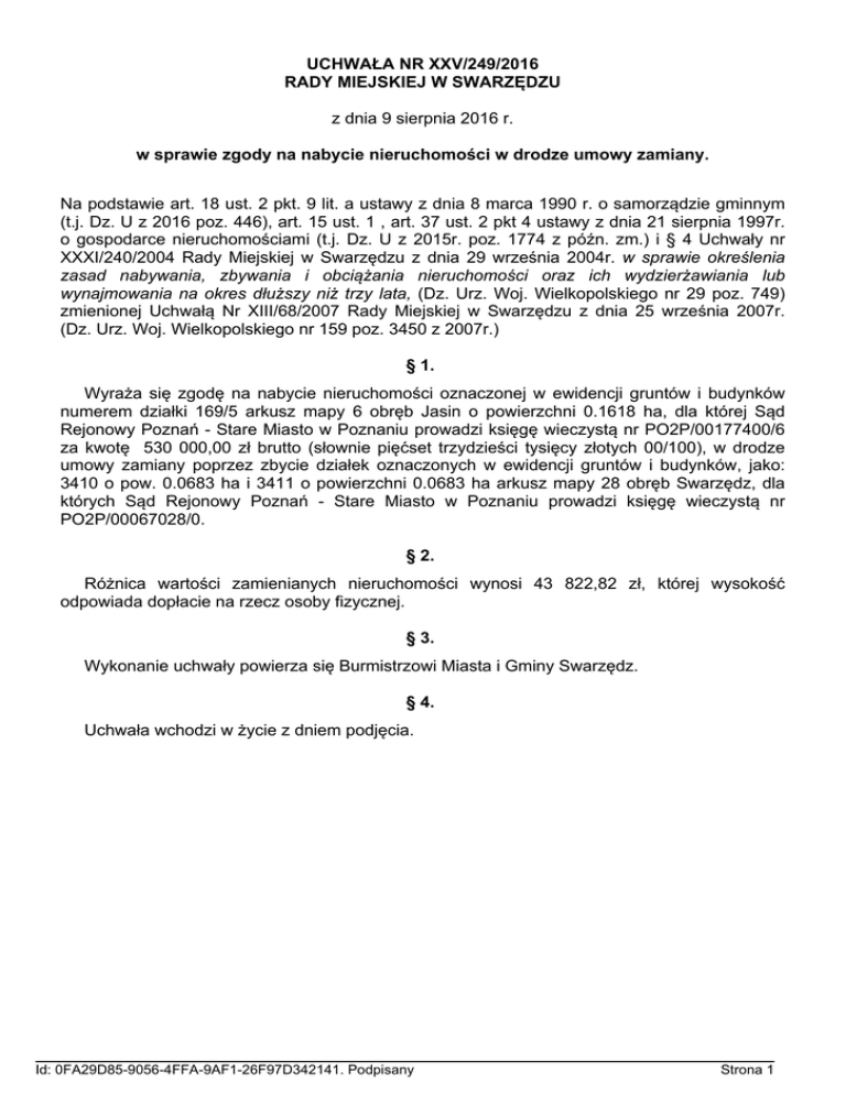 UCHWAŁA NR XXV/249/2016 RADY MIEJSKIEJ W SWARZĘDZU z dnia 9 sierpnia 2016 r. w sprawie zgody na nabycie nieruchomości w drodze umowy zamiany. Na podstawie art. 18 ust. 2 pkt. 9 lit. a ustawy z dnia 8 marca 1990 r. o samorządzie gminnym (t.j. Dz. U z 2016 poz. 446), art. 15 ust. 1 , art. 37 ust. 2 pkt 4 ustawy z dnia 21 sierpnia 1997r. o gospodarce nieruchomościami (t.j. Dz. U z 2015r. poz. 1774 z późn. zm.) i § 4 Uchwały nr XXXI/240/2004 Rady Miejskiej w Swarzędzu z dnia 29 września 2004r. w sprawie określenia zasad nabywania, zbywania i obciążania nieruchomości oraz ich wydzierżawiania lub wynajmowania na okres dłuższy niż trzy lata, (Dz. Urz. Woj. Wielkopolskiego nr 29 poz. 749) zmienionej Uchwałą Nr XIII/68/2007 Rady Miejskiej w Swarzędzu z dnia 25 września 2007r. (Dz. Urz. Woj. Wielkopolskiego nr 159 poz. 3450 z 2007r.) § 1. Wyraża się zgodę na nabycie nieruchomości oznaczonej w ewidencji gruntów i budynków numerem działki 169/5 arkusz mapy 6 obręb Jasin o powierzchni 0.1618 ha, dla której Sąd Rejonowy Poznań - Stare Miasto w Poznaniu prowadzi księgę wieczystą nr PO2P/00177400/6 za kwotę 530 000,00 zł brutto (słownie pięćset trzydzieści tysięcy złotych 00/100), w drodze umowy zamiany poprzez zbycie działek oznaczonych w ewidencji gruntów i budynków, jako: 3410 o pow. 0.0683 ha i 3411 o powierzchni 0.0683 ha arkusz mapy 28 obręb Swarzędz, dla których Sąd Rejonowy Poznań - Stare Miasto w Poznaniu prowadzi księgę wieczystą nr PO2P/00067028/0. § 2. Różnica wartości zamienianych nieruchomości wynosi 43 822,82 zł, której wysokość odpowiada dopłacie na rzecz osoby fizycznej. § 3. Wykonanie uchwały powierza się Burmistrzowi Miasta i Gminy Swarzędz. § 4. Uchwała wchodzi w życie z dniem podjęcia. Id: 0FA29D85-9056-4FFA-9AF1-26F97D342141. Podpisany Strona 1 UZASADNIENIE Przedmiotem niniejszej uchwały jest uzyskanie zgody Rady Miejskiej w Swarzędzu na nabycie na rzecz Gminy Swarzędz nieruchomości oznaczonej w ewidencji gruntów i budynków numerem działki 169/5 arkusz mapy 6 obręb Jasin o powierzchni 0.1618 ha za kwotę 530 000,00 zł (pięćset trzydzieści tysięcy złotych) w drodze umowy zamiany z dopłatą w wysokości równej różnicy wartości zamienianych nieruchomości. Działka 169/5 nie objęta aktualnie obowiązującym miejscowym planem zagospodarowania przestrzennego, natomiast Studium uwarunkowań i kierunków zagospodarowania przestrzennego przyjęte Uchwałą Rady Miejskiej Nr X/51/2011 z 29 marca 2011r. określa teren działki, jako teren zabudowy mieszkaniowo-usługowej oznaczonym symbolem II.49.M/U. Przedmiotem zamiany na działkę nr 169/5 obręb Jasin będą działki oznaczone numerami: 3410 i 3411 arkusz mapy 28 obręb Swarzędz o łącznej powierzchni 0.1366 ha, których prawo własności przysługuje Gminie Swarzędz. Dla działek tych nie obowiązują ustalenia żadnego miejscowego planu zagospodarowania przestrzennego. W 2015 dla rzeczonych działek zostały ustalone warunki zabudowy w drodze decyzji administracyjnych (nr 56/2015 i 57/2015 z 20.05.2015r.) dla inwestycji polegającej na budowie budynku mieszkalnego jednorodzinnego wolnostojącego na terenie każdej z działek. Zgodnie z operatami szacunkowymi wartości zamienianych nieruchomości kształtują się następująco: - wartość działki 169/5 wynosi 530 000,00 zł (pięćset trzydzieści tysięcy złotych) ; - wartość działek 3410 i 3411 obręb Swarzędz wynosi po 197 633,00 zł tj razem 395 266,00 zł (słownie: trzysta dziewięćdziesiąt pięć tysięcy dwieście sześćdziesiąt sześć złotych). Ponieważ Gmina jest podatnikiem podatku VAT powyższa kwota zostanie powiększona o stawkę VAT w wysokości 23% w kwocie 90 911,18 zł. Powyższe powoduje, iż wartość działek gminnych będących przedmiotem zamiany wynosi łącznie 486 177,18 zł brutto. Różnica wartości zamienianych nieruchomości wynosi 43 822,82 zł (czterdzieści trzy tysiące osiemset dwadzieścia dwa złote 82/100) co stanowi dopłatę na rzecz osoby fizycznej. Pozyskaną w drodze zamiany, za zgodą Rady Miejskiej w Swarzędzu, działkę nr 169/5 Id: 0FA29D85-9056-4FFA-9AF1-26F97D342141. Podpisany Strona 1 obręb Jasin o pow. 0.1618 ha, Burmistrz Miasta i Gminy Swarzędz zamierza przeznaczyć na realizację zadania pt. budowa świetlicy wiejskiej w miejscowości Jasin. Id: 0FA29D85-9056-4FFA-9AF1-26F97D342141. Podpisany Strona 2