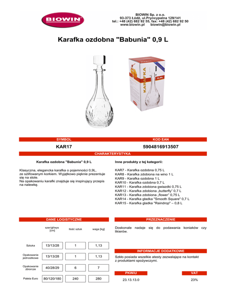 Karafka ozdobna "Babunia" 0,9 L SYMBOL KOD EAN KAR17 5904816913507 CHARAKTERYSTYKA Karafka ozdobna "Babunia" 0,9 L Inne produkty z tej kategorii: Klasyczna, elegancka karafka o pojemności 0,9L, ze szlifowanym korkiem. Wyjątkowo pięknie prezentuje się na stole. Na opakowaniu karafki znajduje się inspirujący przepis na nalewkę. KAR7 - Karafka ozdobna 0,75 L KAR8 - Karafka zdobiona na wino 1 L KAR9 - Karafka ozdobna 1 L KAR10 - Karafka ozdobna 0,7 L KAR11 - Karafka zdobiona gwiazdki 0,75 L KAR12 - Karafka zdobiona „butterfly” 0,7 L KAR13 - Karafka zdobiona „flower” 0,75 L KAR14 - Karafka gładka "Smooth Square" 0,7 L KAR15 - Karafka gladka "Raindrop" – 0,8 L DANE LOGISTYCZNE Sztuka PRZEZNACZENIE szer/gł/wys [cm] Ilość sztuk waga [kg] 13/13/28 1 1,13 Doskonale nadaje się do podawania koniaków czy likierów. INFORMACJE DODATKOWE Opakowanie jednostkowe 13/13/28 1 1,13 Opakowanie zbiorcze 40/28/29 6 7 Paleta Euro 80/120/180 240 280 Szkło posiada wszelkie atesty zezwalające na kontakt z produktami spożywczymi. PKWiU VAT 23.13.13.0 23%