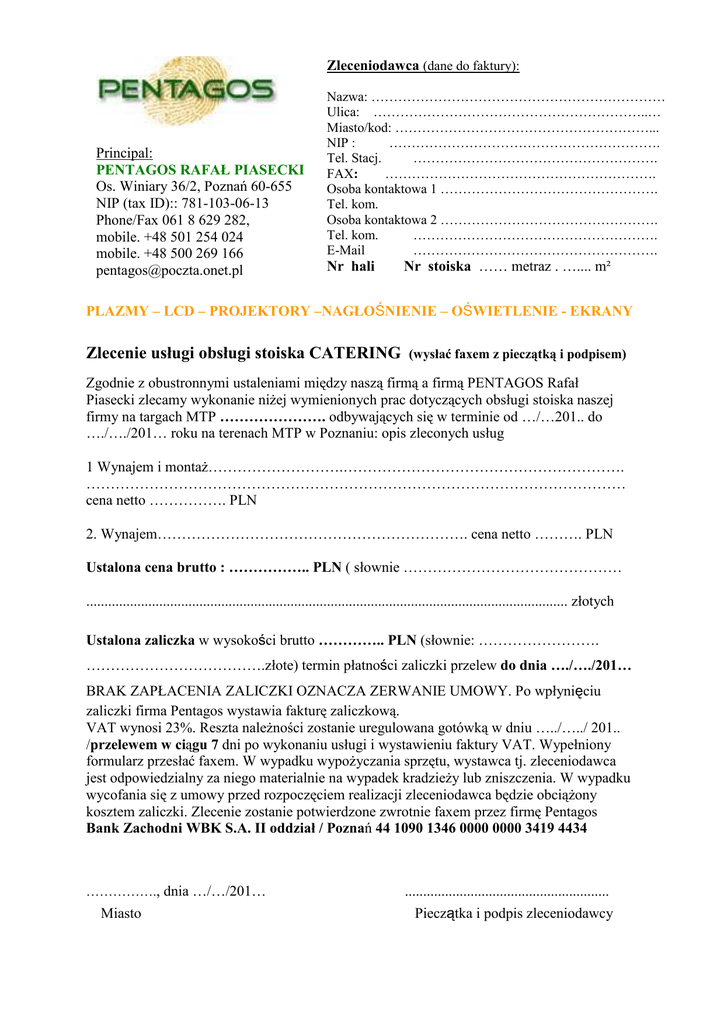 Zleceniodawca (dane do faktury): Principal: PENTAGOS RAFAŁ PIASECKI Os. Winiary 36/2, Poznań 60-655 NIP (tax ID):: 781-103-06-13 Phone/Fax 061 8 629 282, mobile. +48 501 254 024 mobile. +48 500 269 166 [email protected] Nazwa: ………………………………………………………… Ulica: ……………………………………………………..… Miasto/kod: …………………………………………………... NIP : ……………………………………………………. Tel. Stacj. ………………………………………………. FAX: ……………………………………………………. Osoba kontaktowa 1 …………………………………………. Tel. kom. Osoba kontaktowa 2 …………………………………………. Tel. kom. ………………………………………………. E-Mail ………………………………………………. Nr hali Nr stoiska …… metraz . ….... m² PLAZMY – LCD – PROJEKTORY –NAGŁOŚNIENIE – OŚWIETLENIE - EKRANY Zlecenie usługi obsługi stoiska CATERING (wysłać faxem z pieczątką i podpisem) Zgodnie z obustronnymi ustaleniami między naszą firmą a firmą PENTAGOS Rafał Piasecki zlecamy wykonanie niŜej wymienionych prac dotyczących obsługi stoiska naszej firmy na targach MTP …………………. odbywających się w terminie od …/…201.. do …./…./201… roku na terenach MTP w Poznaniu: opis zleconych usług 1 Wynajem i montaŜ……………………….…………………………………………………. ………………………………………………………………………………………………… cena netto ……………. PLN 2. Wynajem………………………………………………………. cena netto ………. PLN Ustalona cena brutto : …………….. PLN ( słownie ……………………………………… .................................................................................................................................... złotych Ustalona zaliczka w wysokości brutto ………….. PLN (słownie: ……………………. ……………………………….złote) termin płatności zaliczki przelew do dnia …./…./201… BRAK ZAPŁACENIA ZALICZKI OZNACZA ZERWANIE UMOWY. Po wpłynięciu zaliczki firma Pentagos wystawia fakturę zaliczkową. VAT wynosi 23%. Reszta naleŜności zostanie uregulowana gotówką w dniu …../…../ 201.. /przelewem w ciągu 7 dni po wykonaniu usługi i wystawieniu faktury VAT. Wypełniony formularz przesłać faxem. W wypadku wypoŜyczania sprzętu, wystawca tj. zleceniodawca jest odpowiedzialny za niego materialnie na wypadek kradzieŜy lub zniszczenia. W wypadku wycofania się z umowy przed rozpoczęciem realizacji zleceniodawca będzie obciąŜony kosztem zaliczki. Zlecenie zostanie potwierdzone zwrotnie faxem przez firmę Pentagos Bank Zachodni WBK S.A. II oddział / Poznań 44 1090 1346 0000 0000 3419 4434 ……………., dnia …/…/201… Miasto ........................................................ Pieczątka i podpis zleceniodawcy