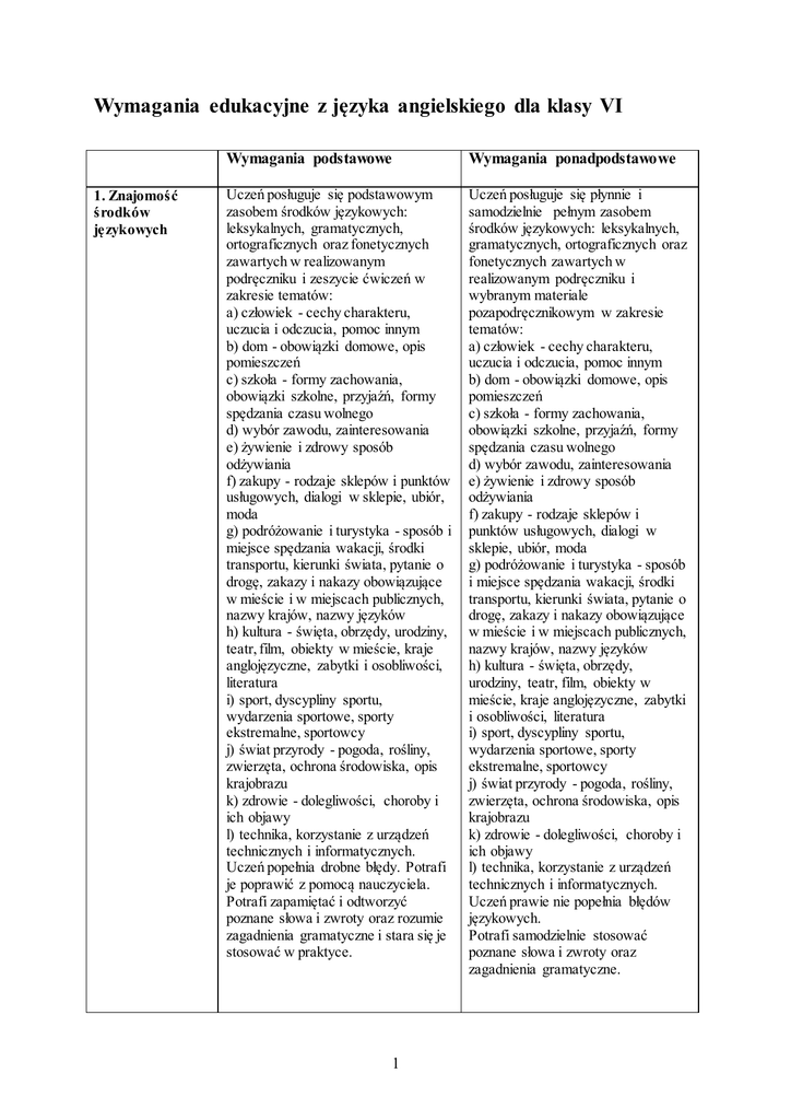 Wymagania edukacyjne z języka angielskiego dla klasy VI
