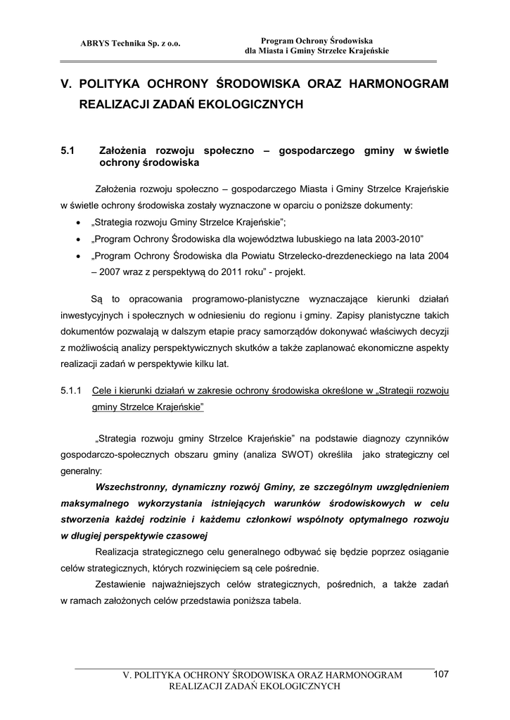 Program Ochrony Środowiska dla Miasta i Gminy Strzelce Krajeńskie ABRYS Technika Sp. z o.o. V. POLITYKA OCHRONY ŚRODOWISKA ORAZ HARMONOGRAM REALIZACJI ZADAŃ EKOLOGICZNYCH Założenia rozwoju społeczno – gospodarczego gminy w świetle ochrony środowiska 5.1 Założenia rozwoju społeczno – gospodarczego Miasta i Gminy Strzelce Krajeńskie w świetle ochrony środowiska zostały wyznaczone w oparciu o poniższe dokumenty: „Strategia rozwoju Gminy Strzelce Krajeńskie”; „Program Ochrony Środowiska dla województwa lubuskiego na lata 2003-2010” „Program Ochrony Środowiska dla Powiatu Strzelecko-drezdeneckiego na lata 2004 – 2007 wraz z perspektywą do 2011 roku” - projekt. Są to opracowania programowo-planistyczne wyznaczające kierunki działań inwestycyjnych i społecznych w odniesieniu do regionu i gminy. Zapisy planistyczne takich dokumentów pozwalają w dalszym etapie pracy samorządów dokonywać właściwych decyzji z możliwością analizy perspektywicznych skutków a także zaplanować ekonomiczne aspekty realizacji zadań w perspektywie kilku lat. 5.1.1 Cele i kierunki działań w zakresie ochrony środowiska określone w „Strategii rozwoju gminy Strzelce Krajeńskie” „Strategia rozwoju gminy Strzelce Krajeńskie” na podstawie diagnozy czynników gospodarczo-społecznych obszaru gminy (analiza SWOT) określiła jako strategiczny cel generalny: Wszechstronny, dynamiczny rozwój Gminy, ze szczególnym uwzględnieniem maksymalnego wykorzystania istniejących warunków środowiskowych w celu stworzenia każdej rodzinie i każdemu członkowi wspólnoty optymalnego rozwoju w długiej perspektywie czasowej Realizacja strategicznego celu generalnego odbywać się będzie poprzez osiąganie celów strategicznych, których rozwinięciem są cele pośrednie. Zestawienie najważniejszych celów strategicznych, pośrednich, a także zadań w ramach założonych celów przedstawia poniższa tabela. V. POLITYKA OCHRONY ŚRODOWISKA ORAZ HARMONOGRAM REALIZACJI ZADAŃ EKOLOGICZNYCH 107 Program Ochrony Środowiska dla Miasta i Gminy Strzelce Krajeńskie ABRYS Technika Sp. z o.o. T a b e l a 29. Cele pośrednie Cel strategiczny 1 Zadania 2 Rozwój zasobów ludzkich Rozwój infrastruktury technicznej Powiększenie zdolność naszej gminy do utrzymania i tworzenia nowych miejsc pracy, zachęcenia do nowych inwestycji, wzrostu wartości zasobów Gminy oraz rozwinięcia bazy gospodarczej, Zwiększenie i poprawa jakości dostępu do informacji na rzecz przedsiębiorstw i mieszkańców z wykorzystaniem nowoczesnych technologii teleinformatycznych, Dostosowanie oferty edukacyjnej szkół do potrzeb rynku pracy. Budowa i modernizacja infrastruktury technicznej w zakresie: kanalizacji, wodociągów, oczyszczalni, sieci gazowej, dróg i chodników oraz modernizacja kotłowni. 3 Rozwój obszarów wiejskich Poprawa warunków i jakości życia ludności zamieszkałej na obszarach wiejskich. 108 Prowadzenie polityki ulg podatkowych dla przedsiębiorstw; Współpraca z inwestorami, preferowanie inwestorów zapewniających lepsze wykorzystanie naturalnych walorów gminy i prowadzących działalność przyjazną dla środowiska naturalnego; Budowa kanalizacji ogólnospławnej w gminie Budowa i modernizacja dróg i chodników na terenie gminy Budowa kanalizacji sanitarnej Strzelce Klasztorne Budowa sieci kanalizacyjnej i energetycznej na terenach przemysłowych przy ul. Jedności Robotniczej w Strzelcach Kraj. Budowa kanalizacji przy ul. Konopnickiej w Strzelcach Kraj. Budowa sieci wodociągowej w Dankowie Budowa sieci wodociągowej z Buszowa do Dankowa Remont hydroforni wiejskiej w Lubiczu i budowa sieci wodociągowej: z Lipich Gór do Lubicza, z Żabicka i Machar do Bobrówka, z Buszowa do Dankowa z Bronowic do Sokólska Budowa kanalizacji przy Al. Wolności Budowa kanalizacji przy ulicy Kopernika Budowa oczyszczalni przydomowych dla budynków wielorodzinnych na terenie wiejskim: Sidłów, Ogrady Podjęcie działań zmierzających do zawarcia porozumienia międzygminnego w celu usuwania nieczystości stałych i utylizacji Kontynuacja budowy sieci gazowej w gminie Modernizacja osiedlowej kotłowni przy Al. Wolności dotychczas opalanej miałem węglowym o mocy 1,33 MW na kotłownię opalaną biomasą o mocy 1,2 MW Modernizacja kotłowni ulicy Wyzwolenia 18 Organizacja warsztatów, seminariów i kursów doskonalenia zawodowego dla rolników; Przygotowanie programu odnowy wsi oraz zachowania i ochrony dziedzictwa kulturowego; Remont, budowa i urządzenie placów zabaw, boisk sportowych, sal gimnastycznych przy szkołach, ścieżek rowerowych, szlaków pieszych służących do użytku publicznego; Urządzenie lub budowa małej infrastruktury turystycznej oraz rekreacyjnej; Zagospodarowanie zbiorników i cieków wodnych w obrębie miejscowości; Remont obiektów zabytkowych oraz miejscowych pomników historycznych V. POLITYKA OCHRONY ŚRODOWISKA ORAZ HARMONOGRAM REALIZACJI ZADAŃ EKOLOGICZNYCH Program Ochrony Środowiska dla Miasta i Gminy Strzelce Krajeńskie ABRYS Technika Sp. z o.o. 1 2 3 Poprawa stanu środowiska naturalnego, warunków życia mieszkańców i bezpieczeństwa publicznego Promowanie walorów gminy i rozwój funkcji turystycznej Zagospodarowanie terenów zdegradowanych, Poprawa warunków mieszkaniowych, Przeciwdziałanie patologiom społecznym. Rozbudowa i modernizacja infrastruktury turystycznej, Modernizacja obiektów zabytkowych, Promocja naszego regionu. Rozwój kultury, kultury fizycznej, sportu oraz współpraca z zagranicą Organizacja imprez kulturalnych i sportowych ogólnopolskich i międzynarodowych, Wzmocnienie i rozwój współpracy z gminami i miastami partnerskimi w kraju i zagranicą. Budowa indywidualnych systemów zaopatrzenia w wodę wraz z uzdatnianiem, systemów kanalizacyjnych, urządzeń zaopatrzenia w wodę Zagospodarowanie na cele rekreacyjne terenu po byłej oczyszczalni ścieków; Rekultywacja jeziora Górnego w Strzelcach Kraj.; Likwidacja n