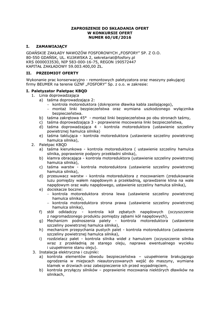 ZAPROSZENIE DO SKŁADANIA OFERT W KONKURSIE OFERT NUMER 60/UE/2016 I. ZAMAWIAJĄCY GDAŃSKIE ZAKŁADY NAWOZÓW FOSFOROWYCH „FOSFORY” SP. Z O.O. 80-550 GDAŃSK, UL. KUJAWSKA 2, [email protected] KRS 0000033530, NIP 583-000-16-75, REGON 190572447 KAPITAŁ ZAKŁADOWY 59.003.400,00 ZŁ. II. PRZEDMIOT OFERTY Wykonanie prac konserwacyjno - remontowych paletyzatora oraz maszyny pakującej firmy BEUMER na terenie GZNF „FOSFORY” Sp. z o.o. w zakresie: I. Paletyzator Paletpac KBQD 1. Linia doprowadzająca a) taśma doprowadzająca 2: kontrola motoreduktora (dokręcenie dławika kabla zasilającego), montaż linki bezpieczeństwa oraz wymiana uszkodzonego wyłącznika bezpieczeństwa. b) taśma zakrętowa 45° - montaż linki bezpieczeństwa po obu stronach taśmy, c) taśma doprowadzająca 3 - poprawienie mocowania linki bezpieczeństwa, d) taśma doprowadzająca 4 - kontrola motoreduktora (ustawienie szczeliny powietrznej hamulca silnika) e) taśma taktująca - kontrola motoreduktora (ustawienie szczeliny powietrznej hamulca silnika), 2. Paletpac KBQD a) taśma kierunkowa - kontrola motoreduktora ( ustawienie szczeliny hamulca silnika, poprawienie podpory przekładni silnika), b) klamra obracająca - kontrola motoreduktora (ustawienie szczeliny powietrznej hamulca silnika), c) taśma warstw - kontrola motoreduktora (ustawienie szczeliny powietrznej hamulca silnika), d) przesuwacz warstw - kontrola motoreduktora z mocowaniem (zredukowanie luzu pomiędzy wałem napędowym a przekładnią, sprawdzenie klina na wale napędowym oraz wału napędowego, ustawienie szczeliny hamulca silnika), e) dociskacze boczne: kontrola motoreduktora strona lewa (ustawienie szczeliny powietrznej hamulca silnika), kontrola motoreduktora strona prawa (ustawienie szczeliny powietrznej hamulca silnika), f) stół odkładczy - kontrola kół zębatych napędowych (oczyszczenie z nagromadzonego produktu pomiędzy zębami kół napędowych), g) Mechanizm podnoszenia palety - kontrola motoreduktora (ustawienie szczeliny powietrznej hamulca silnika), h) mechanizm przepychania pustych palet - kontrola motoreduktora (ustawienie szczeliny powietrznej hamulca silnika), i) rozdzielacz palet - kontrola silnika wideł z hamulcem (oczyszczenie silnika wraz z przekładnią ze starego oleju, naprawa ewentualnego wycieku i uzupełnienie stanu oleju). 3. Instalacja elektryczna i czujniki: a) kontrola elementów obwodu bezpieczeństwa – uzupełnienie brakującego ogrodzenia w miejscach nieautoryzowanych wejść do maszyny, wymiana klamek w drzwiach oraz zabezpieczenie ich przed wypadnięciem, b) kontrola przyłączy silników – poprawienie mocowania niektórych dławików na silnikach, c) kontrola hamulców – szczelina wszystkich silników SEW oprócz mechanizmu podnoszenia palety powinna wynosić 0,25 mm, przy silniku podnoszenia palet 0,4 – 0,8 mm, d) kontrola podstawowych styczników – oczyszczenie zabrudzonych styczników, e) uzupełnienie brakujących przyłączeń uziemiających. 4. Sporządzenie i dostarczenie protokołu z wykonanych prac. II. Maszyna pakująca Stretchhood: 1. Mechanizm prowadzenia folii: a) rama mechanizmu podnoszenia - kontrola motoreduktora (ustawienie szczeliny powietrznej hamulca silnika), b) głowice napinające - kontrola motoreduktora ( ustawienie szczeliny powietrznej hamulca wszystkich czterech siników), c) wózek rozwożący z przenośnikiem rolkowym palet SH D799 - kontrola motoreduktora rolek (naprawa wycieku oleju oraz uzupełnienie stanu oleju), d) przenośnik łańcuchowy pod SH kontrola motoreduktora (ustawienie szczeliny powietrznej hamulca silnika), e) Wózek rozwożący: kontrola motoreduktora napędu jazdy (poprawienie mocowania przekaźnika BSR silnika napędu jazdy), wymiana przerwanego kabla uziemiającego w prowadnicy kablowej oraz poprawienie przyłączenia pozostałych kabli uziemiających z uwagi na korozję w miejscach styków. 2. Instalacja elektryczna i czujniki: a) kontrola hamulców – szczelina wszystkich silników SEW, oprócz mechanizmu podnoszenia palety, powinna wynosić 0,25 mm b) kontrola uziemienia – poprawienie lub wymiana przyłącza kabli uziemiających przy wózku rozwożącym z uwagi na korozje w miejscach styku, przymocowanie kabli uziemiających przy przenośniku łańcuchowym pod foliarką c) kontrola szafy sterowniczej – uzupełnienie brakującej dźwigni wyłącznika głównego w szafie sterowniczej d) uzupełnienie brakujących przyłączeń uziemiających. 3. Sporządzenie i dostarczenie protokołu z wykonanych prac. Uwagi: 1. Wszystkie materiały oraz sprzęt do wykonania zakresu prac zapewnia Wykonawca. 2. Wykonawca musi posiadać niezbędną wiedzę, doświadczenie oraz dysponować potencjałem technicznym i kadrą techniczną z niezbędnymi uprawnieniami do wykonania ww. zakresu prac. 3. Prace należy wykonać w zgodnie z DTR producenta oraz w oparciu o protokół inspekcyjny. 4. Protokół z wykonanych prac należy wykonać w trzech egzemplarzach w wersji papierowej oraz elektronicznej na płycie CD (ew. rysunki w AutoCAD). 5. Wszystkie stosowane materiały i produkty muszą być zgodne z obowiązującymi normami i przepisami oraz posiadać wymagane dopuszczenia oraz certyfikaty. 6. Celem złożenia prawidłowej oferty konieczna jest wizja lokalna na obiekcie. III. INFORMACJE DOTYCZĄCE TERMINU I MIEJSCA SKŁADANIA OFERT Ofertę należy złożyć w zamkniętej kopercie w Kancelarii GZNF „FOSFORY” Sp. z o.o. 80-550 Gdańsk ul. Kujawska 2, budynek biurowca II piętro z dopiskiem "Oferta na wykonanie prac konserwacyjno - remontowych paletyzatora oraz maszyny pakującej firmy BEUMER. Konkurs ofert nr 60/UE/2016". Osobą uprawnioną do kontaktów z oferentami jest Pan Michał Sziming kom. 669 600 606. IV. Termin składania ofert upływa w dniu 29.07.2016 r. Za datę terminowego doręczenia oferty uważa się datę zarejestrowania oferty w Kancelarii GZNF „FOSFORY” Sp. z o.o. Oferty, które wpłyną po tym terminie nie będą rozpatr