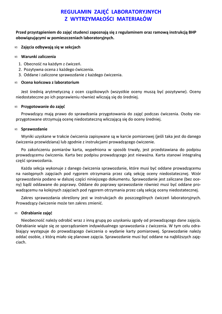 REGULAMIN ZAJĘĆ LABORATORYJNYCH Z WYTRZYMAŁOŚCI MATERIAŁÓW Przed przystąpieniem do zajęć studenci zapoznają się z regulaminem oraz ramową instrukcją BHP obowiązującymi w pomieszczeniach laboratoryjnych. • Zajęcia odbywają się w sekcjach • Warunki zaliczenia 1. Obecność na każdym z ćwiczeń. 2. Pozytywna ocena z każdego ćwiczenia. 3. Oddane i zaliczone sprawozdanie z każdego ćwiczenia. • Ocena końcowa z laboratorium Jest średnią arytmetyczną z ocen cząstkowych (wszystkie oceny muszą być pozytywne). Oceny niedostateczne po ich poprawieniu również wliczają się do średniej. • Przygotowanie do zajęć Prowadzący mają prawo do sprawdzania przygotowania do zajęć podczas ćwiczenia. Osoby nieprzygotowane otrzymują ocenę niedostateczną wliczającą się do oceny średniej. • Sprawozdanie Wyniki uzyskane w trakcie ćwiczenia zapisywane są w karcie pomiarowej (jeśli taka jest do danego ćwiczenia przewidziana) lub zgodnie z instrukcjami prowadzącego ćwiczenie. Po zakończeniu pomiarów karta, wypełniona w sposób trwały, jest przedstawiana do podpisu prowadzącemu ćwiczenia. Karta bez podpisu prowadzącego jest nieważna. Karta stanowi integralną część sprawozdania. Każda sekcja wykonuje z danego ćwiczenia sprawozdanie, które musi być oddane prowadzącemu na następnych zajęciach pod rygorem otrzymania przez całą sekcję oceny niedostatecznej. Wzór sprawozdania podano w dalszej części niniejszego dokumentu. Sprawozdanie jest zaliczane (bez oceny) bądź oddawane do poprawy. Oddane do poprawy sprawozdanie również musi być oddane prowadzącemu na kolejnych zajęciach pod rygorem otrzymania przez całą sekcję oceny niedostatecznej. Zakres sprawozdania określony jest w instrukcjach do poszczególnych ćwiczeń laboratoryjnych. Prowadzący ćwiczenie może ten zakres zmienić. • Odrabianie zajęć Nieobecność należy odrobić wraz z inną grupą po uzyskaniu zgody od prowadzącego dane zajęcia. Odrabianie wiąże się ze sporządzaniem indywidualnego sprawozdania z ćwiczenia. W tym celu odrabiający występuje do prowadzącego ćwiczenia o wydanie karty pomiarowej. Sprawozdanie należy oddać osobie, z którą miało się planowe zajęcia. Sprawozdanie musi być oddane na najbliższych zajęciach. RAMOWA INSTRUKCJA BHP DLA PRACOWNI I POMIESZCZEŃ LABORATORYJNYCH IMIO 1. Prawo do samodzielnego korzystania z pomieszczenia laboratoryjnego i znajdujących się w nim urządzeń mają wyłącznie pracownicy Instytutu Mechaniki i Inżynierii Obliczeniowej (IMIO) za zgodą Kierownika Laboratorium. 2. Właściwa organizacja pracy w laboratorium zobowiązuje do każdorazowego określenia osób odpowiedzialnych za daną pracę. W każdym przypadku praca i zajęcia powinny być nadzorowane. 3. Osoby nie będące pracownikami IMIO mogą korzystać z laboratorium wyłącznie w obecności co najmniej jednej osoby upoważnionej (według punktu 1). 4. Prace wymagające wykorzystania wyposażenia laboratorium mogą być prowadzone przez osoby spoza IMIO po wysłuchaniu instruktażu w zakresie BHP przeprowadzonego przez Kierownika Laboratorium lub osobę przez niego wyznaczoną. 5. Fakt wysłuchania instruktażu BHP powinien być potwierdzony podpisem osoby instruowanej. 6. W razie wypadku należy: • udzielić pierwszej pomocy, korzystając z apteczki znajdującej się w laboratorium; • zawiadomić o wypadku: Kierownika Laboratorium, Dyrektora IMIO a w poważniejszych przypadkach inspektorat BHP uczelni. 7. Osoby korzystające z urządzeń mogących zagrażać zdrowiu obowiązane są do korzystania z indywidualnych środków ochronnych (odzież ochronna, okulary ochronne, itp.). 8. W pracowni obowiązuje nakaz utrzymywania czystości i porządku. Wszystkie narzędzia i przedmioty wykorzystywane do pracy powinny znajdować się w wyznaczonych miejscach. 9. Przed opuszczeniem laboratorium należy sprawdzić, czy nie pozostały w nim źródła zagrożeń, np.: nie wyłączone zasilanie urządzeń, otwarty ogień, nie zakręcone krany, itp. 10. Jeżeli osoba korzystająca z wyposażenia laboratorium stwierdziła, że w znajdujących się w nim urządzeniach wystąpiły objawy wskazujące na możliwość awarii (np. nadmierne nagrzewanie, iskrzenie, zapach spalenizny), powinna ona niezwłocznie powiadomić o tym Kierownika Laboratorium. Kierownik Laboratorium dr hab. inż. Antoni JOHN, prof. Pol. Śl. ZESTAW ĆWICZEŃ LABORATORYJNYCH Z WYTRZYMAŁOŚCI MATERIAŁÓW dla studiów niestacjonarnych, rok ak. 2015/16 1. Analiza stanu naprężenia metodą elastooptyczną. 2. Skręcanie prętów o przekroju kołowym. 3. Zginanie ukośne. 4. Próby udarowe. 5. Wyznaczanie środka ścinania w prętach o przekrojach niesymetrycznych. 6. Badanie prętów na wyboczenie. HARMONOGRAM ZAJĘĆ AiR oraz MiBM: TYDZIEŃ 1 2 3 4 6 5 7 8 9 10 Sekcja 1 Sekcja 2 Zajęcia wprowadzające ćw. 1 ćw. 2 ćw. 2 ćw. 1 ćw. 3 ćw. 4 Kolokwium 1 ćw. 4 ćw. 3 ćw. 5 ćw. 6 ćw. 6 ćw. 5 Kolokwium 2 Kolokwium poprawkowe ZiIP: TYDZIEŃ 1 2 3 4 Sekcja 1 wprowadzenie i ćw. 4 ćw. 1 ćw. 2 ćw. 3 Instytut Mechaniki i Inżynierii Obliczeniowej Wydział Mechaniczny Technologiczny Politechnika Śląska w Gliwicach LABORATORIUM Z WYTRZYMAŁOŚCI MATERIAŁÓW SPRAWOZDANIE TEMAT ĆWICZENIA Kierunek: ……..…………..…..….. Grupa: ……….…………..…..…… Semestr: ……….…………...….….. Rok akademicki: ……………....…. Nr sekcji: …………..……….…….. Skład osobowy sekcji: 1. 2. 3. ……………………………………….. ………………………...……….…….. …………………….……………...….. ... Gliwice, rok 1. Cel ćwiczenia Pierwszy rozdział sprawozdania zawiera cel ćwiczenia. Jest on podany na początku odpowiedniej instrukcji do danego ćwiczenia laboratoryjnego. Celem niniejszego opracowania jest zaprezentowanie podstawowych zasad dotyczących redakcji tekstów technicznych, w szczególno