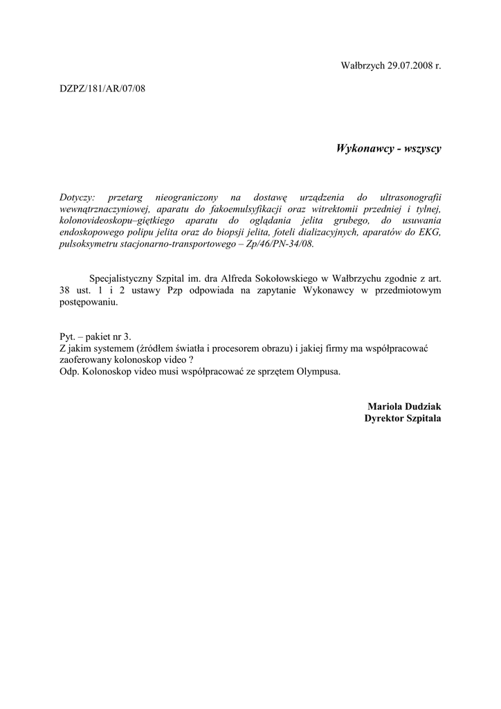 Wałbrzych 29.07.2008 r. DZPZ/181/AR/07/08 Wykonawcy - wszyscy Dotyczy: przetarg nieograniczony na dostawę urządzenia do ultrasonografii wewnątrznaczyniowej, aparatu do fakoemulsyfikacji oraz witrektomii przedniej i tylnej, kolonovideoskopu–giętkiego aparatu do oglądania jelita grubego, do usuwania endoskopowego polipu jelita oraz do biopsji jelita, foteli dializacyjnych, aparatów do EKG, pulsoksymetru stacjonarno-transportowego – Zp/46/PN-34/08. Specjalistyczny Szpital im. dra Alfreda Sokołowskiego w Wałbrzychu zgodnie z art. 38 ust. 1 i 2 ustawy Pzp odpowiada na zapytanie Wykonawcy w przedmiotowym postępowaniu. Pyt. – pakiet nr 3. Z jakim systemem (źródłem światła i procesorem obrazu) i jakiej firmy ma współpracować zaoferowany kolonoskop video ? Odp. Kolonoskop video musi współpracować ze sprzętem Olympusa. Mariola Dudziak Dyrektor Szpitala