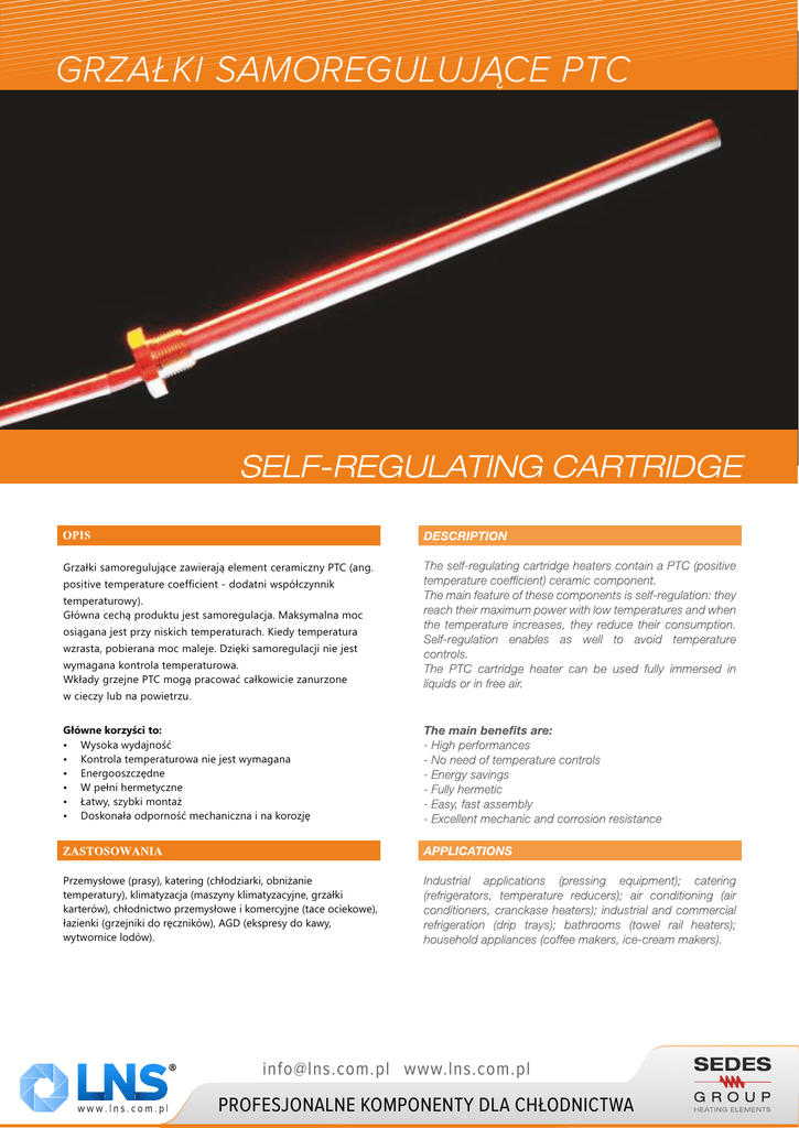 GRZAŁKI SAMOREGULUJĄCE PTC Grzałki samoregulujące zawierają element ceramiczny PTC (ang. positive temperature coefficient - dodatni współczynnik temperaturowy). Główna cechą produktu jest samoregulacja. Maksymalna moc osiągana jest przy niskich temperaturach. Kiedy temperatura wzrasta, pobierana moc maleje. Dzięki samoregulacji nie jest wymagana kontrola temperaturowa. Wkłady grzejne PTC mogą pracować całkowicie zanurzone w cieczy lub na powietrzu. Główne korzyści to: ź Wysoka wydajność ź Kontrola temperaturowa nie jest wymagana ź Energooszczędne ź W pełni hermetyczne ź Łatwy, szybki montaż ź Doskonała odporność mechaniczna i na korozję Przemysłowe (prasy), katering (chłodziarki, obniżanie temperatury), klimatyzacja (maszyny klimatyzacyjne, grzałki karterów), chłodnictwo przemysłowe i komercyjne (tace ociekowe), łazienki (grzejniki do ręczników), AGD (ekspresy do kawy, wytwornice lodów). [email protected] www.lns.com.pl PROFESJONALNE KOMPONENTY DLA CHŁODNICTWA GRZAŁKI SAMOREGULUJĄCE PTC LNS Sp. z o.o. ul. Żernicka 9, 55-010, Święta Katarzyna tel: +48 71 716 44 50 fax: +48 71 716 44 51 e-mail: [email protected] KRS 0000476413; NIP 8961535367; REGON 022250607