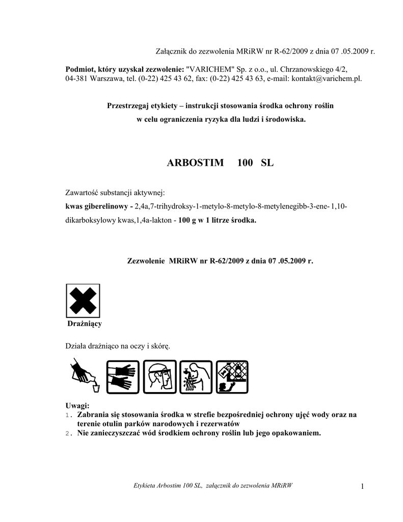 Załącznik do zezwolenia MRiRW nr R-62/2009 z dnia 07 .05.2009 r. Podmiot, który uzyskał zezwolenie: "VARICHEM" Sp. z o.o., ul. Chrzanowskiego 4/2, 04-381 Warszawa, tel. (0-22) 425 43 62, fax: (0-22) 425 43 63, e-mail: [email protected]. Przestrzegaj etykiety – instrukcji stosowania środka ochrony roślin w celu ograniczenia ryzyka dla ludzi i środowiska. ARBOSTIM 100 SL Zawartość substancji aktywnej: kwas giberelinowy - 2,4a,7-trihydroksy-1-metylo-8-metylo-8-metylenegibb-3-ene- 1,10dikarboksylowy kwas,1,4a-lakton - 100 g w 1 litrze środka. Zezwolenie MRiRW nr R-62/2009 z dnia 07 .05.2009 r. Drażniący Działa drażniąco na oczy i skórę. Uwagi: 1. Zabrania się stosowania środka w strefie bezpośredniej ochrony ujęć wody oraz na terenie otulin parków narodowych i rezerwatów 2. Nie zanieczyszczać wód środkiem ochrony roślin lub jego opakowaniem. Etykieta Arbostim 100 SL, załącznik do zezwolenia MRiRW 1 I OPIS DZIAŁANIA Arbostim 100 SL jest środkiem z grupy regulatorów wzrostu i rozwoju roślin w formie koncentratu rozpuszczalnego w wodzie, przeznaczony do pobudzania wzrostu materiału szkółkarskiego. II ZAKRES STOSOWANIA, TERMINY I DAWKI DRZEWKA ZIARNKOWE Pobudzanie wzrostu materiału szkółkarskiego. Zalecana dawka na jeden zabieg: 0,5 l lub 1,0 l środka w 180 do 200 l wody. Maksymalna jednorazowa dawka: 1,0 l/ha. Zabieg wykonać: a) jednorazowo stosując 1 l środka w 180 – 200 l wody na 1 ha szkółki, b) lub dwukrotnie, co 2 tygodnie, stosując na każdy zabieg 0,5 l środka w 180 -200 l wody na 1 ha szkółki. Środek stosować od połowy maja do końca lipca, najlepiej w początkowym okresie wegetacji. W celu pobudzenie wzrostu roślin dokładnie opryskać cieczą użytkową wierzchołki, liście i pędy drzewek. Wskazane jest dolistne nawożenie roślin po 7 dniach od zastosowania środka. III UWAGI: 1. Środka nie stosować - w temperaturze powietrza powyżej 22oC - podczas pełnego nasłonecznienia - w czasie suszy i nie później niż na dwie godziny przed spodziewanym deszczem 2. Do sporządzania cieczy użytkowej nie używać wody alkalicznej i twardej. IV OKRES KARENCJI okres od dnia ostatniego zabiegu do dnia zbioru roślin przeznaczonych do konsumpcji NIE DOTYCZY V OKRES PREWENCJI DLA LUDZI, PSZCZÓŁ, ZWIERZĄT okres zapobiegający zatruciu NIE DOTYCZY VI SPORZĄDZANIE CIECZY UŻYTKOWEJ Przed przystąpieniem do sporządzania cieczy użytkowej dokładnie ustalić potrzebną jej ilość. Odmierzoną ilość środka wlać do zbiornika opryskiwacza napełnionego częściowo wodą (z włączonym mieszadłem), uzupełnić wodą do potrzebnej ilości i dokładnie wymieszać. Etykieta Arbostim 100 SL, załącznik do zezwolenia MRiRW 2 Opróżnione opakowania przepłukać trzykrotnie wodą, a popłuczyny wlać do zbiornika opryskiwacza z cieczą użytkową. Po pracy aparaturę dokładnie wymyć. VII PRZECHOWYWANIE Chronić przed dziećmi. Nie przechowywać razem z żywnością, napojami i paszami dla zwierząt. Przechowywać wyłącznie w oryginalnym opakowaniu, w temperaturze nie niższej niż 0oC i nie wyższej niż 30oC. VIII WARUNKI BEZPIECZNEGO STOSOWANIA ŚRODKA Nie jeść i nie pić oraz nie palić tytoniu podczas stosowania produktu. Unikać zanieczyszczenia skóry i oczu. Nosić odpowiednią odzież ochronną, odpowiednie rękawice ochronne i okulary lub ochronę twarzy. W razie połknięcia niezwłocznie zasięgnij porady lekarza, pokaż opakowanie lub etykietę Resztki cieczy użytkowej rozcieńczyć wodą i wypryskać na powierzchni poprzednio opryskiwanej. Wodę użytą do mycia aparatury wypryskać na powierzchni uprzednio opryskiwanej, stosując te same środki ochrony osobistej. Opróżnione opakowania traktować jako odpady komunalne. Zabrania się spalania opakowań po środku ochrony roślin we własnym zakresie. UWAGA! ZABRANIA SIĘ WYKORZYSTYWANIA OPRÓŻNIONYCH OPAKOWAŃ PO ŚRODKACH OCHRONY ROŚLIN DO INNYCH CELÓW, W TYM TAKŻE TRAKTOWANIA ICH JAKO SUROWCE WTÓRNE. IX ANTIDOTUM BRAK, STOSOWAĆ LECZENIE OBJAWOWE X POMOC MEDYCZNA W zaistniałych sytuacjach, kiedy wymagana jest lub konieczna inna pomoc medyczna niż ujęta w wyżej wymienionych ostrzeżeniach skontaktować się z najbliższym ośrodkiem toksykologicznym: Gdańsk – (0-58) 682-04-04 Kraków – (0-12) 411-99-99 Lublin – (0-81) 740-89-83 Łódź – (0-42) 657-99-00 Poznań – (0-61) 847-69-46 Rzeszów –(0-17) 866-40-25 Sosnowiec –(0-32) 266-11-45 Tarnów –(0-14) 631-54-09 Warszawa –(0-22) 619-66-54 Wrocław – (0-71) 343 30 08 Etykieta Arbostim 100 SL, załącznik do zezwolenia MRiRW 3 Okres ważności – 2 lata Data produkcji -…........ Zawartość netto - ......... Nr partii - ..................... Etykieta Arbostim 100 SL, załącznik do zezwolenia MRiRW 4