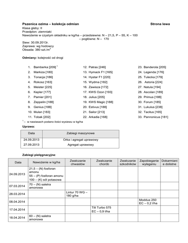 Pszenica ozima – kolekcja odmian Strona lewa Klasa gleby: II Przedplon: ziemniaki Nawożenie w czystym składniku w kg/ha – przedsiewne: N – 21,5, P – 55, K – 100 – pogłówne: N – 170 Siew: 30.09.2013r. Zaprawa: wg hodowcy 2 Obsada: 380 szt./m Odmiany: kolejność od drogi 1. Bamberka [209] 1 1 12. Patras [246] 23. Banderola [205] 2. Markiza [180] 13. Hymack F1 [165] 24. Legenda [176] 3. Tonacja [186] 14. Hystar F1 [220] 25. Tulecka [179] 4. Rokosz [163] 15. Wydma [182] 26. Astoria [224] 5. Meister [225] 16. Zawisza [172] 27. Natula [194] 6. Kepler [177] 17. KWS Ozon [193] 28. Ascolan [189] 7. Pamier [201] 18. Julius [205] 29. Primus [188] 8. Zeppelin [188] 19. KWS Magic [188] 30. Forum [185] 9. Genius [188] 20. Estivus [188] 31. Lukulus [238] 10. Mulan [183] 21. Sailor [213] 32. Tacitus [165] 11. Tobak [202] 22. Arkadia [168] 33. Pannonicus [181] – w nawiasach podano ilości wysiewu w kg/ha Uprawa: Data Zabiegi maszynowe 24.09.2013 Orka i agregat uprawowy 27.09.2013 Agregat uprawowy Zabiegi pielęgnacyjne: Data Nawożenie w kg/ha 24.09.2013 21,5 – (N) fosforan amonu 55 – (P) fosforan amonu 100 – (K) sól potasowa 07.03.2014 70 – (N) saletra amonowa Zwalczanie chwastów Zwalczanie chorób Zapobieganie Dokarmiani wyleganiu e dolistne Lintur 70 WG – 180 g/ha 28.03.2014 Moddus 250 EC – 0,2 l/ha 08.04.2014 Tilt Turbo 575 EC – 0,9 l/ha 17.04.2014 18.04.2014 Zwalczanie szkodników 60 – (N) saletra amonowa Moddus 250 EC – 0,3 l/ha 12.05.2014 20.05.2014 40 – (N) saletra amonowa 21.05.2014 Menara 410 EC – 0,4 l/ha + Olympus 480 SC – 1,8 l/ha 11.06.2014 Prosaro 250 EC – 1 l/ha Decis Mega 50 EW – 0,125 l/ha Wzorzec dt/ha 1 Astoria a1 a2 73,5 86,0 100 99 7,3 3 88 Choroby podstawy źdźbła Fuzarioza kłosów Septorioza plew Septorioza liści Brunatna plamistość liści Rdza brunatna Mączniak prawdziwy Reakcja na Al+++ 0 skala 9 Plon % wzorca lata 2010-2012 Wysokość roślin cm Odmiana Wyleganie 0 skala 9 Lp. Mrozoodporność 0 skala 9 PSZENICA OZIMA – charakterystyka odmian wg „Listy opisowej odmian COBORU 2013” 0 odporność na choroby -skala 9 7,4 7,1 7,7 6,7 7,1 7,8 8,0 Elitarna (grupa E) 7,2 95 6,8 5 7,2 7,7 6,9 7,0 7,8 8,1 7,4 7,5 7,3 7,8 6 7,1 6,9 7,3 7,8 7,8 7,8 7,9 Jakościowe (grupa A ) 2 10,12 10,12 3 Arkadia Askolan 100 99 5 Bamberka 100 99 6 101 7 Estivus Kepler 8 Legenda 9 Natula 105 10 Patras 11 12 109 2,5 6,8 7,9 96 84 5 6,2 7,4 3 7,1 89 5 7,6 7,0 7,6 6,7 7,1 7,7 7,9 100 2,5 100 2,5 87 81 5 100 8,3 8,2 5 7,8 7,8 7,6 7,7 7,9 8,0 6,6 7,4 7,3 7,3 7,8 8,0 7,9 8,2 105 105 6 6,6 109 5 7,6 7,0 7,7 7,0 7,9 8,1 8,1 102 4,5 7,0 98 5 7,7 7,1 7,5 6,5 7,3 7,9 8,0 109 107 4 7,2 86 5 7,7 6,9 7,9 6,7 7,1 7,8 8,2 Sailor 108 108 5,5 101 101 5,5 95 97 5 5 7,4 6,3 6,6 6,4 7,6 7,7 6,4 6,7 7,2 7,4 7,9 7,4 8,2 8,1 13 Tonacja Tulecka 6,8 7,5 103 103 2,5 7,0 96 5 6,8 7,3 8,2 7,0 7,3 8,0 8,1 14 Wydma 97 96 6,0 7,4 6,0 6,9 7,6 7,8 38 Banderola 102 101 7,6 7,4 6,5 6,6 7,5 8,1 39 Forum 101 101 7,3 90 6,8 5 Chlebowe (grupa B) 7,6 2,5 6,9 82 5 7,9 81 7,2 2 6 7,4 7,8 7,1 7,1 7,8 8,2 40 KWS Magic 104 103 1,5 7,9 82 5 7,7 8,2 8,1 7,4 7,2 7,7 7,9 41 KWS Ozon 108 108 4 7,5 80 5 7,8 7,4 7,3 6,4 6,8 7,4 7,9 42 Meister 1,5 7,8 88 5 7,2 7,2 7,9 7,1 7,0 8,1 8,4 98 111 96 6 5 4 43 Mulan 7,0 90 7,2 7,1 7,7 6,7 7,0 8,0 8,0 106 104 3 5 Wzorzec: 2012 i 2011 – Bockris, Figura, KWS Ozon, Muszelka; 2010 – Figura, Tonacja, Bogatka, Muszelka 10,12 – średnia plonu z roku 2010 i 2012 Plony: Nr poletka Nazwa Plon dt/ha (14%) 1 Askolan 101,69 2 Natula 101,19 3 Arkadia 100,05 4 Kepler 99,59 5 Legenda 97,67 6 Tulecka 95,79 7 Zeppelin 94,94 8 Sailor 94,39 9 KWS Magic 93,24 10 Astoria 93,19 11 Pannonicus 92,10 12 Pamier 92,06 13 Hymack F1 91,25 14 Genius 90,53 15 KWS Ozon 90,38 16 Hystar F1 90,31 17 Banderola 89,50 18 Patras 89,17 19 Mulan 89,08 20 Markiza 88,59 21 Tacitus 88,22 22 Tonacja 87,74 23 Julius 87,27 24 Esticus 86,54 25 Lukullus 84,61 26 Meister 80,06 27 Tobak 79,58 28 Zawisza 78,36 29 Rokosz 73,38 30 Wydma 67,81 31 Primus 66,62 32 Forum 65,51 33 Bamberka 65,38