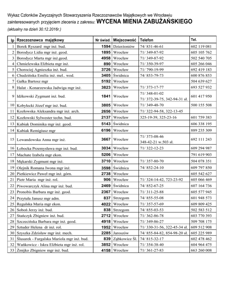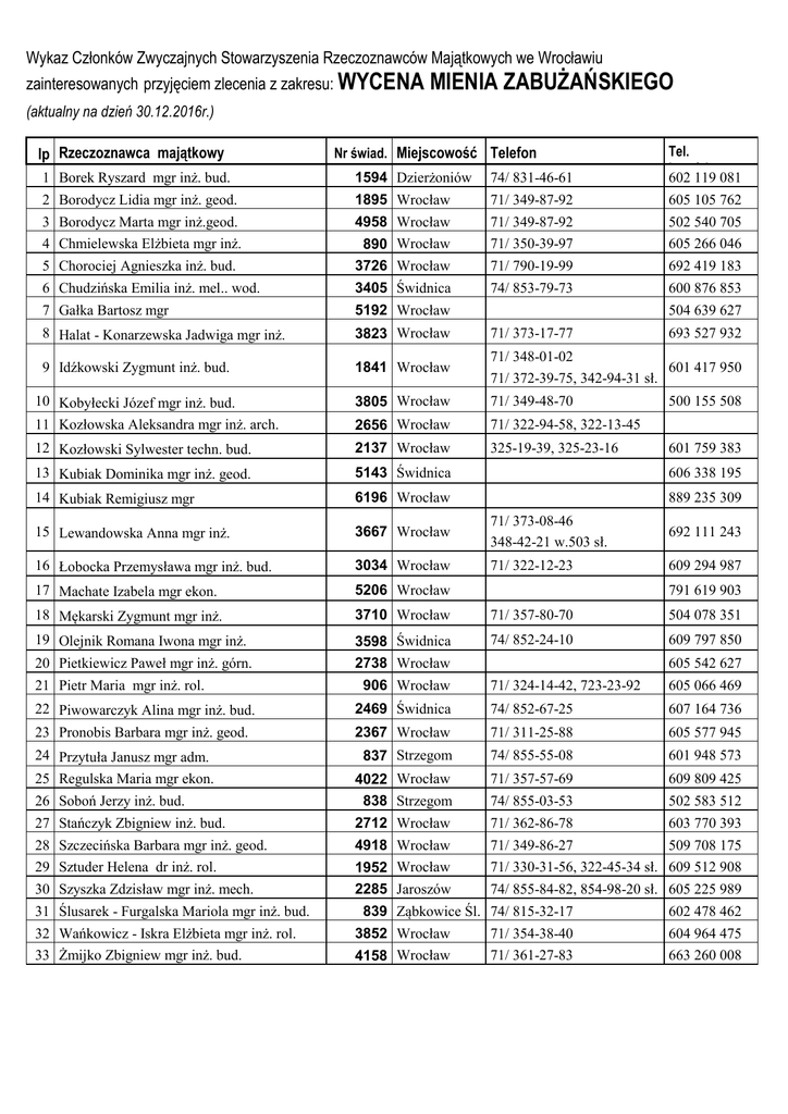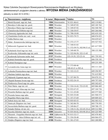 Wykaz Członków Zwyczajnych Stowarzyszenia Rzeczoznawców Majątkowych we Wrocławiu zainteresowanych przyjęciem zlecenia z zakresu: WYCENA MIENIA ZABUŻAŃSKIEGO (aktualny na dzień 30.12.2016r.) 1 Borek Ryszard mgr inż. bud. 1594 Dzierżoniów 74/ 831-46-61 Tel. komórkowy 602 119 081 2 Borodycz Lidia mgr inż. geod. 1895 Wrocław 71/ 349-87-92 605 105 762 3 Borodycz Marta mgr inż.geod. 71/ 349-87-92 502 540 705 4 Chmielewska Elżbieta mgr inż. 4958 Wrocław 890 Wrocław 71/ 350-39-97 605 266 046 5 Chorociej Agnieszka inż. bud. 3726 Wrocław 71/ 790-19-99 692 419 183 6 Chudzińska Emilia inż. mel.. wod. 3405 Świdnica 74/ 853-79-73 600 876 853 7 Gałka Bartosz mgr 5192 Wrocław 8 Halat - Konarzewska Jadwiga mgr inż. 3823 Wrocław 71/ 373-17-77 9 Idźkowski Zygmunt inż. bud. 1841 Wrocław 71/ 348-01-02 601 417 950 71/ 372-39-75, 342-94-31 sł. 10 Kobyłecki Józef mgr inż. bud. 3805 Wrocław 71/ 349-48-70 11 Kozłowska Aleksandra mgr inż. arch. 2656 Wrocław 71/ 322-94-58, 322-13-45 12 Kozłowski Sylwester techn. bud. 2137 Wrocław 325-19-39, 325-23-16 13 Kubiak Dominika mgr inż. geod. 5143 Świdnica 606 338 195 14 Kubiak Remigiusz mgr 6196 Wrocław 889 235 309 15 Lewandowska Anna mgr inż. 3667 Wrocław 71/ 373-08-46 348-42-21 w.503 sł. 692 111 243 16 Łobocka Przemysława mgr inż. bud. 3034 Wrocław 71/ 322-12-23 609 294 987 17 Machate Izabela mgr ekon. 5206 Wrocław 18 Mękarski Zygmunt mgr inż. 3710 Wrocław 71/ 357-80-70 504 078 351 19 Olejnik Romana Iwona mgr inż. 3598 Świdnica 2738 Wrocław 74/ 852-24-10 609 797 850 lp Rzeczoznawca majątkowy 20 Pietkiewicz Paweł mgr inż. górn. 21 Pietr Maria mgr inż. rol. Nr świad. Miejscowość Telefon 906 Wrocław 504 639 627 693 527 932 500 155 508 601 759 383 791 619 903 605 542 627 71/ 324-14-42, 723-23-92 605 066 469 22 Piwowarczyk Alina mgr inż. bud. 2469 Świdnica 74/ 852-67-25 607 164 736 23 Pronobis Barbara mgr inż. geod. 2367 Wrocław 71/ 311-25-88 605 577 945 24 Przytuła Janusz mgr adm. 837 Strzegom 74/ 855-55-08 601 948 573 25 Regulska Maria mgr ekon. 4022 Wrocław 838 Strzegom 71/ 357-57-69 609 809 425 74/ 855-03-53 502 583 512 71/ 362-86-78 603 770 393 28 Szczecińska Barbara mgr inż. geod. 2712 Wrocław 4918 Wrocław 71/ 349-86-27 509 708 175 29 Sztuder Helena dr inż. rol. 1952 Wrocław 71/ 330-31-56, 322-45-34 sł. 609 512 908 30 Szyszka Zdzisław mgr inż. mech. 31 Ślusarek - Furgalska Mariola mgr inż. bud. 74/ 855-84-82, 854-98-20 sł. 605 225 989 2285 Jaroszów 602 478 462 839 Ząbkowice Śl. 74/ 815-32-17 32 Wańkowicz - Iskra Elżbieta mgr inż. rol. 3852 Wrocław 71/ 354-38-40 604 964 475 33 Żmijko Zbigniew mgr inż. bud. 4158 Wrocław 71/ 361-27-83 663 260 008 26 Soboń Jerzy inż. bud. 27 Stańczyk Zbigniew inż. bud.