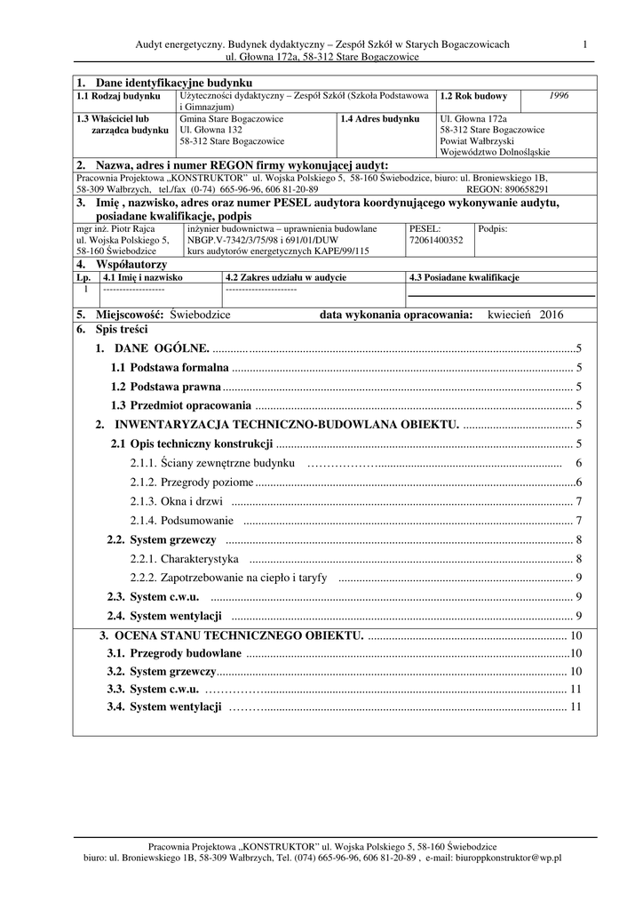 1. Dane identyfikacyjne budynku 2. Nazwa, adres i numer REGON