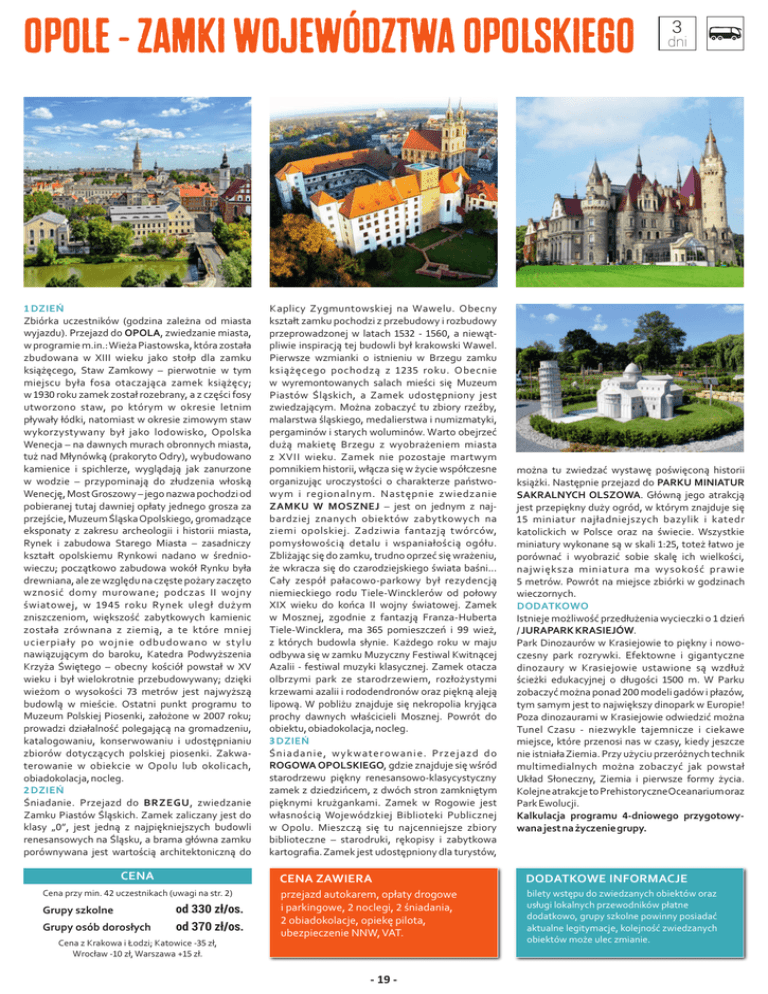 OPOLE - ZAMKI WOJEWÓDZTWA OPOLSKIEGO 1 DZIEŃ Zbiórka uczestników (godzina zależna od miasta wyjazdu). Przejazd do OPOLA, zwiedzanie miasta, w programie m.in.: Wieża Piastowska, która została zbudowana w XIII wieku jako stołp dla zamku książęcego, Staw Zamkowy – pierwotnie w tym miejscu była fosa otaczająca zamek książęcy; w 1930 roku zamek został rozebrany, a z części fosy utworzono staw, po którym w okresie letnim pływały łódki, natomiast w okresie zimowym staw wykorzystywany był jako lodowisko, Opolska Wenecja – na dawnych murach obronnych miasta, tuż nad Młynówką (prakoryto Odry), wybudowano kamienice i spichlerze, wyglądają jak zanurzone w wodzie – przypominają do złudzenia włoską Wenecję, Most Groszowy – jego nazwa pochodzi od pobieranej tutaj dawniej opłaty jednego grosza za przejście, Muzeum Śląska Opolskiego, gromadzące eksponaty z zakresu archeologii i historii miasta, Rynek i zabudowa Starego Miasta – zasadniczy kształt opolskiemu Rynkowi nadano w średniowieczu; początkowo zabudowa wokół Rynku była drewniana, ale ze względu na częste pożary zaczęto wznosić domy murowane; podczas II wojny światowej, w 1945 roku Rynek uległ dużym zniszczeniom, większość zabytkowych kamienic została zrównana z ziemią, a te które mniej ucierpiały po wojnie odbudowano w stylu nawiązującym do baroku, Katedra Podwyższenia Krzyża Świętego – obecny kościół powstał w XV wieku i był wielokrotnie przebudowywany; dzięki wieżom o wysokości 73 metrów jest najwyższą budowlą w mieście. Ostatni punkt programu to Muzeum Polskiej Piosenki, założone w 2007 roku; prowadzi działalność polegającą na gromadzeniu, katalogowaniu, konserwowaniu i udostępnianiu zbiorów dotyczących polskiej piosenki. Zakwaterowanie w obiekcie w Opolu lub okolicach, obiadokolacja, nocleg. 2 DZIEŃ Śniadanie. Przejazd do BRZEGU, zwiedzanie Zamku Piastów Śląskich. Zamek zaliczany jest do klasy „0”, jest jedną z najpiękniejszych budowli renesansowych na Śląsku, a brama główna zamku porównywana jest wartością architektoniczną do CENA Cena przy min. 42 uczestnikach (uwagi na str. 2) Grupy szkolne Grupy osób dorosłych od 330 zł/os. od 370 zł/os. Cena z Krakowa i Łodzi; Katowice -35 zł, Wrocław -10 zł, Warszawa +15 zł. Kaplicy Zygmuntowskiej na Wawelu. Obecny kształt zamku pochodzi z przebudowy i rozbudowy przeprowadzonej w latach 1532 - 1560, a niewątpliwie inspiracją tej budowli był krakowski Wawel. Pierwsze wzmianki o istnieniu w Brzegu zamku książęcego pochodzą z 1235 roku. Obecnie w wyremontowanych salach mieści się Muzeum Piastów Śląskich, a Zamek udostępniony jest zwiedzającym. Można zobaczyć tu zbiory rzeźby, malarstwa śląskiego, medalierstwa i numizmatyki, pergaminów i starych woluminów. Warto obejrzeć dużą makietę Brzegu z wyobrażeniem miasta z XVII wieku. Zamek nie pozostaje martwym pomnikiem historii, włącza się w życie współczesne organizując uroczystości o charakterze państwowym i regionalnym. Następnie zwiedzanie ZAMKU W MOSZNEJ – jest on jednym z najbardziej znanych obiektów zabytkowych na ziemi opolskiej. Zadziwia fantazją twórców, pomysłowością detalu i wspaniałością ogółu. Zbliżając się do zamku, trudno oprzeć się wrażeniu, że wkracza się do czarodziejskiego świata baśni... Cały zespół pałacowo-parkowy był rezydencją niemieckiego rodu Tiele-Wincklerów od połowy XIX wieku do końca II wojny światowej. Zamek w Mosznej, zgodnie z fantazją Franza-Huberta Tiele-Wincklera, ma 365 pomieszczeń i 99 wież, z których budowla słynie. Każdego roku w maju odbywa się w zamku Muzyczny Festiwal Kwitnącej Azalii - festiwal muzyki klasycznej. Zamek otacza olbrzymi park ze starodrzewiem, rozłożystymi krzewami azalii i rododendronów oraz piękną aleją lipową. W pobliżu znajduje się nekropolia kryjąca prochy dawnych właścicieli Mosznej. Powrót do obiektu, obiadokolacja, nocleg. 3 DZIEŃ Śniadanie, wykwaterowanie. Przejazd do ROGOWA OPOLSKIEGO, gdzie znajduje się wśród starodrzewu piękny renesansowo-klasycystyczny zamek z dziedzińcem, z dwóch stron zamkniętym pięknymi krużgankami. Zamek w Rogowie jest własnością Wojewódzkiej Biblioteki Publicznej w Opolu. Mieszczą się tu najcenniejsze zbiory biblioteczne – starodruki, rękopisy i zabytkowa kartografia. Zamek jest udostępniony dla turystów, 3 dni można tu zwiedzać wystawę poświęconą historii książki. Następnie przejazd do PARKU MINIATUR SAKRALNYCH OLSZOWA. Główną jego atrakcją jest przepiękny duży ogród, w którym znajduje się 15 miniatur najładniejszych bazylik i katedr katolickich w Polsce oraz na świecie. Wszystkie miniatury wykonane są w skali 1:25, toteż łatwo je porównać i wyobrazić sobie skalę ich wielkości, największa miniatura ma wysokość prawie 5 metrów. Powrót na miejsce zbiórki w godzinach wieczornych. DODATKOWO Istnieje możliwość przedłużenia wycieczki o 1 dzień / JURAPARK KRASIEJÓW. Park Dinozaurów w Krasiejowie to piękny i nowoczesny park rozrywki. Efektowne i gigantyczne dinozaury w Krasiejowie ustawione są wzdłuż ścieżki edukacyjnej o długości 1500 m. W Parku zobaczyć można ponad 200 modeli gadów i płazów, tym samym jest to największy dinopark w Europie! Poza dinozaurami w Krasiejowie odwiedzić można Tunel Czasu - niezwykle tajemnicze i ciekawe miejsce, które przenosi nas w czasy, kiedy jeszcze nie istniała Ziemia. Przy użyciu przeróżnych technik multimedialnych można zobaczyć jak powstał Układ Słoneczny, Ziemia i pierwsze formy życia. Kolejne atrakcje to PrehistoryczneOceanarium oraz Park Ewolucji. Kalkulacja programu 4-dniowego przygotowywana jest na życzenie grupy. DODATKOWE CENA ZAWIERA INFORMACJE DODATKOWE INFORMACJE bilety wstępu do zwiedzanych oraz przejazd autokarem, opłatyobiektów drogowe usługi lokalnych 2przewodników płatne i parkingowe, noclegi, 2 śniadania, doda
