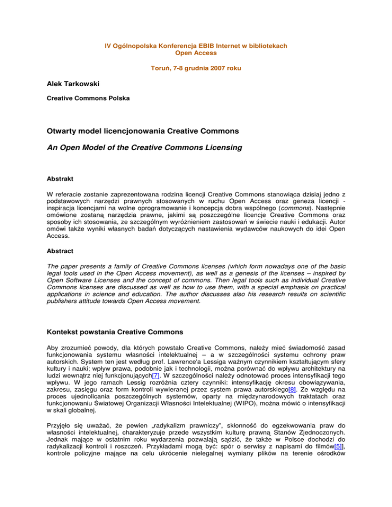 IV Ogólnopolska Konferencja EBIB Internet w bibliotekach Open Access Toruń, 7-8 grudnia 2007 roku Alek Tarkowski Creative Commons Polska Otwarty model licencjonowania Creative Commons An Open Model of the Creative Commons Licensing Abstrakt W referacie zostanie zaprezentowana rodzina licencji Creative Commons stanowiąca dzisiaj jedno z podstawowych narzędzi prawnych stosowanych w ruchu Open Access oraz geneza licencji inspiracja licencjami na wolne oprogramowanie i koncepcja dobra wspólnego (commons). Następnie omówione zostaną narzędzia prawne, jakimi są poszczególne licencje Creative Commons oraz sposoby ich stosowania, ze szczególnym wyróżnieniem zastosowań w świecie nauki i edukacji. Autor omówi także wyniki własnych badań dotyczących nastawienia wydawców naukowych do idei Open Access. Abstract The paper presents a family of Creative Commons licenses (which form nowadays one of the basic legal tools used in the Open Access movement), as well as a genesis of the licenses – inspired by Open Software Licenses and the concept of commons. Then legal tools such as individual Creative Commons licenses are discussed as well as how to use them, with a special emphasis on practical applications in science and education. The author discusses also his research results on scientific publishers attitude towards Open Access movement. Kontekst powstania Creative Commons Aby zrozumieć powody, dla których powstało Creative Commons, należy mieć świadomość zasad funkcjonowania systemu własności intelektualnej – a w szczególności systemu ochrony praw autorskich. System ten jest według prof. Lawrence'a Lessiga ważnym czynnikiem kształtującym sfery kultury i nauki; wpływ prawa, podobnie jak i technologii, można porównać do wpływu architektury na ludzi wewnątrz niej funkcjonujących[7]. W szczególności należy odnotować proces intensyfikacji tego wpływu. W jego ramach Lessig rozróżnia cztery czynniki: intensyfikację okresu obowiązywania, zakresu, zasięgu oraz form kontroli wywieranej przez system prawa autorskiego[8]. Ze względu na proces ujednolicania poszczególnych systemów, oparty na międzynarodowych traktatach oraz funkcjonowaniu Światowej Organizacji Własności Intelektualnej (WIPO), można mówić o intensyfikacji w skali globalnej. Przyjęło się uważać, że pewien „radykalizm prawniczy”, skłonność do egzekwowania praw do własności intelektualnej, charakteryzuje przede wszystkim kulturę prawną Stanów Zjednoczonych. Jednak mające w ostatnim roku wydarzenia pozwalają sądzić, że także w Polsce dochodzi do radykalizacji kontroli i roszczeń. Przykładami mogą być: spór o serwisy z napisami do filmów[5]], kontrole policyjne mające na celu ukrócenie nielegalnej wymiany plików na terenie ośrodków akademickich[10] czy roszczenia Stowarzyszenia retransmitujących treści audiowizualne w Internecie[4]. Filmowców Polskich wobec serwisów W Polsce dominują dwa sposoby myślenia o dziełach tworzonych w sferach kultury i nauki. Z jednej strony przyjęta jest idea dzieła jako własności, a więc przede wszystkim produktu, na którym można zarobić. Wynika ona ze znaczącej roli, jaką odgrywa własnościowa koncepcja prawa autorskiego[6]. Z drugiej strony powszechne jest w Polsce „piractwo”, a więc nieautoryzowana wymiana i kopiowanie cyfrowych wersji utworów, oddziaływująca w sposób często destrukcyjny na istniejące dotychczas mechanizmy obiegu dóbr kultury czy informacji, oparte na ich komercyjnej dystrybucji. „Piractwo” to działania niezgodne z prawem lub leżące na jego granicy. Jednak jeszcze istotniejszy jest fakt, że nie mieszczą się one w dotychczas przyjętym modelu dóbr niematerialnych jako przede wszystkim własności prywatnej, przez co model ten skutecznie rozsadzają. Niezależnie od oceny prawnej tych zjawisk należy zauważyć, że tego typu działania opierają się na zupełnie odmiennych normach społecznych. Dodatkowym czynnikiem kształtującym sfery kultury i nauki jest technologia. Nowe technologie cyfrowe, intensywnie stosowane w naszym społeczeństwie od, mniej więcej, momentu transformacji ustrojowej, oddziaływają w sposób, który Joseph Schumpeter nazwał „kreatywną destrukcją” – na skutek radykalnych innowacji dochodzi do przemian, które często w szybkim tempie niszczą zastany ład społeczny, ekonomiczny czy kulturowy. W szczególności system prawa własności intelektualnej nie nadąża za przemianami zapoczątkowanymi przez wprowadzenie tych technologii. Także próby wykorzystania technologii cyfrowych do wspierania prawa (poprzez systemy Digital Rights Management) są w dużej mierze nieskuteczne. Inspiracje dla projektu Creative Commons Projekt Creative Commons jest próbą znalezienia „trzeciej drogi” pomiędzy, z jednej strony tym, co Lawrence Lessig nazywa „kulturą kontroli”, a z drugiej zdeterminowanymi technologicznie działaniami, które cechuje brak poszanowania dla istniejącego porządku prawnego i ładu społecznego, regulujący obieg kultury i nauki. Jest więc próbą zbudowania alternatywy dla istniejącego systemu własności intelektualnej, która jednak opiera się na ogólnym systemie prawa Za podstawowy wzór dla projektu Creative Commons oraz pokrewnych działań na rzecz wolnej kultury służy ruch wolnego oprogramowania. Ruch ten został zapoczątkowany ponad 20 lat temu przez Richarda M. Stallmana, a obecnie stanowi znaczący segment sektora informatycznego. Wśród innowacji wypracowanych w ramach tego ruchu należy wskazać przede wszystkim na alternatywne licencje prawnoautorskie (licencje typu copyleft), jako prawne narzędzia ustanawiające ramy działania ruchu i gwarantujące jego stabilność i trwanie; oraz modele wspólnej produkcji wiedzy na zasadzie, którą Yochai Benkler określił jako produkcję partnerską w oparciu o dobro wspólne (ang. commons based peer production)[1]. Modele te mają szersze za