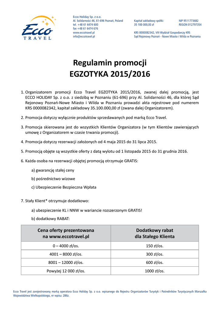 Ecco Holiday Sp. z o.o. Al. Solidarności 46, 61-696 Poznań, Poland tel. +48 61 6474 600 fax +48 61 6474 676 www.eccotravel.pl [email protected] Kapitał zakładowy spółki: 35 100 000,00 zł NIP 9511773682 REGON 012797354 KRS 0000082342, VIII Wydział Gospodarczy KRS Sąd Rejonowy Poznań - Nowe Miasto i Wilda w Poznaniu Regulamin promocji EGZOTYKA 2015/2016 1. O rganizatorem promocji Ecco Travel EGZOTYKA 2015/2016, zwanej dalej promocją, jest ECCO HOLIDAY Sp. z o.o. z siedzibą w Poznaniu (61-696) przy Al. Solidarności 46, dla której Sąd Rejonowy Poznań-Nowe Miasto i Wilda w Poznaniu prowadzi akta rejestrowe pod numerem KRS 0000082342, kapitał zakładowy 35.100.000,00 zł (zwana dalej Organizatorem). 2. Promocja dotyczy wyłącznie produktów sprzedawanych pod marką Ecco Travel. 3. Promocja skierowana jest do wszystkich Klientów Organizatora (w tym Klientów zawierających umowę z Organizatorem w czasie trwania promocji). 4. Promocja dotyczy rezerwacji założonych od 4 maja 2015 do 31 lipca 2015. 5. Promocją objęte są wszystkie oferty z datą wylotu od 1 listopada 2015 do 31 grudnia 2016. 6. Każda osoba na rezerwacji objętej promocją otrzymuje GRATIS: a) gwarancję stałej ceny b) pośrednictwo wizowe c) Ubezpieczenie Bezpieczna Wpłata 7. Stały Klient* otrzymuje dodatkowo: a) ubezpieczenie KL i NNW w wariancie rozszerzonym GRATIS! b) dodatkowy RABAT: Cena oferty prezentowana na www.eccotravel.pl Dodatkowy rabat dla Stałego Klienta 0 – 4000 zł/os. 150 zł/os. 4001 – 8000 zł/os. 300 zł/os. 8001 – 12000 zł/os. 600 zł/os. Powyżej 12 000 zł/os. 1000 zł/os. Ecco Travel jest zarejestrowaną marką operatora Ecco Holiday Sp. z o.o. wpisanego do Rejestru Organizatorów Turystyk i Pośredników Turystycznych Marszałka Województwa Wielkopolskiego, nr wpisu: 286z. Ecco Holiday Sp. z o.o. Al. Solidarności 46, 61-696 Poznań, Poland tel. +48 61 6474 600 fax +48 61 6474 676 www.eccotravel.pl [email protected] Kapitał zakładowy spółki: 35 100 000,00 zł NIP 9511773682 REGON 012797354 KRS 0000082342, VIII Wydział Gospodarczy KRS Sąd Rejonowy Poznań - Nowe Miasto i Wilda w Poznaniu 8. P oziom rabatu uzależniony jest od ceny imprezy prezentowanej na www.eccotravel.pl 9. R abat udzielany jest od całkowitej ceny imprezy wraz z opłatami lotniskowymi z wyłączeniem opłat uiszczanych na miejscu, wycieczek fakultatywnych, opłat wizowych oraz dopłat do wyższej klasy rezerwacyjnej przelotu (np. dopłaty do Klasy Biznes). 10. Upust dotyczy wszystkich uczestników na dowodzie rezerwacji pod warunkiem, że Stały Klient jest jednym z nich. 11. Promocja nie dotyczy ofert przygotowanych na indywidualne zamówienie i zapytań grupowych powyżej 10 osób. 12. O ferta nie łączy się z innymi promocjami i rabatami. 13. S zczegółowe zasady zakupu wyjazdu oraz wpłat zaliczek zawarte są w Warunkach Uczestnictwa – Umowie. 14. Ilość miejsc w promocji jest ograniczona i może ulec wyczerpaniu przed jej zakończeniem. 15. R ezerwację założyć można on-line, pod numerem Infolinii 804 289 220, w salonach firmowych Ecco Holiday oraz wybranych biurach podróży, wskazanych na www.eccotravel.pl 16. W sprawach nieuregulowanych niniejszym regulaminem zastosowanie mają aktualne: Warunki Uczestnictwa - Umowa, Warunki Ubezpieczenia, Warunki Ubezpieczenia Bezpieczna Wpłata oraz przepisy prawa polskiego, przy czym wyłącza się stosowanie Warunków Uczestnictwa - Umowy w zakresie, w którym pozostają one w sprzeczności z postanowieniami niniejszego regulaminu. *Stały Klient to osoba, która kiedykolwiek była uczestnikiem imprezy organizowanej pod marką Ecco Holiday lub Ecco Travel, za wyjątkiem rezerwacji grupowych (powyżej 10 osób). Ecco Travel jest zarejestrowaną marką operatora Ecco Holiday Sp. z o.o. wpisanego do Rejestru Organizatorów Turystyk i Pośredników Turystycznych Marszałka Województwa Wielkopolskiego, nr wpisu: 286z.
