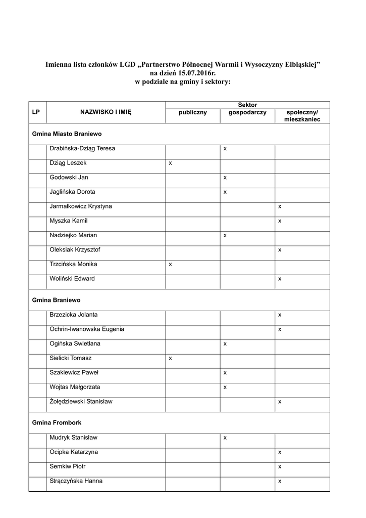 Imienna lista członków LGD „Partnerstwo Północnej Warmii i Wysoczyzny Elbląskiej” na dzień 15.07.2016r. w podziale na gminy i sektory: LP NAZWISKO I IMIĘ Sektor gospodarczy publiczny społeczny/ mieszkaniec Gmina Miasto Braniewo Drabińska-Dziąg Teresa Dziąg Leszek x x Godowski Jan x Jaglińska Dorota x Jarmałkowicz Krystyna x Myszka Kamil x Nadziejko Marian x Oleksiak Krzysztof Trzcińska Monika x x Woliński Edward x Gmina Braniewo Brzezicka Jolanta x Ochrin-Iwanowska Eugenia x Ogińska Swietłana Sielicki Tomasz x x Szakiewicz Paweł x Wojtas Małgorzata x Żołędziewski Stanisław x Gmina Frombork Mudryk Stanisław x Ocipka Katarzyna x Semkiw Piotr x Strączyńska Hanna x Wrońska Małgorzata x Gmina Lelkowo Ilczuk Jakub x Kudliński Mirosław x Lijewska-Oleksiak Katarzyna x Popiel Stanisław x Wieliczko Jerzy x Gmina Milejewo Bereda Sławomir x Doroś Agnieszka x Gracoń Irena x Kapusta Ryszard x Karolkiewicz Bogumiła x Korzeniewska –Pietrzak Beata x Olender Sławomir x Sutryk Anna x Sznajder Mariola x Szumała Krzysztof x Wlazła Danuta Bożena x Zięba Bartłomiej x Gmina Młynary Chechłowska-Chorchel Alicja x Cicirko Izabela Beata x Grabkowski Marek x Falkowska Alicja x Jarosz Franciszka x Kamecka Maria Józefa x Kawa Tadeusz x Konopelska Anna Teresa x Kozłowska Jadwiga x Majzner Tadeusz x Misztal Marek Stanisław x Nisiewicz Ewa x Sabatowski Mirosław Stanisław x Szczepaniak Stanisława x Wyrozębski Wiesław x Zając Ryszard x Gmina Pieniężno Bednarz Władysław x Gałczyńska Zofia x Janczarek Dariusz x Kiejdo Kazimierz x Kłębucki Leszek X Kłębucki Tadeusz x Masłej Artur x Skiba Jarosław x Skiba Krzysztof x Słonina Robert X Sobieszczuk Mateusz Grzegorz x Ślepokura Ewelina x Terebieniec Andrzej x Gmina Płoskinia Garbowski Patryk x Korneluk Łukasz Kowalski Zbigniew x x Gmina Tolkmicko Barton Dariusz x Beyer Michał x Ciesielska Jerzyka x Ciołek Beata x Dawidowska Marlena x Gajewska Janina x Gajewska Urszula x Gajewski Jerzy x Kosznik Izabela x Kryczyński Krystian Jakub x Magdziak-Gęsicka Anetta x Pałka Wojciech x Pogorzelska Aleksandra x Rublewski Adam x Rydzewski Mirosław x Stepnowska Maria x Tkaczuk Michał x Wodzianicka Maria x Zamojcin Józef x Zientara Magdalena x Gmina Wilczęta Augustyńczyk Sebastian x Baniel Artur Jarosz Beata Pochodaj Bogdan Karpińska Edyta x x x x