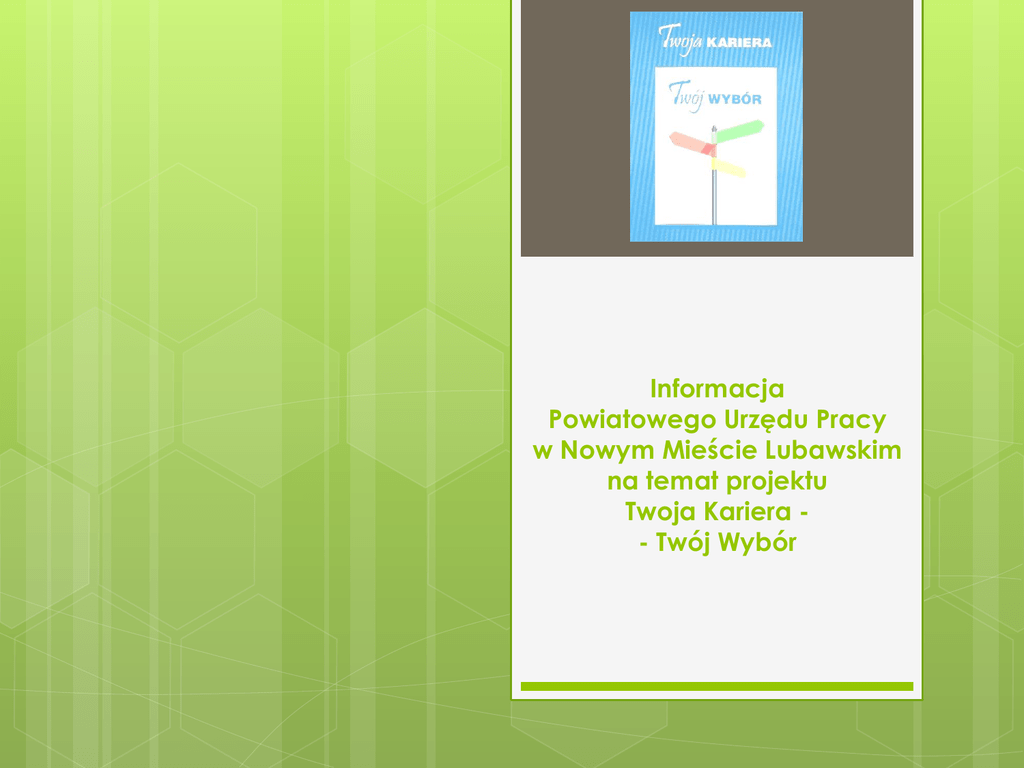 Informacja Powiatowego Urzędu Pracy w Nowym Mieście Lubawskim na temat projektu Twoja Kariera - Twój Wybór Powiat Nowomiejski znajduje się w południowo – zachodniej części województwa warmińsko – mazurskiego. W skład powiatu nowomiejskiego wchodzi pięć jednostek administracyjnych: Miasto Nowe Miasto Lubawskie, Gmina Biskupiec, Gmina Grodziczno, Gmina Kurzętnik, Gmina Nowe Miasto Lubawskie. Informacje ogólne dotyczące projektu: • realizowany w ramach Programu Młodzi Aktywni Na Rynku Pracy • rozpoczął się naborem uczestników dnia 1 lipca 2012 roku, a jego realizacja potrwa do 31 sierpnia 2014 roku • w całym kraju do jego realizacji przystąpiły 23 powiaty • powiat nowomiejski jest jedynym powiatem w województwie Warmińsko-Mazurskim biorącym udział w realizacji tegoż projektu • 29 czerwca 2012 roku została zawarta umowa pomiędzy Ministrem Pracy i Polityki Społecznej a Starostą powiatu nowomiejskiego na realizację projektu pilotażowego „Twoja Kariera – Twój Wybór” Charakterystyka uczestników projektu cz. 1: • osoby do 30-tego roku życia • zarejestrowane po raz pierwszy w urzędzie pracy • zakwalifikowano 60 osób do udziału w projekcie i dokonano podziału na grupę główną oraz kontrolną, w każdej z nich znalazło się po 30 osób, w tym po 15 kobiet • struktura uczestników pilotażu pod względem wykształcenia odzwierciedlała strukturę osób bezrobotnych zarejestrowanych w urzędzie Charakterystyka uczestników projektu cz. 2: • grupa główna miała możliwość otrzymania wsparcia korzystając z form wynikających z ustawy o promocji zatrudnienia oraz pakietu nowych instrumentów wdrażanych w drodze pilotażu, wykluczono możliwość objęcia uczestników grupy głównej takimi formami wsparcia jak: roboty publiczne, prace interwencyjne, prace społecznie użyteczne, refundacja kosztów wyposażenia lub doposażenia stanowiska pracy dla skierowanego bezrobotnego oraz przyznanie jednorazowych środków na podjęcie działalności gospodarczej. Ponadto, na potrzeby pilotażu ograniczono czas trwania przygotowania zawodowego dorosłych do 12 miesięcy. Uczestnicy grupy głównej wyrazili zgodę na udział w pilotażu w formie oświadczenia oraz w badaniach ewaluacyjnych Charakterystyka uczestników projektu cz. 3: • grupa kontrolna objęta była tylko formami wsparcia wynikającymi z ustawy o promocji zatrudnienia, od osób z tej grupy pozyskano zgodę na udostępnienie numeru telefonu oraz adresu e-mail w celu ułatwienia kontaktu z urzędem. Uczestnicy złożyli także oświadczenie o wyrażeniu zgody na udział w badaniu rynku pracy. Osoby bezrobotne nie wiedziały, iż są uczestnikami pilotażu. Główne założenia projektu cz. 1: 1. Indywidualne wsparcie opiekuna 2. Pakiet nowych instrumentów nazywany promesą aktywizacji młodych bezrobotnych (do 30 roku życia): • Bon stażowy (953,00 zł x 6 miesięcy oraz 1.500,00 złotych premii dla pracodawcy, który zatrudni stażystę przez okres 6 miesięcy) • Bon szkoleniowy (3.646,09 zł na podniesienie lub zmianę kwalifikacji) • Bon na kształcenie zawodowe lub policealne (7.292,18 zł na dalsze kształcenie w przypadku konieczności zmiany lub uzupełnienia kwalifikacji zawodowych) Główne założenia projektu cz. 2: • Bon na kształcenie podyplomowe (7 292,18 zł dla uczestników projektu z wykształceniem wyższym w celu uzupełnienia lub zmiany kwalifikacji) • Bon dla pracodawcy za zatrudnienie absolwenta szkoły wyższej (pracodawca otrzymywał przez okres comiesięczną refundację wynagrodzenia ubezpieczenie społeczne zatrudnionego do i 12 miesięcy składek absolwenta na pod warunkiem, że zatrudni tego absolwenta przez co najmniej 18 miesięcy) Główne założenia projektu cz. 3: 3. Dotacja na zasiedlenie (wsparcie mobilności zawodowej i przestrzennej poprzez dotację w wysokości 5 000 zł na pokrycie kosztów związanych z podjęciem zatrudnienia w nowym miejscu pracy, w mieszkania). szczególności na pokrycie kosztów wynajmu Realizacja projektu cz. 1: 1. Największym zainteresowaniem cieszył się: • Bon stażowy, z którego skorzystało 13 osób w tym 6 kobiet • Bon szkoleniowy, który został zastosowany wobec 11 osób, w tym 3 kobiet • Bon na kształcenie podyplomowe, z którego realizacji skorzystały 3 osoby, w tym 2 kobiety • Bon na kształcenie zawodowe lub policealne, z którego skorzystała 1 kobieta Realizacja projektu cz. 2: 2. Formy, które w ogóle nie były realizowane, gdyż żaden z uczestników pilotażu nie był zainteresowany ich realizacją: • Bon dla pracodawcy za zatrudnienie absolwenta szkoły wyższej • Dotacja na zasiedlenie Zmiany w ustawie o promocji zatrudnienia a projekt pilotażowy „Twoja Kariera – Twój Wybór” cz. 1: Projekt miał na celu przede wszystkim poprawę sytuacji młodych ludzi na rynku pracy, a także przetestowanie nowych narzędzi służących zwiększeniu aktywności, samodzielności oraz mobilności młodych osób oraz zbadanie ich efektywności. Rozpoczynając realizację projektu uwzględniono, że jeżeli przyniesie ona pozytywne rezultaty, podjęte zostaną w dalszej kolejności działania zmierzające do wprowadzenia nowych rozwiązań systemowych w zakresie aktywizacji osób do 30 roku życia na stałe do porządku prawnego i działań urzędów pracy. Zmiany w ustawie o promocji zatrudnienia a projekt pilotażowy „Twoja Kariera – Twój Wybór” cz. 2: W ramach projektu założeń do ustawy o promocji zatrudnienia planowane jest wprowadzenie rozwiązań aktualnie testowanych poprzez projekt pilotażowy „Twoja Kariera – Twój Wybór”. Poza intensywną, indywidualną pomocą PUP od pierwszego dnia rejestracji, proponuje się także wprowadzenie następujących pakietów rozwiązań w: Zmiany w ustawie o promocji zatrudnienia a projekt pilotażowy „Twoja Kariera – Twój Wybór” cz. 3: • sferze kształcenia dostępnego i obecnie szkolenia zawodow