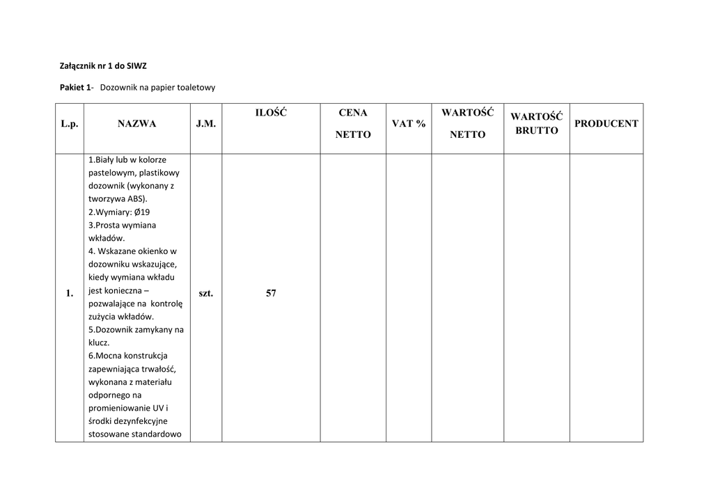 Załącznik nr 1 do SIWZ Pakiet 1- Dozownik na papier toaletowy ILOŚĆ L.p. NAZWA CENA J.M. NETTO 1. 1.Biały lub w kolorze pastelowym, plastikowy dozownik (wykonany z tworzywa ABS). 2.Wymiary: Ø19 3.Prosta wymiana wkładów. 4. Wskazane okienko w dozowniku wskazujące, kiedy wymiana wkładu jest konieczna – pozwalające na kontrolę zużycia wkładów. 5.Dozownik zamykany na klucz. 6.Mocna konstrukcja zapewniająca trwałość, wykonana z materiału odpornego na promieniowanie UV i środki dezynfekcyjne stosowane standardowo szt. WARTOŚĆ VAT % 57 NETTO WARTOŚĆ BRUTTO PRODUCENT w placówkach ochrony zdrowia. RAZEM Pakiet 2- Dozownik na mydło/ płyn dezynfekcyjny ILOŚĆ L.p. NAZWA CENA J.M. NETTO 1. Ścienny dozownik typ Dermados łokciowy dostosowany do butelek o pojemności 500 ml wykonany materiału odpornego na promieniowanie UV i środki dezynfekcyjne stosowane standardowo w placówkach ochrony zdrowia (z możliwością sterylizacji) Łatwy w montażu i demontażu, z możliwością stosowania szt. WARTOŚĆ VAT % 308 NETTO WARTOŚĆ BRUTTO PRODUCENT środków w opakowaniach oryginalnych (bez konieczności przelewania) Wyjmowana pompka dozująca. Regulowana ilość dozowanego preparatu od 0,7 do 1,5 ml. Wymiary dozownika: wys. 24,5 cm x szer. 10,0 cm, długość ramienia 19,7 cm. Wskazane okienko kontrolne pozwalające na monitorowanie ilości zawartości. RAZEM Pakiet 3- Dozownik na papier do rąk ILOŚĆ L.p. NAZWA CENA J.M. NETTO 1. 1.Biały lub w kolorze pastelowym plastikowy (wykonany z tworzywa ABS) dozownik przeznaczony dla ręczników ,,ZZ” (24cm) 2.Wymiary: 21x24cm 3.Uzupełniany od góry. 4.Wskazane okienko pozwalające na kontrolę zużycia wkładów i konieczności ich uzupełniania. 5. Zamykany na kluczyk. 6. Konstrukcja zapewniająca trwałość, wykonana z materiału odpornego na promieniowanie UV i środki dezynfekcyjne szt. WARTOŚĆ VAT % 112 NETTO WARTOŚĆ BRUTTO PRODUCENT stosowane standardowo w placówkach ochrony zdrowia. RAZEM Pakiet 4- Wózek do sprzątania ILOŚĆ L.p. NAZWA CENA J.M. NETTO 1. Komplet: wózek; wiadra o poj. 25l kaŜde; wyciskarka do mopów; koszyczek na środki czystościowe zawieszony na poręczy wózka. szt. WARTOŚĆ VAT % 11 RAZEM NETTO WARTOŚĆ BRUTTO PRODUCENT Pakiet 5- Poduszki ILOŚĆ L.p. NAZWA CENA J.M. NETTO 1. Poduszki z wypełnieniem z włókien syntetycznych antyalergicznych; z możliwością prania i dezynfekowania; z włókien nie zbijających i nie skawalających się; w wymiarach standardowych 800x800mm. szt. WARTOŚĆ VAT % 173 RAZEM NETTO WARTOŚĆ BRUTTO PRODUCENT Pakiet 6 – Komplet pościeli Lp. Nazwa j.m. ilość cena za 1/szt. netto stawka VAT wartość brutto roczna 1. Poszwa szt. 190 2. Poszewka szt. 190 3. Prześcieradło szt. 190 OGÓŁEM Parametry techniczne i jakościowe pościeli: Tkanina Medicus 160 g/m2 w kolorze białym, szyta na zakładkę. Nadruk w kolorze granatowym wzdłuż pościeli o treści: Szpital im. Sokołowskiego w Wałbrzychu – wys. liter 5 cm oraz nadruk dodatkowy np. onkologia – wys. liter 7 cm. Nadruk ma być umieszczony z obu stron poszwy i poszewki i jednostronnie na prześcieradle. Rozmiary: - prześcieradło 240 x 160 cm - poszwa - poszewka 210 x 160 cm 90 x 80 cm Pakiet 7 - Materace p/odleży nowe ILOŚĆ L.p. NAZWA CENA J.M. NETTO Przeznaczony dla pacjentów z odleżynami do III stopnia; Obciążenie co najmniej 140kg 1. Wyposażony w wieszaki do zawieszania na ramie łóżka. Dwie komory głównie. Zawór reanimacyjny CPR. Alarm niskiego ciśnienia ze wskaźnikiem wizualnym i sygnalizacją dźwiękową. Wskaźnik prawidłowego ciśnienia. Pokrowiec wodoodporny, paro przepuszczalny. Air system. Funkcja transportowaszybkozłaczki. Funkcja statyczna.Funkcja poduszki Wyciszenie alarmuZewnętrzny filtr powietrza szt. WARTOŚĆ VAT % 5 NETTO WARTOŚĆ BRUTTO PRODUCENT DANE TECHNICZNE MATERACA • • Wymiary: 200x90x12,7cm. 15-17 komór powietrznych DANE TECHNICZNE POMPY Czas cyklu: ok. 10min.; Ciśnienie pompy: 30-60mmHg;Zasilenie: 230V/50Hz;Wydajność: ok. 8 l/min. RAZEM Pakiet 8- Tablice gorączkowe ILOŚĆ L.p. NAZWA CENA J.M. WARTOŚĆ VAT % NETTO 1. Tablice gorączkoweplastikowe o wym.30x 25cm z uchwytem do zawieszenia i z uchwytem podtrzymującym kartę gorączkową szt. NETTO WARTOŚĆ BRUTTO PRODUCENT WARTOŚĆ BRUTTO PRODUCENT 57 RAZEM Pakiet 9- Krzesło obrotowe ILOŚĆ L.p. NAZWA CENA J.M. NETTO 1. - krzesło obrotowe mobilne; siedzisko i oparcie pokryte materiałem zmywalnym odpornym na promienie UV i środki myjące i szt. WARTOŚĆ VAT % 45 NETTO dezynfekcyjne stosowane standardowo w placówkach ochrony zdrowia; z podłokietnikami ;z możliwością regulacji kąta nachylenia oparcia i wysokości siedziska. RAZEM Pakiet 10- Krzesło zwykłe ILOŚĆ L.p. NAZWA CENA J.M. NETTO 1. Krzesło zwykłesiedzisko i oparcie z polipropylenu; antypoślizgowa powierzchnia siedziska; metalowa chromowana konstrukcja ramy. szt. WARTOŚĆ VAT % 291 RAZEM NETTO WARTOŚĆ BRUTTO PRODUCENT Pakiet 11- Krzesło toaletowe ILOŚĆ L.p. NAZWA CENA J.M. NETTO 1. konstrukcja aluminiowa, mobilna; pojemnik na odchody wyciągany (możliwość opróżniania); deska sedesowa; całość wykonana z materiałów odpornych na działanie promieniowania UV i środków dezynfekcyjnych stosowanych standardowo w placówkach ochrony zdrowia; cztery kółka wykonane z materiału antystatycznego nie brudzącego podłoża, w tym dwa kółka z blokadą wysokość siedziska: ok.53 cm; szerokość: ok. 57 cm; głębokość: ok. 40,5 cm szt. WARTOŚĆ VAT % 2 RAZEM NETTO WARTOŚĆ BRUTTO PRODUCENT
