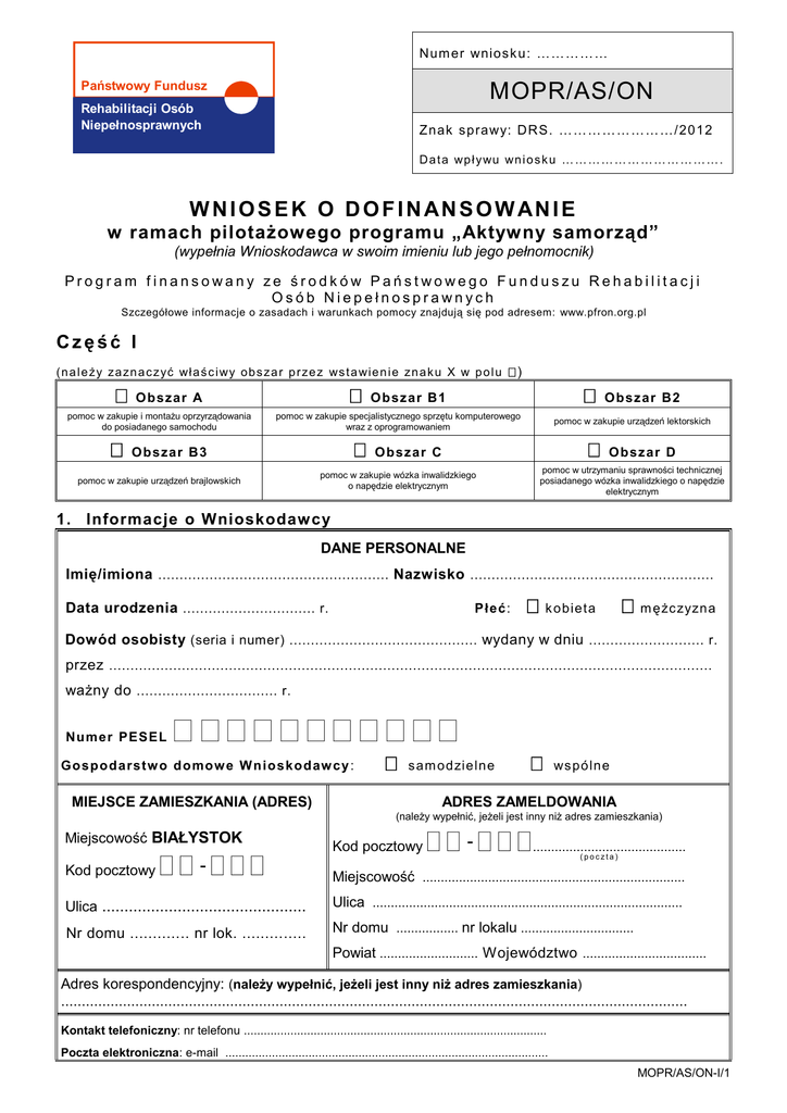 Num er wnios k u: …………… Państwowy Fundusz MOPR/AS/ON Rehabilitacji Osób Niepełnosprawnych Znak s prawy: DRS. ……………………/2012 D a t a wp ł ywu wn i o s k u … … … … … … … … … … … … . W N I O S E K O D O F I N AN S O W AN I E w ramach pilotażowego programu „Aktywny samorząd” (wypełnia Wnioskodawca w swoim imieniu lub jego pełnomocnik) Program finansowany ze środków Państwowego Funduszu Rehabilitacji Osób Niepełnosprawnych Szczegółowe informacje o zasadach i warunkach pomocy znajdują się pod adresem: www.pfron.org.pl Część I ( n a l e ży za zn a c zyć wł a ś c i wy o b s za r p r ze z ws t a wi e n i e zn a k u X w p o l u ) O bsz ar A pomoc w zakupie i montażu oprzyrządowania do posiadanego samochodu O bsz ar B1 pomoc w zakupie specjalistycznego sprzętu komputerowego wraz z oprogramowaniem O bsz ar B3 pomoc w zakupie urządzeń brajlowskich O bsz ar B2 pomoc w zakupie urządzeń lektorskich O bsz ar C O bsz ar D pomoc w utrzymaniu sprawności technicznej posiadanego wózka inwalidzkiego o napędzie elektrycznym pomoc w zakupie wózka inwalidzkiego o napędzie elektrycznym 1. Informacje o Wnioskodaw cy DANE PERSONALNE Imię/imiona ...................................................... Nazwisko ......................................................... Płeć: Data urodzenia ............................... r. k obieta m ężc zyzna Dowód osobisty (seria i numer) ............................................ wydany w dniu ........................... r. przez ............................................................................................................................................. ważny do ................................. r. Numer PESEL G ospodarstw o domow e W nioskodaw cy : s am odzielne MIEJSCE ZAMIESZKANIA (ADRES) ws pólne ADRES ZAMELDOWANIA (należy wypełnić, jeżeli jest inny niż adres zamieszkania) Miejscowość BIAŁYSTOK Kod pocztowy - Kod pocztowy - .......................................... (poczta) Miejscowość ........................................................................ Ulica .............................................. Ulica ..................................................................................... Nr domu ............. nr lok. .............. Nr domu ................. nr lokalu ............................... Powiat ........................... Województwo .................................. Adres korespondencyjny: (należy wypełnić, jeżeli jest inny niż adres zamieszkania) ........................................................................................................................................................ Kontakt telefoniczny: nr telefonu ........................................................................................... Poczta elektroniczna: e-mail ................................................................................................. MOPR/AS/ON-I/1 STAN PRAWNY DOT. NIEPEŁNOSPRAWNOŚCI znaczny stopień całkowita niezdolność do pracy i do samodzielnej egzystencji I grupa inwalidzka albo całkowita niezdolność do samodzielnej egzystencji umiarkowany stopień całkowita niezdolność do pracy II grupa inwalidzka lekki stopień częściowa niezdolność do pracy III grupa inwalidzka Orzeczenie dot. niepełnosprawności ważne jest: okresowo do dnia: .................................... bezterminowo RODZAJ NIEPEŁNOSPRAWNOŚCI NARZĄD RUCHU 05-R, w zakresie: obu kończyn dolnych obu kończyn górnych jednej kończyny dolnej jednej kończyny górnej innym Wnioskodawca nie porusza się przy pomocy wózka inwalidzkiego: Wnioskodawca porusza się samodzielnie przy pomocy wózka inwalidzkiego: Wnioskodawca porusza się niesamodzielnie przy pomocy wózka inwalidzkiego: NARZĄD WZROKU 04-O Lewe oko: Prawe oko: Ostrość wzoru (w korekcji): .................... Ostrość wzoru (w korekcji): .................... Zwężenie pola widzenia: ............. stopni Zwężenie pola widzenia: .............. stopni utrata wzroku utrata wzroku INNE PRZYCZYNY niepełnosprawności wynikające z orzeczenia (proszę zaznaczyć właściwy kod/symbol ): 01-U 03-L zaburzenia 07-S choroby układu 09-M choroby układu 11-I inne upośledzenie umysłowe głosu, mowy i choroby słuchu oddechowego i krążenia 02-P 06-E epilepsja 08-T choroby układu 10-N choroby psychiczne pokarmowego moczowo - płciowego choroby neurologiczne 12-C całościowe zaburzenia rozwojowe AKTYWNOŚĆ ZAWODOWA zatrudniona/y: od dnia: ................... do dnia: ....................... na czas nieokreślony inny, jaki: ............................. Nazwa podmiotu zatrudniającego: ......................................................................................... ......................................................................................... Adres miejsca pracy: .................................................... stosunek pracy na podstawie umowy o pracę stosunek pracy na podstawie powołania, wyboru, ....................................................................................... mianowania oraz spółdzielczej umowy o pracę ....................................................................................... umowa cywilnoprawna staż zawodowy działalność gospodarcza Nr NIP: ...................................... Nr REGON: ................................ działalność rolnicza MOPR/AS/ON-I/2 ....................................................................................... Telefon kontaktowy do podmiotu zatrudniającego: ................................................................................... na podstawie wpisu do ewidencji działalności gospodarczej nr ............................... dokonanego w urzędzie: ................................... ................................................................................................................... (podać jeśli brak jest wpisu przedsiębiorcy w Centralnej Ewi