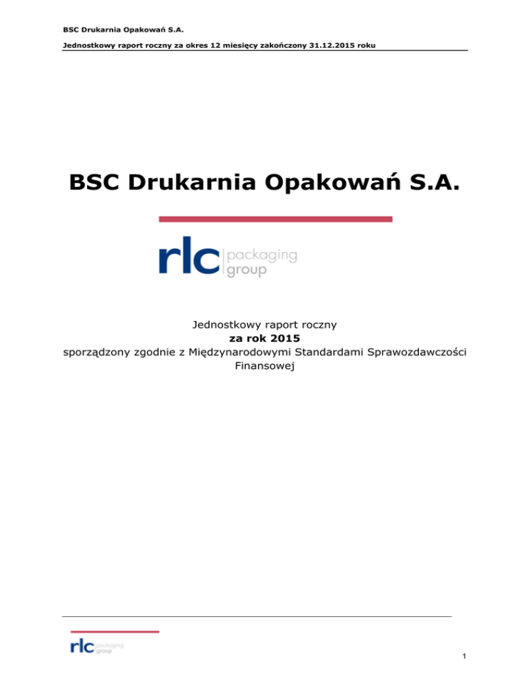 BSC Drukarnia Opakowań S.A. Jednostkowy raport roczny za okres 12 miesięcy zakończony 31.12.2015 roku BSC Drukarnia Opakowań S.A. Jednostkowy raport roczny za rok 2015 sporządzony zgodnie z Międzynarodowymi Standardami Sprawozdawczości Finansowej 1 BSC Drukarnia Opakowań S.A. Jednostkowy raport roczny za okres 12 miesięcy zakończony 31.12.2015 roku Zarząd BSC Drukarnia Opakowań S.A. przedstawia jednostkowe sprawozdanie finansowe za okres 12 miesięcy kończących się 31.12.2015 roku, na które składa się: Wybrane dane finansowe BSC Drukarni Opakowań SA ……………………………… Jednostkowe sprawozdanie z zysków lub strat oraz innych całkowitych dochodów BSC Drukarnia Opakowań S.A. zakończone 31.12.2015 roku …………………………………………………………………………………………………………………………4 Jednostkowe sprawozdanie z sytuacji finansowej BSC Drukarnia Opakowań S.A. zakończone 31.12.2015 roku ……………………………………………………………… 5 Jednostkowe sprawozdanie z przepływów pieniężnych BSC Drukarnia Opakowań S.A. zakończone 31.12.2015 roku …………………………………………….7 Jednostkowe sprawozdanie ze zmian w kapitale własnym BSC Drukarnia Opakowań S.A. zakończone 31.12.2015 roku …………………………………………….8 Noty objaśniające roczne jednostkowe sprawozdanie …………………………………..9 Janusz Schwark Arkadiusz Czysz Andrzej Baranowski Prezes Zarządu Wiceprezes Zarządu Wiceprezes Zarządu Maria Świątkowska Osoba odpowiedzialna za prowadzenie ksiąg rachunkowych Poznań, 21-03-2016 roku 2 BSC Drukarnia Opakowań S.A. Jednostkowy raport roczny za okres 12 miesięcy zakończony 31.12. 2015 roku WYBRANE DANE FINANSOWE BSC DRUKARNI OPAKOWAŃ S.A. tys. PLN WYBRANE DANE FINANSOWE dane od 01.01.2015 do 31.12.2015 Przychody netto ze sprzedaży tys. EUR dane od 01.01.2014 do 31.12.2014 dane od 01.01.2015 do 31.12.2015 dane od 01.01.2014 do 31.12.2014 211 914 172 622 50 639 41 246 Zysk (strata) ze sprzedaży 23 547 15 158 5 627 3 622 Zysk (strata) z działalności operacyjnej 27 901 20 792 6 667 4 968 Zysk (strata) przed opodatkowania 27 467 21 496 6 564 5 136 Zysk (strata) netto 21 782 17 505 5 205 4 183 Przepływy pieniężne netto z działalności operacyjnej Przepływy pieniężne netto z działalności inwestycyjnej Przepływy pieniężne netto z działalności finansowej 17 794 9 558 5 205 2 284 -21 054 -23 959 -5 031 -5 725 -7 534 -6 529 -1 800 -1 560 Przepływy pieniężne netto – razem -10 793 -20 930 -2 579 -5 001 Aktywa/Pasywa razem 237 863 215 319 55 817 50 517 Aktywa trwałe 130 383 106 485 30 596 24 983 Aktywa obrotowe 107 480 108 834 25 221 25 534 Kapitał własny 194 210 178 313 45 573 41 835 Zobowiązania razem 43 653 37 006 10 244 8 682 Zobowiązania długoterminowe 16 072 16 366 3 771 3 840 Zobowiązania krótkoterminowe 27 581 20 640 6 472 4 842 9 808 9 808 9 808 9 808 Liczba akcji (tys. szt.) Zysk (strata) na jedną akcję zwykłą (w zł / EUR ) 2,22 1,79 0,52 0,42 Wartość księgowa na jedną akcję (w zł /EUR ) 19,8 18,18 4,65 4,27 Dane finansowe przeliczone zostały na walutę euro wg kursów - do przeliczenia pozycji sprawozdania z sytuacji finansowej - do przeliczenia pozycji sprawozdania z całkowitych dochodów oraz przepływów pieniężnych 2015 4,2615 4,1848 2014 4,2623 4,1852 3 BSC Drukarnia Opakowań S.A. Jednostkowy raport roczny za okres 12 miesięcy zakończony 31.12.2015 roku JEDNOSTKOWE SPRAWOZDANIE Z ZYSKÓW LUB STRAT ORAZ INNYCH CAŁKOWITYCH DOCHODÓW 12 miesięcy zakończone 31.12.2015 tys. PLN Wyszczególnienie 12 miesięcy zakończone 31.12.2014 tys. PLN Nota Działalność kontynuowana Przychody ze sprzedaży 6 Pozostałe przychody operacyjne 7 Razem przychody z działalności operacyjnej Zmiana stanu produktów 206 117 172 622 5 797 6 375 211 914 178 997 -6 851 -3 304 Zużycie materiałów 8 104 636 86 666 Wynagrodzenia wraz ze świadczeniami 8 23 190 21 186 Usługi obce 8 22 518 15 710 Amortyzacja 8 9 575 8 382 Pozostałe koszty 8 2 596 1 868 Wartość sprzedanych towarów, materiałów 8 28 349 27 697 184 013 158 205 27 901 20 792 Razem koszty działalności operacyjnej Zysk (strata) na działalności operacyjnej Przychody finansowe 9 422 1 097 Koszty finansowe 9 856 393 27 467 21 496 Zysk (strata) przed opodatkowaniem Podatek dochodowy Zysk (strata) netto z działalności kontynuowanej 10 5 685 3 991 11 21 782 17 505 21 782 17 505 - - 21 782 17 505 Działalność zaniechana Strata netto z działalności zaniechanej Zysk (strata) netto Inne całkowite dochody (netto) Całkowite dochody ogółem 4 BSC Drukarnia Opakowań S.A. Jednostkowy raport roczny za okres 12 miesięcy zakończony 31.12.2015 roku ZYSK PRZYPADAJĄCY NA JEDNĄ AKCJĘ Wyszczególnienie 12 miesięcy zakończone 31.12.2015 tys. PLN 12 miesięcy zakończone 31.12.2014 tys. PLN Zysk netto/dochód netto 21 782 17 505 Liczba akcji (w sztukach) 9 807 516 9 807 516 2,22 1,79 2,22 1,79 21 782 17 505 9 807 516 9 807 516 2,22 1,79 2,22 1,79 - - Podstawowy zysk przypadający na jedną akcję - z działalności kontynuowanej - z działalności zaniechanej Rozwodniony zysk netto Rozwodniona liczba akcji (w sztukach) Zysk rozwodniony przypadający na jedną akcję - z działalności kontynuowanej - z działalności zaniechanej 5 BSC Drukarnia Opakowań S.A. Jednostkowy raport roczny za okres 12 miesięcy zakończony 31.12.2015 roku JEDNOSTKOWE SPRAWOZDANIE Z SYTUACJI FINANSOWEJ Wyszczególnienie Nota Stan na dzień Stan na dzień 31.12.2015 31.12.2014 tys. PLN tys. PLN Aktywa trwałe Rzeczowe aktywa trwałe 14 116 787 96 147 Wartości niematerialne 15 2 385 2 259 Inwestycje w spółkach zależnych 18 9 904 5 506 Aktywa finansowe 18 - 1 125 1 307 1 448 - - 130 383 106 485 Aktywa z tytułu odroczonego podatku dochodowego Pozostałe aktywa Aktywa trwałe razem Aktywa obrotowe Zapasy 16 37 874 30 676 Należności 