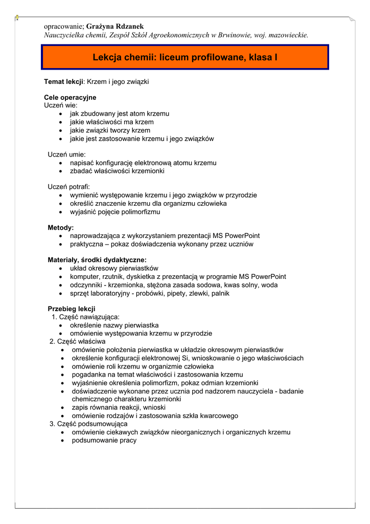 opracowanie; Grażyna Rdzanek Nauczycielka chemii, Zespół Szkół Agroekonomicznych w Brwinowie, woj. mazowieckie. Lekcja chemii: liceum profilowane, klasa I Temat lekcji: Krzem i jego związki Cele operacyjne Uczeń wie: • jak zbudowany jest atom krzemu • jakie właściwości ma krzem • jakie związki tworzy krzem • jakie jest zastosowanie krzemu i jego związków Uczeń umie: • napisać konfigurację elektronową atomu krzemu • zbadać właściwości krzemionki Uczeń potrafi: • wymienić występowanie krzemu i jego związków w przyrodzie • określić znaczenie krzemu dla organizmu człowieka • wyjaśnić pojęcie polimorfizmu Metody: • naprowadzająca z wykorzystaniem prezentacji MS PowerPoint • praktyczna – pokaz doświadczenia wykonany przez uczniów Materiały, środki dydaktyczne: • układ okresowy pierwiastków • komputer, rzutnik, dyskietka z prezentacją w programie MS PowerPoint • odczynniki - krzemionka, stężona zasada sodowa, kwas solny, woda • sprzęt laboratoryjny - probówki, pipety, zlewki, palnik Przebieg lekcji 1. Część nawiązująca: • określenie nazwy pierwiastka • omówienie występowania krzemu w przyrodzie 2. Część właściwa • omówienie położenia pierwiastka w układzie okresowym pierwiastków • określenie konfiguracji elektronowej Si, wnioskowanie o jego właściwościach • omówienie roli krzemu w organizmie człowieka • pogadanka na temat właściwości i zastosowania krzemu • wyjaśnienie określenia polimorfizm, pokaz odmian krzemionki • doświadczenie wykonane przez ucznia pod nadzorem nauczyciela - badanie chemicznego charakteru krzemionki • zapis równania reakcji, wnioski • omówienie rodzajów i zastosowania szkła kwarcowego 3. Część podsumowująca • omówienie ciekawych związków nieorganicznych i organicznych krzemu • podsumowanie pracy
