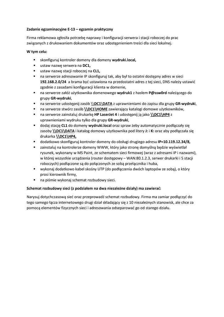 Zadanie egzaminacyjne E-13 – egzamin praktyczny Firma reklamowa zgłosiła potrzebę naprawy i konfiguracji serwera i stacji roboczej do prac związanych z drukowaniem dokumentów oraz udostępnieniem treści dla sieci lokalnej. W tym celu: skonfiguruj kontroler domeny dla domeny wydruki.local, ustaw nazwę serwera na DC1, ustaw nazwę stacji roboczej na CL1, na serwerze adresowanie IP skonfiguruj tak, aby był to ostatni dostępny adres w sieci 192.168.2.0/24 a brama być ustawiona na przedostatni adres z tej sieci, DNS należy ustawić zgodnie z zasadami konfiguracji klienta w domenie, na serwerze załóż użytkownika domenowego wydruk1 z hasłem P@ssw0rd należącego do grupy GR-wydruki, na serwerze udostępnij zasób \\DC1\DATA z uprawnieniami do zapisu dla grupy GR-wydruki, na serwerze stwórz zasób \\DC1\HOME zawierający katalogi domowe użytkowników, na serwerze zainstaluj drukarkę HP LaserJet 4 i udostępnij ją jako \\DC1\HP4 z uprawnieniami wydruku tylko dla grupy GR-wydruki, dodaj stację CL1 do domeny wydruki.local oraz spraw żeby automatycznie podłączały się zasoby \\DC1\DATA i katalog domowy użytkownika pod litery J: i K: oraz aby podłączała się drukarka \\DC1\HP4, dodatkowo skonfiguruj kontroler domeny do obsługi drugiego adresu IP=10.119.12.34/8, zainstaluj na kontrolerze domeny WWW, który jako stronę domyślną będzie wyświetlał rysunek, wykonany w MS Paint, ze schematem sieci firmowej (wraz z adresami IP i nazwami), w której wszystkie urządzenia (router dostępowy – WAN:80.1.2.3, serwer drukarki i 5 stacji roboczych) podłączone są do połączonych ze sobą przełącznika i huba, wykonaj dodatkowo kabel skośny UTP (do podłączenia dwóch laptopów ze sobą), o który prosi kierownik firmy, na piśmie wykonaj schemat rozbudowy sieci. Schemat rozbudowy sieci (z podziałem na dwa niezależne działy) ma zawierać: Narysuj dotychczasową sieć oraz przeprowadź schemat rozbudowy. Firma ma zamiar podłączyć do tego samego łącza internetowego drugi dział składający się z 10 niezależnych stanowisk, ale chce za pomocą elementów fizycznych sieci i adresowania odseparować go od starego działu.