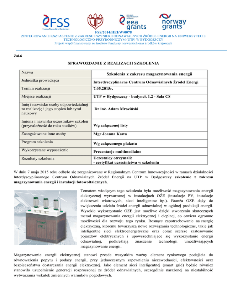 FSS/2014/HEI/W/0078 ZINTEGROWANIE KSZTAŁCENIE Z ZAKRESU INŻYNIERII ODNAWIALNYCH ŹRÓDEŁ ENERGII NA UNIWERSYTECIE TECHNOLOGICZNO-PRZYRODNICZYM (UTP) W BYDGOSZCZY Projekt współfinansowany ze środków funduszy norweskich oraz środków krajowych Zał.6 SPRAWOZDANIE Z REALIZACJI SZKOLENIA Nazwa Szkolenia z zakresu magazynowania energii Jednostka prowadząca Interdyscyplinarne Centrum Odnawialnych Źródeł Energi Termin realizacji 7.05.2015r. Miejsce realizacji UTP w Bydgoszczy - budynek 1.2 - Sala C8 Imię i nazwisko osoby odpowiedzialnej za realizację i jego stopień lub tytuł naukowy Dr inż. Adam Mroziński Imiona i nazwiska uczestników szkoleń (przynależność do roku studiów) Wg załączonej listy Zaangażowane inne osoby Mgr Joanna Kawa Program szkolenia Wg załączonego plakatu Wykorzystane wyposażenie Prezentacje multimedialne Rezultaty szkolenia Uczestnicy otrzymali: - certyfikat uczestnictwa w szkoleniu W dniu 7 maja 2015 roku odbyło się zorganizowane w Regionalnym Centrum Innowacyjności w ramach działalności Interdyscyplinarnego Centrum Odnawialnych Źródeł Energii na UTP w Bydgoszczy szkolenie z zakresu magazynowania energii i instalacji fotowoltaicznych. Tematem wiodącym tego szkolenia była możliwość magazynowania energii elektrycznej wytwarzanej w instalacjach OŹE (instalacje PV, instalacje elektrowni wiatrowych, sieci inteligentne itp.). Branża OZE dąży do zwiększenia udziału źródeł energii odnawialnej w ogólnej produkcji energii. Wysokie wykorzystanie OZE jest możliwe dzięki stworzeniu skutecznych metod magazynowania energii elektrycznej i cieplnej, co otwiera ogromne możliwości dla rozwoju tego rynku. Rosnące zapotrzebowanie na energię elektryczną, któremu towarzyszą nowe rozwiązania technologiczne, takie jak inteligentne sieci elektroenergetyczne oraz coraz szersze zastosowanie pojazdów elektrycznych i upowszechniające się wykorzystanie energii odnawialnej, podkreślają znaczenie technologii umożliwiających magazynowanie energii. Magazynowanie energii elektrycznej stanowi przede wszystkim ważny element rynkowego podejścia do równoważenia popytu i podaży energii, przy jednoczesnym zapewnieniu niezawodności, efektywności oraz bezpieczeństwa dostarczania energii elektrycznej. Jako element sieci inteligentnej (smart grid) będzie również stanowiło uzupełnienie generacji rozproszonej ze źródeł odnawialnych, szczególnie narażonej na niestabilność wytwarzania wskutek zmiennych warunków pogodowych. FSS/2014/HEI/W/0078 ZINTEGROWANIE KSZTAŁCENIE Z ZAKRESU INŻYNIERII ODNAWIALNYCH ŹRÓDEŁ ENERGII NA UNIWERSYTECIE TECHNOLOGICZNO-PRZYRODNICZYM (UTP) W BYDGOSZCZY Projekt współfinansowany ze środków funduszy norweskich oraz środków krajowych Zagadnie magazynowanie energii elektrycznej w układach OŹE w małej i dużej skali przedstawił Dyrektor oddziału firmy Hoppecke Baterie Polska Sp. z o.o. w Warszawie. HOPPECKE Batterien GmbH & Co. KG - www.hoppecke.pl - jest jednym ze światowych liderów w branży producentów baterii akumulatorów przemysłowych. Firma działała na światowych rynkach od 1927 roku. W zakładach produkcyjnych, ulokowanych w Brilon (okolice Dortmund/Kassel) w Niemczech, produkowane są najwyższej jakości przemysłowe baterie kwasowo-ołowiowe i zasadowe. HOPPECKE dostarcza systemy baterii stacjonarnych na potrzeby energetyki, telekomunikacji, kolei, przemysłu. Odbiorcami baterii trakcyjnych są wszyscy najważniejsi producenci wózków widłowych. Hoppecke oferuje również grupę produktów specjalizowanych do zastosowań w systemach produkujących energię elektryczną w sposób nieciągły. Grupa produktów oznaczona jako "solarpower" posiada zastosowanie między innymi w dziedzinach: fotowoltaika, turbiny wiatrowe, systemy z ogniwami paliwowymi, autonomiczne wyspy energetyczne (tzw. "off-grid") oraz systemy zasilania z mocą szczytową odbiorów większą niż moc zainstalowana. W ramach szkolenia swoje prezentacje przedstawili również Mgr inż. Łukasz Trzeciak z firmy Green Synergy sp. z o.o. oraz Dr hab. inż. Sławomir Cieślik i Dr inż. Adam Mroziński reprezentujący Interdyscyplinarne Centrum Odnawialnych Źródeł Energii - www.icoze.utp.edu.pl. Treść merytoryczna szkolenia w tej części oparta była m.in. o podstawy fotowoltaiki oraz możliwość wykorzystania jej w Polsce, rozwiązania konstrukcyjne i projektowe, a także zarządzanie jakością poprzez efektywny monitoring. Ponadto zostały omówione możliwości finansowania inwestycji w systemy PV w oparciu o planowane do uruchomienia programy wsparcia instalacji OZE w Polsce (np. program Prosument). Podczas prezentacji i na jej koniec uczestnicy szkolenia mogli zadać pytania oraz brać udział w dyskusji. Szkolenie kierowane było do projektantów instalacji PV, Instalatorów instalacji PV oraz studentów Wydziału Inżynierii Mechanicznej (głównie kierunek Inżynieria Odnawialnych Źródeł Energii) oraz w zakresie ogólnym do potencjalnych inwestorów indywidualnych, MŚP, przedstawicieli instytucji budżetowych, gmin oraz JST. Warto podkreślić duże zainteresowanie szkoleniem. W szkoleniu uczestniczyło blisko 40 mikro, małych, średnich i dużych firm z całego regionu. Poza tym w szkoleniu największa grupę stanowili pracownicy naukowi UTP w Bydgoszczy, studenci kierunku inżynieria Odnawialnych Źródeł Energii oraz słuchacze studiów podyplomowych Instalacje Odnawialnych Źródeł Energii w Przedsiębiorstwie. FSS/2014/HEI/W/0078 ZINTEGROWANIE KSZTAŁCENIE Z ZAKRESU INŻYNIERII ODNAWIALNYCH ŹRÓDEŁ ENERGII NA UNIWERSYTECIE TECHNOLOGICZNO-PRZYRODNICZYM (UTP) W BYDGOSZCZY Projekt współfinansowany ze środków funduszy norweskich oraz środków krajowych FSS/2014/HEI/W/0078 ZINTEGROWANIE KSZTAŁCENIE Z ZAKRESU INŻYNIERII ODNAWIALNYCH ŹRÓDEŁ ENERGII NA UNIWERSYTECIE TECHNOLOGICZNO-PRZYRODNICZYM (UTP) W BYDGOSZCZY Projekt współfinansowany ze środków funduszy norweskich oraz środków