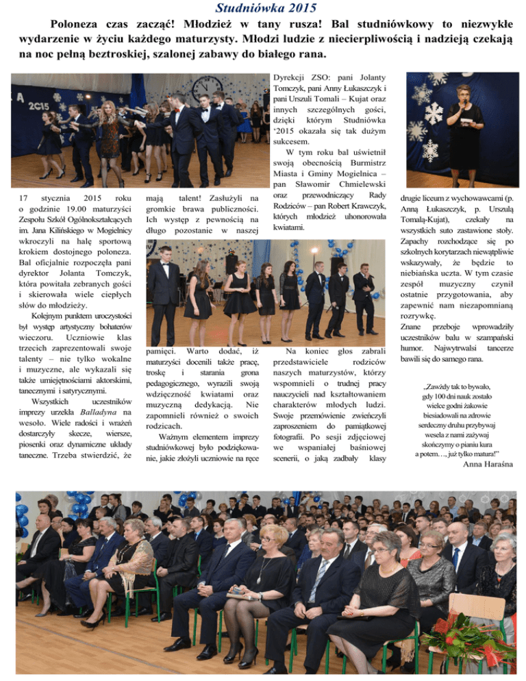 Studniówka 2015 Poloneza czas zacząć! Młodzież w tany rusza! Bal studniówkowy to niezwykłe wydarzenie w życiu każdego maturzysty. Młodzi ludzie z niecierpliwością i nadzieją czekają na noc pełną beztroskiej, szalonej zabawy do białego rana. 17 stycznia 2015 roku o godzinie 19.00 maturzyści Zespołu Szkół Ogólnokształcących im. Jana Kilińskiego w Mogielnicy wkroczyli na halę sportową krokiem dostojnego poloneza. Bal oficjalnie rozpoczęła pani dyrektor Jolanta Tomczyk, która powitała zebranych gości i skierowała wiele ciepłych słów do młodzieży. Kolejnym punktem uroczystości był występ artystyczny bohaterów wieczoru. Uczniowie klas trzecich zaprezentowali swoje talenty – nie tylko wokalne i muzyczne, ale wykazali się także umiejętnościami aktorskimi, tanecznymi i satyrycznymi. Wszystkich uczestników imprezy urzekła Balladyna na wesoło. Wiele radości i wrażeń dostarczyły skecze, wiersze, piosenki oraz dynamiczne układy taneczne. Trzeba stwierdzić, że mają talent! Zasłużyli na gromkie brawa publiczności. Ich występ z pewnością na długo pozostanie w naszej Dyrekcji ZSO: pani Jolanty Tomczyk, pani Anny Łukaszczyk i pani Urszuli Tomali – Kujat oraz innych szczególnych gości, dzięki którym Studniówka ‘2015 okazała się tak dużym sukcesem. W tym roku bal uświetnił swoją obecnością Burmistrz Miasta i Gminy Mogielnica – pan Sławomir Chmielewski oraz przewodniczący Rady Rodziców – pan Robert Krawczyk, których młodzież uhonorowała kwiatami. pamięci. Warto dodać, iż maturzyści docenili także pracę, troskę i starania grona pedagogicznego, wyrazili swoją wdzięczność kwiatami oraz muzyczną dedykacją. Nie zapomnieli również o swoich rodzicach. Ważnym elementem imprezy studniówkowej było podziękowanie, jakie złożyli uczniowie na ręce Na koniec głos zabrali przedstawiciele rodziców naszych maturzystów, którzy wspomnieli o trudnej pracy nauczycieli nad kształtowaniem charakterów młodych ludzi. Swoje przemówienie zwieńczyli zaproszeniem do pamiątkowej fotografii. Po sesji zdjęciowej we wspaniałej baśniowej scenerii, o jaką zadbały klasy drugie liceum z wychowawcami (p. Anną Łukaszczyk, p. Urszulą Tomalą-Kujat), czekały na wszystkich suto zastawione stoły. Zapachy rozchodzące się po szkolnych korytarzach niewątpliwie wskazywały, że będzie to niebiańska uczta. W tym czasie zespół muzyczny czynił ostatnie przygotowania, aby zapewnić nam niezapomnianą rozrywkę. Znane przeboje wprowadziły uczestników balu w szampański humor. Najwytrwalsi tancerze bawili się do samego rana. „Zawżdy tak to bywało, gdy 100 dni nauk zostało wielce godni żakowie biesiadowali na zdrowie serdeczny druhu przybywaj wesela z nami zażywaj skończymy o pianiu kura a potem…, już tylko matura!” Anna Haraśna