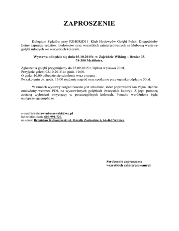 ZAPROSZENIE Kolegium Sędziów przy PZHGRiDI i Klub Hodowców Gołębi Polski Długodzioby Lotny zaprasza sędziów, hodowców oraz wszystkich zainteresowanych na klubową wystawę gołębi młodych we wszystkich kolorach. Wystawa odbędzie się dnia 03.10.2015r. w Zajeździe Wiking – Renice 35, 74-300 Myślibórz. Zgłoszenia gołębi przyjmujemy do 25.09.2015 r. Opłata wpisowa 20 zł. Przyjęcie gołębi 03.10.2015 do godz. 10.00. O godz. 10.00 odbędzie się szkolenie wraz z oceną . Po szkoleniu ok. godz. 16.00 rozdanie nagród oraz spotkanie przy ognisku odpłatne 50 zł. W ramach wystawy zorganizowane jest szkolenie, które poprowadzi Jan Pajka. Będzie omówiony wzorzec PDL na wystawionych gołębiach (wszystkie kolory). Z jego pomocą zostaną wyłonieni zwycięzcy w poszczególnych kolorach. Ponadto wyróżnione będą najlepsze egzemplarze. [email protected] lub telefonicznie 606-991-729. na adres: Bronisław Rubaszewski ul. Osiedle Zachodnie 6, 66-460 Witnica Serdecznie zapraszamy wszystkich zainteresowanych