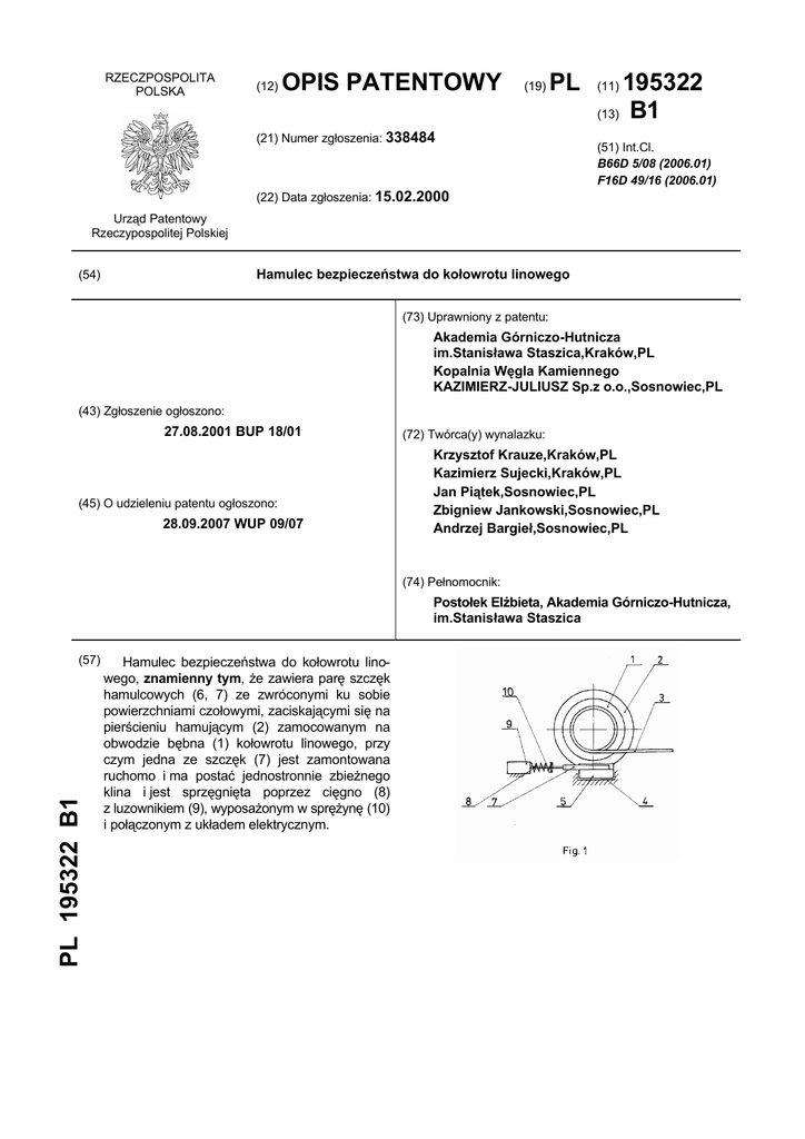RZECZPOSPOLITA POLSKA (12) OPIS PATENTOWY (19) PL (21) Numer zgłoszenia: 338484 195322 (13) B1 (11) (51) Int.Cl. B66D 5/08 (2006.01) F16D 49/16 (2006.01) (22) Data zgłoszenia: 15.02.2000 Urząd Patentowy Rzeczypospolitej Polskiej Hamulec bezpieczeństwa do kołowrotu linowego (54) (73) Uprawniony z patentu: Akademia Górniczo-Hutnicza im.Stanisława Staszica,Kraków,PL Kopalnia Węgla Kamiennego KAZIMIERZ-JULIUSZ Sp.z o.o.,Sosnowiec,PL (43) Zgłoszenie ogłoszono: 27.08.2001 BUP 18/01 (45) O udzieleniu patentu ogłoszono: 28.09.2007 WUP 09/07 (72) Twórca(y) wynalazku: Krzysztof Krauze,Kraków,PL Kazimierz Sujecki,Kraków,PL Jan Piątek,Sosnowiec,PL Zbigniew Jankowski,Sosnowiec,PL Andrzej Bargieł,Sosnowiec,PL (74) Pełnomocnik: Postołek Elżbieta, Akademia Górniczo-Hutnicza, im.Stanisława Staszica PL 195322 B1 (57) Hamulec bezpieczeństwa do kołowrotu linowego, znamienny tym, że zawiera parę szczęk hamulcowych (6, 7) ze zwróconymi ku sobie powierzchniami czołowymi, zaciskającymi się na pierścieniu hamującym (2) zamocowanym na obwodzie bębna (1) kołowrotu linowego, przy czym jedna ze szczęk (7) jest zamontowana ruchomo i ma postać jednostronnie zbieżnego klina i jest sprzęgnięta poprzez cięgno (8) z luzownikiem (9), wyposażonym w sprężynę (10) i połączonym z układem elektrycznym. 2 PL 195 322 B1 Opis wynalazku Przedmiotem wynalazku jest hamulec bezpieczeństwa do kołowrotu linowego z napędem elektrycznym, stosowany zwłaszcza do napędu szynowych kolei spągowych. Kołowroty linowe są jednym z podstawowych środków transportu ciężkich maszyn i urządzeń oraz materiałów w podziemiach kopalń. Kołowroty muszą być wyposażone, zgodnie z przepisami górniczymi, w dwa niezależnie działające hamulce, przy czym jeden z nich jest hamulcem bezpieczeństwa. Znane kołowroty są napędzane silnikami elektrycznymi, które nie posiadają wbudowanych wewnątrz hamulców elektrycznych. Napęd z silników jest przekazywany poprzez układ przekładni na bęben linowy kołowrotu, zaopatrzony w hamulec cierny szczękowy. W związku z tym hamowanie kołowrotu odbywa się tylko na bębnie, zaś hamulec jest uruchamiany przez operatora, który naciskając dźwignię i stale ją trzymając powoduje, że hamulec jest zluzowany. Brak nacisku na dźwignię powoduje powrót hamulca do stanu wyjściowego, a więc zahamowanie bębna kołowrotu. Hamulec ten spełnia równocześnie rolę hamulca manewrowego i bezpieczeństwa, co powoduje, że nie spełnia on wymogów zalecanych przepisami górniczymi. Brak dopływu prądu do silników może nie być zauważony przez operatora kołowrotu, który naciskając dalej dźwignię powoduje niekontrolowane rozbieganie się kołowrotu w wyniku działania ciężaru zamocowanego do liny, co może być powodem niebezpiecznych wypadków. Znany z polskiego opisu patentowego nr 173 719 hamulec bezpieczeństwa kołowrotu linowego z napędem elektrycznym, którego szczęki hamulcowe działają na bęben kołowrotu, jest uruchamiany hydraulicznie. Hamulec ten jest luzowany hydraulicznym siłownikiem, do którego przestrzeni roboczej, połączonej poprzez ręczny odcinający zawór i/lub elektromagnetyczny odcinający zawór ze spływem oraz zaopatrzonej w przelewowy zawór, ma wpięty czujnik ciśnienia, który jest połączony na drodze elektrycznej z obwodem sterowania silników. Elektromagnetyczny zawór odcinający jest połączony na drodze elektrycznej z czujnikiem prędkości obrotów bębna oraz wyłącznikami usytuowanymi na trasie liny kołowrotu. Uruchamianie hamulca bezpieczeństwa następuje poprzez spływ medium z cylindra w wyniku zadziałania ręcznego odcinającego zaworu na skutek interwencji obsługi lub elektromagnetycznego odcinającego zaworu uruchamianego poprzez sygnał elektryczny pochodzący z wyłączników rozmieszczonych co pewien odcinek na trasie kołowrotu lub z czujnika prędkości, w wyniku jej przekroczenia. Istota rozwiązania według wynalazku polega na tym, że hamulec bezpieczeństwa zawiera parę szczęk hamulcowych ze zwróconymi ku sobie powierzchniami czołowymi, zaciskającymi się na pierścieniu hamującym zamocowanym na obwodzie bębna kołowrotu linowego. Jedna ze szczęk jest zamontowana ruchomo i ma postać jednostronnie zbieżnego klina i jest sprzęgnięta poprzez cięgno z luzownikiem, wyposażonym w sprężynę i połączonym z układem elektrycznym. Zaletą hamulca bezpieczeństwa, według wynalazku, jest jego prosta i zwarta konstrukcja, a dzięki zastosowaniu luzownika i szczęki hamulcowej w kształcie klina uzyskuje się automatycznie siłę hamowania proporcjonalną do transportowanej masy. Przedmiot wynalazku jest uwidoczniony w przykładzie wykonania na rysunku, na którym fig. 1 przedstawia schematycznie część kołowrotu linowego z hamulcem bezpieczeństwa w rzucie z boku, a fig. 2 - hamulec bezpieczeństwa w powiększeniu w rzucie z góry w położeniu hamowania w przypadku braku zasilania. Bęben 1 kołowrotu linowego z zamocowanym na jego obwodzie pierścieniem hamującym 2 i liną 3 umieszczony jest w ramie 4. W płaszczyźnie poziomej ramy 4 usytuowany jest hamulec bezpieczeństwa, zawierający korpus 5 zamocowany luźno i przymocowany do konstrukcji kołowrotu. Wewnątrz korpusu 5 umieszczone są dwie naprzeciwległe szczęki: stała 6 i ruchoma 7, która ma postać jednostronnie zbieżnego klina. Szczęka ruchoma 7 połączona jest sztywnym cięgnem 8 z luzownikiem elektromagnetycznym 9, wyposażonym w sprężynę 10. Ruch obrotowy bębna 1 wymuszany jest silnikiem elektrycznym, na zaciskach którego pojawia się napięcie robocze. Jednocześnie na zaciskach cewki luzownika elektromagnetycznego 9 występuje napięcie sterowania, które wciąga zworę do cewki luzownika 9, uginając sprężynę 10 i wysuwając klin 7 tak, że następuje odhamowanie hamulca. Natomiast zanik napięcia na cewce luzownika elektromagnetycznego 9 powoduje, że sprężyna 10 wysuwa zworę z cewk