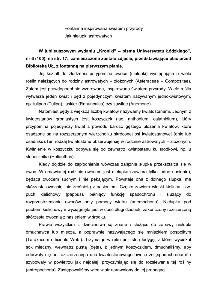 Fontanna inspirowana światem przyrody Jak niełupki astrowatych W jubileuszowym wydaniu „Kroniki” – pisma Uniwersytetu Łódzkiego”, nr 6 (100), na str. 17., zamieszczone zostało zdjęcie, przedstawiające plac przed Biblioteką UŁ, z fontanną na pierwszym planie. Jej kształt do złudzenia przypomina owoce (niełupki) występujące u wielu roślin należących do rodziny astrowatych – złożonych (Asteraceae – Compositae). Zatem jest prawdopodobnie wzorowana, inspirowana światem przyrody. Wiele roślin wytwarza jeden kwiat i pęd z pojedynczym kwiatem nazywanym jednokwiatowym, np. tulipan (Tulipa), jaskier (Ranunculus) czy zawilec (Anemone). Natomiast pędy z większą liczbą kwiatów nazywamy kwiatostanami. Jednym z kwiatostanów groniastych jest koszyczek (łac. anthodium, calathidium), który przypomina pojedynczy kwiat z powodu bardzo gęstego ułożenia kwiatów, które osadzone są na rozszerzonym wierzchołku skróconej osi kwiatostanowej (dnie lub osadniku).Ten rodzaj kwiatostanu obserwuje się w rodzinie astrowatych – złożonych. Kwitnienie w koszyczku odbywa się od zewnątrz kwiatostanu ku środkowi, np. u słonecznika (Helianthus). Kiedy dojdzie do zapłodnienia wówczas zalążnia słupka przekształca się w owoc. W omawianej rodzinie owocem jest niełupka (zawiera tylko jedno nasienie), będąca owocem suchym i nie pękającym. Powstaje ona z dolnego słupka, ma skórzastą owocnię, nie zrośniętą z nasieniem. Często zawiera włoski kielicha, tzw. puch kielichowy (pappus), pełniący funkcję spadochronu i służący do rozprzestrzeniania owoców przy pomocy wiatru (anemochoria). Niełupka pod puchem kielichowym wyciągnięta jest w dość długi dzióbek, zakończony rozszerzoną skórzastą owocnią z nasieniem w środku. Prawie wszystkim z dzieciństwa są znane i służące do zabawy niełupki dmuchawca lub mlecza, a poprawnie nazywającego się mniszkiem pospolitym (Taraxacum officinale Web.). Trzymając w ręku bezlistną łodygę, z której wyciekał sok mleczny, wewnątrz pustą (dętą), z jednym koszyczkiem, dmuchaliśmy, aby oderwały się od rozszerzonego dna kwiatostanowego owoce ze „spadochronami” i szybowały w powietrzu jak najdalej, przyczyniając się do rozsiewania tej rośliny (antropochoria). Zastępowaliśmy więc wiatr uprawniony do jej propagacji. Po oderwaniu owoców ukazywało się rozszerzone dno kwiatostanowe, przypominające ogoloną głowę mnicha i stąd jego prawidłowa nazwa. Zadanie nasze było tym łatwiejsze, że roślina występuje prawie wszędzie w całej Polsce, jak mówi jej nazwa gatunkowa – pospolicie, na łąkach, przydrożach, zaroślach, nieużytkach, skwerach, trawnikach, w sadach, ogrodach itp. To roślina lecznicza, pastewna i miododajna. Być może fontanna przy Bibliotece Uniwersytetu Łódzkiego jest wzorowana na owocach innych rodzajów, należących do tej samej rodziny, ale znacznie większych, jak: brodawnik (Leontodon L.), kozibród (Tragopogon Tourn.), mlecz [Sonchus (Tourn.)L.] lub innych, ale o to należałoby zapytać autora projektu. Najważniejsze jednak, że wodotrysk ten jest interesującym i atrakcyjnym elementem przestrzeni publicznej, jaką jest plac usytuowany wśród różnych obiektów uniwersyteckich: uczelnianą książnicą, Wydziałem Zarządzania oraz XIV Domem Studenckim. Walory fontanny szczególnie zyskują na znaczeniu w upalne dni, kiedy to w jej sąsiedztwie można poszukać ochłody i odetchnąć rześkim powietrzem. JAN T. SICIŃSKI