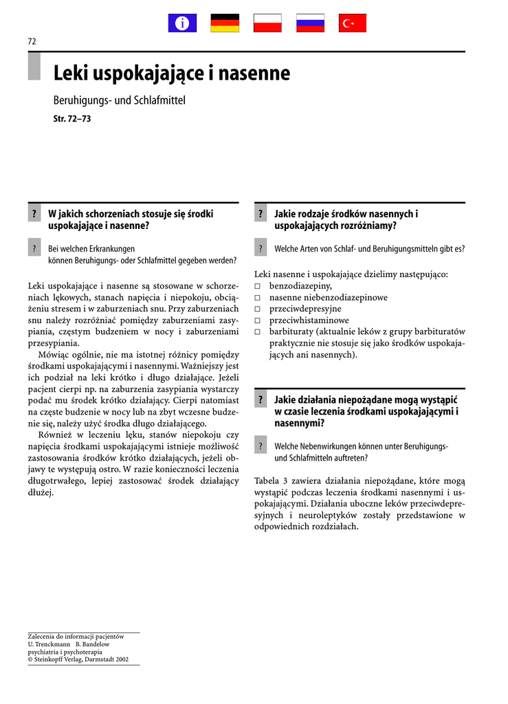 72 Leki uspokajające i nasenne Beruhigungs- und Schlafmittel Str. 72–73 ? W jakich schorzeniach stosuje się środki uspokajające i nasenne? ? Jakie rodzaje środków nasennych i uspokajających rozróżniamy? ? Bei welchen Erkrankungen können Beruhigungs- oder Schlafmittel gegeben werden? ? Welche Arten von Schlaf- und Beruhigungsmitteln gibt es? Leki uspokajające i nasenne są stosowane w schorzeniach lękowych, stanach napięcia i niepokoju, obciążeniu stresem i w zaburzeniach snu. Przy zaburzeniach snu należy rozróżniać pomiędzy zaburzeniami zasypiania, częstym budzeniem w nocy i zaburzeniami przesypiania. Mówiąc ogólnie, nie ma istotnej różnicy pomiędzy środkami uspokajającymi i nasennymi. Ważniejszy jest ich podział na leki krótko i długo działające. Jeżeli pacjent cierpi np. na zaburzenia zasypiania wystarczy podać mu środek krótko działający. Cierpi natomiast na częste budzenie w nocy lub na zbyt wczesne budzenie się, należy użyć środka długo działającego. Również w leczeniu lęku, stanów niepokoju czy napięcia środkami uspokajającymi istnieje możliwość zastosowania środków krótko działających, jeżeli objawy te występują ostro. W razie konieczności leczenia długotrwałego, lepiej zastosować środek działający dłużej. Zalecenia do informacji pacjentów U. Trenckmann B. Bandelow psychiatria i psychoterapia © Steinkopff Verlag, Darmstadt 2002 Leki nasenne i uspokajające dzielimy następująco: benzodiazepiny, nasenne niebenzodiazepinowe przeciwdepresyjne przeciwhistaminowe barbituraty (aktualnie leków z grupy barbituratów praktycznie nie stosuje się jako środków uspokajających ani nasennych). ? Jakie działania niepożądane mogą wystąpić w czasie leczenia środkami uspokajającymi i nasennymi? ? Welche Nebenwirkungen können unter Beruhigungsund Schlafmitteln auftreten? Tabela 3 zawiera działania niepożądane, które mogą wystąpić podczas leczenia środkami nasennymi i uspokajającymi. Działania uboczne leków przeciwdepresyjnych i neuroleptyków zostały przedstawione w odpowiednich rozdziałach. Leki uspokajające i nasenne Tabela 3. Skutki uboczne środków nasennych i uspokajających. Ze względu na ograniczone miejsce wymienione zostały tylko niektóre ważne skutki uboczne. Bliższe informacje znajdują się na ulotce leku. Grupa Skutki uboczne Benzodiazepiny Nie-benzodiazepinowe Przeciwdepresyjne Neuroleptyki Przeciwhistaminowe Zmęczenie, zawroty głowy, wydłużenie czasu reakcji, zaburzenia pamięci, mowy, ruchowe, słabość mięśni, depresja oddechowa, zapominanie, niewyraźna mowa, zmniejszenie napędu, rozwój uzależnienia i inne Reakcje alergiczne, gorzki smak, senność, zawroty głowy, suchość w jamie ustnej, bóle głowy, nudności, środki nasenne wymioty, biegunki, słabość mięśni, niepewność ruchów i chodu, niewyraźna mowa, zabuzencia, pamięci, rozwój uzależnienia itd. Senność, niskie ciśnienie, zawroty głowy, suchość w jamie ustnej, szybki puls itd. Senność, niskie ciśnienie, przyrost wagi ciała, pozapiramidowe zaburzenia ruchowe (toniczne skurcze mięśni języka i gałek ocznych, sztywność mięśni, drżenie, niepokój ruchowy), zmiany w rozmazie krwi, późne dyskinezy (występowanie ruchów języka i ust po długoletnim leczeniu) itd. Senność, alergie, zaburzenia żołądkowo-jelitowe, zaburzenia przy oddawaniu moczu, widzenia itd. ? Czy od środków nasennych i uspokajających można się uzależnić? ? Können Beruhigungs- und Schlafmittel abhängig machen? Benzodiazepiny, barbituraty, nowe niebenzodiazepinowe leki nasenne i inne mogą prowadzić do uzależnienia. Nie znane są uzależniena podczas terapii lekami przeciwdepresyjnymi, przeciwhistaminowymi, neuroleptykami i chloraldurtem.W przypadku nowych tzw. niebenzodiazepin uzależnienie występuje ewentualnie rzadziej niż przy benzodiazepinach. Nie każdy przyjmujący te środki uzależnia się. Nałóg może się rozwinąć przy zażywaniu przez dłuższy czas wyższych dawek. Charakterystyczna dla rozwoju nałogu jest konieczność dalszego zwiększania dawki. 73 Ważne jest, czy u pacjenta występuje tak zwana „osobowość zależna“. Jeżeli pacjent już wcześniej miał problemy z odejściem od alkoholu lub pewnych środków uspokajających czy przeciwbólowych, nie zaleca się stosowania środków z potencjałem uzależniającym. Jeżeli pacjent zaobserwuje u siebie, że zażywa dany środek już dłuższy czas i przy tym ewentualnie wielokrotnie zwiększał dawkę powinien porozmawiać z lekarzem, czy nie wpadł w nałóg. Jeżeli zaczął już starać się o tabletki u wielu lekarzy lub inaczej je organizować, nadszedł czas aby pomyśleć o terapii odwykowej. ? Jak długo wolno lub powinno się zażywać środki uspokajające i nasenne? ? Wie lange darf und soll man Beruhigungsund Schlafmittel einnehmen? Większości środków uspokajających nie należy zażywać przez dłuższy czas. Leczenie z reguły nie powinno przekraczać trzech, najdłużej ośmiu miesięcy. Lekarz i pacjent powinni omówić, kiedy trzeba zakończyć zażywanie leku. ? Czy istnieją naturalne środki uspokajające i nasenne? ? Gibt es natürliche Beruhigungs- und Schlafmittel? Wiele ziół posiada właściwości uspokajające: korzenie waleriany, szyszki chmielowe, liście melisy, krzew męczennicy, ziele dziurawca, Kava-Kava i kwiaty lawendy. Istnieje wiele preparatów zawierających wyciągi z tych roślin w różnych kombinacjach. Działanie większości tych preparatów nie jest ściśle naukowo udowodnione. W cięższych zaburzeniach snu i lękach mogą one okazać się zbyt słabe. Zalecenia do informacji pacjentów U. Trenckmann B. Bandelow psychiatria i psychoterapia © Steinkopff Verlag, Darmstadt 2002