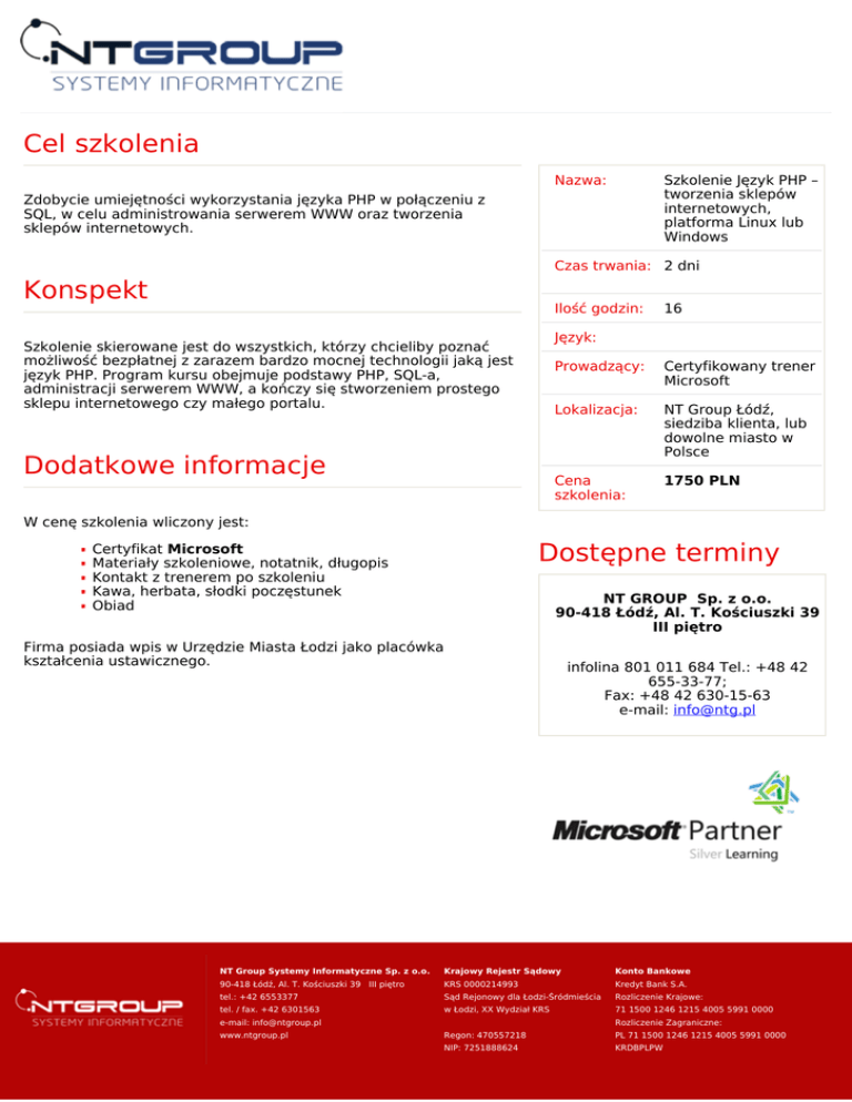 Cel szkolenia Nazwa: Szkolenie Język PHP – tworzenia sklepów internetowych, platforma Linux lub Windows Zdobycie umiejętności wykorzystania języka PHP w połączeniu z SQL, w celu administrowania serwerem WWW oraz tworzenia sklepów internetowych. Czas trwania: 2 dni Konspekt Ilość godzin: 16 Język: Szkolenie skierowane jest do wszystkich, którzy chcieliby poznać możliwość bezpłatnej z zarazem bardzo mocnej technologii jaką jest język PHP. Program kursu obejmuje podstawy PHP, SQL-a, administracji serwerem WWW, a kończy się stworzeniem prostego sklepu internetowego czy małego portalu. Dodatkowe informacje Prowadzący: Certyfikowany trener Microsoft Lokalizacja: NT Group Łódź, siedziba klienta, lub dowolne miasto w Polsce Cena szkolenia: 1750 PLN W cenę szkolenia wliczony jest: Dostępne terminy Certyfikat Microsoft Materiały szkoleniowe, notatnik, długopis Kontakt z trenerem po szkoleniu Kawa, herbata, słodki poczęstunek Obiad NT GROUP Sp. z o.o. 90-418 Łódź, Al. T. Kościuszki 39 III piętro Firma posiada wpis w Urzędzie Miasta Łodzi jako placówka kształcenia ustawicznego. infolina 801 011 684 Tel.: +48 42 655-33-77; Fax: +48 42 630-15-63 e-mail: [email protected] NT Group Systemy Informatyczne Sp. z o.o. Krajowy Rejestr Sądowy Konto Bankowe 90-418 Łódź, Al. T. Kościuszki 39 III piętro KRS 0000214993 Kredyt Bank S.A. tel.: +42 6553377 Sąd Rejonowy dla Łodzi-Śródmieścia Rozliczenie Krajowe: tel. / fax. +42 6301563 w Łodzi, XX Wydział KRS 71 1500 1246 1215 4005 5991 0000 e-mail: [email protected] www.ntgroup.pl Rozliczenie Zagraniczne: Regon: 470557218 PL 71 1500 1246 1215 4005 5991 0000 NIP: 7251888624 KRDBPLPW