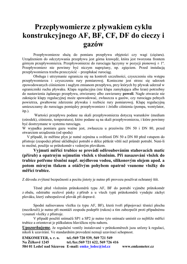 Przepływomierze z pływakiem cyklu konstrukcyjnego AF, BF, CF, DF do cieczy i gazów Przepływomierze służą do pomiaru przepływu objętości czy wagi (ciężaru). Urządzeniem do odczytywania przepływu jest górna krawędź, która jest tworzona frontem górnym przepływomierza. Przepływomierze do rurociągu łączymy w pozycji pionowej ± 1º. Przepływomierz nie powinny być niczym naprężany, np. zgięciem. Przed instalacją przepływomierza trzeba przeczyścić – przepłukać rurociąg. Obsługa i utrzymanie ogranicza się na kontroli szczelności, czyszczeniu sita wstępu przepływomierza i czyszczeniu rury pomiarowej. Konieczne jest strzec się uderzeń zpowodowanych ciśnieniem i nagłym zmianom przepływu, przy których by pływak uderzał w ograniczniki ruchu pływaku. Klapa regulacyjna (nie klapa zamykająca albo kran) potrzebny do nastawienia żądanego przepływu, otwieramy albo zawieramy powoli. Nagłe otwarcie nie zaknięcie klapy regulacyjnej może spowodować, zwłaszcza u gazów, czy rurociągu pełnych powietrza, gwałtowne zderzenie pływaku i rozbicie rury pomiarowej. Klapę regulacyjną umieszczamy do rurociągu pomiędzy przepływomierz i źródło ciśnienia (pompa, wentylator, itp.). Wartości przepływu podane na skali przepływomierza dotyczą warunków (medium (ośrodek), ciśnienie, temperatura), które podane są na skali przepływomierza, i które powinny być dostrzymane w systemu rurociągu. W wypadku pomiaru gazu ważne jest, zwłaszcza u prześwitu DN 50 i DN 80, przed otwarciem urządzenia (od spodu) V případě, že měříme plyn je nutné zejména u světlostí DN 50 a DN 80 před vstupem do přístroje (zespodu) přímé uklidňující potrubí o délce pětkrát větší než průměr potrubí. Není-li to možné, použije se průtokoměr s vedeným plovákem. Vyjmutí měřící trubice se provádí odšroubováním stahovacích matic (přírub) a opatrným sejmutím vložek s těsněním. Při nasazování vložek do trubice potřeme těsnění např. mýdlovou vodou, silikonovým olejem apod. a potom mírným tlakem a otáčivým pohybem opatrně vsuneme vložky do měřící trubice. Z důvodu zvýšené bezpečnosti a pocitu jistoty je nutno při provozu používat ochranný štít. Těsně před vložením průtokoměrů typu AF, BF do potrubí vyjměte průtokoměr z obalu, odstraňte ocelové pásky z přírub a u všech typů průtokoměrů vyndejte záchyt plováku, který zabezpečoval plovák při dopravě. Spodní nalisovanou vložku (u typu AF, BF), která tvoří připojovací těsnící plochu (mezikruží) je nutno při montáži zespodu podepřít (rukou) a tím zabezpečit proti případnému vysunutí vložky z přístroje. V případě použití snímačů SP1 a SP2 je nutno tyto snímače umístit co nejblíže měřící trubice a orientovat je půlkulatou hlavičkou nýtu nahoru. Upozorňujeme, že regulační ventily instalované v průtokoměrech jsou určeny k regulaci, nikoli k uzavírání. Ve standardním provedení nemají uzavírací schopnost. EMKOMETER, s. r. o. tel.:569 720 539, 569 721 549 Na Žižkově 1245 tel./fax:569 721 622, 569 726 416 584 01 Ledeč nad Sázavou E-mail: [email protected] www.emkometer.cz Provozní teplota Provozní tlak 0 – 100 º C 1 MPa (bez tlakových rázů) EMKOMETER, s. r. o. tel.:569 720 539, 569 721 549 Na Žižkově 1245 tel./fax:569 721 622, 569 726 416 584 01 Ledeč nad Sázavou E-mail: [email protected] www.emkometer.cz
