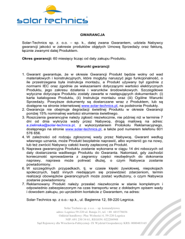 GWARANCJA Solar-Technics sp. z. o.o. – sp. k., dalej zwana Gwarantem, udziela Nabywcy gwarancji jakości w zakresie produktów objętych Umową Sprzedaży oraz fakturą, łącznie zwanymi dalej Produktem. Okres gwarancji: 60 miesięcy licząc od daty zakupu Produktu. Warunki gwarancji 1. Gwarant gwarantuje, że w okresie Gwarancji Produkt będzie wolny od wad materiałowych i konstrukcyjnych, które mogłyby naruszyć jego funkcjonalność, o ile przestrzegana była instrukcja montażu, a Produkt używany był zgodnie z normami IEC oraz zgodnie ze wskazaniami dotyczącymi wartości elektrycznych Produktu, jego zakresu działania i warunków środowiskowych. Szczegółowe wytyczne dotyczące Produktu zostały zawarte w następujących dokumentach: (i) karta katalogowa Produktu, (ii) Instrukcja montażu oraz (iii) Ogólne Warunki Sprzedaży. Powyższe dokumenty są dostarczane wraz z Produktem, lub są dostępne na stronie internetowej www.solar-technics.pl, na podstronie Produkty. 2. Gwarancja nie obejmuje degradacji świetlnej Produktu w okresie Gwarancji poniżej 15% nominalnej wartości strumienia świetlnego. 3. Roszczenia gwarancyjne należy zgłosić niezwłocznie, nie później niż w terminie 7 dni od dnia wykrycia wady przez Nabywcę, drogą mailową na adres: [email protected], z wykorzystaniem Protokołu Reklamacyjnego, dostępnego na stronie www.solar-technics.pl, a także pod numerem telefonu 601 576 656. 4. W zależności od rodzaju zgłoszonej wady przez Nabywcę, Gwarant według własnego uznania, może Produkt bezpłatnie naprawić, albo wymienić go na nowy, lub też zwrócić Nabywcy całość kwoty zapłaconej za Produkt. 5. Naprawa gwarancyjna Produktu zostanie wykonana w ciągu 14 dni roboczych od daty dostarczenia wadliwego Produktu do Gwaranta. Natomiast, gdy zachodzi konieczność sprowadzenia z zagranicy części niezbędnych do dokonania naprawy, naprawa może potrwać dłużej, o czym Nabywca zostanie powiadomiony. 6. W szczególnych przypadkach, tj. w czasie klęski żywiołowej, niepokojach społecznych, bądź innych niedającym się przewidzieć zdarzeniom, termin realizacji obowiązków gwarancyjnych może zostać wydłużony, o czym Nabywca zostanie powiadomiony. 7. Reklamowany Produkt należy przesłać niezwłocznie w stanie kompletnym i odpowiednio zabezpieczonym na czas transportu wraz z dokładnym opisem wady i dowodem zakupu, po uprzednim kontakcie z Gwarantem, na adres: Solar-Technics sp. z o.o.- sp.k., ul. Bagienna 12, 59-220 Legnica. Solar Technics sp. z o.o. – sp. komandytowa adres: Legnica 59-220 ul. Rataja 21, tel. +48 601578656 Oddział handlowy: Plac Wolności 4, 59-220 Legnica NIP: 691 250 34 61, REGON: 022284948 Sąd Rejonowy dla Wrocławia-Fabrycznej- IX Wydział Gospodarczy KRS: 0000483165 8. Po dokonanej naprawie Produkt jest odbierany przez Nabywcę od Gwaranta pod wyżej wskazanym adresem, lub przesyłany na adres wskazany przez Nabywcę na koszt Gwaranta. 9. W przypadku uznania Gwarancji, koszty przesyłki o standardowej, rynkowej wysokości dla danego Produktu, od Nabywcy do Gwaranta oraz od Gwaranta do Nabywcy, pokrywa Gwarant. 10. Odpowiedzialność Gwaranta ograniczona jest maksymalnie do wartości zakupionego Produktu. 11. Okres gwarancji ulega przedłużeniu o czas, w ciągu którego wskutek wady Produktu Nabywca nie mógł z niego korzystać. 12. Realizacja świadczenia gwarancyjnego nie powoduje rozpoczęcia nowego okresu gwarancji. 13. Niniejsza Gwarancja nie ma zastosowania w przypadkach niemożności działania Produktu, ani szkód w Produkcie, które wynikają ze zdarzeń Siły Wyższej. 14. Niniejsza Gwarancja wyłącza odpowiedzialność Gwaranta za prawidłowość montażu Produktu, czy za zapewnienie dostępu do Produktu, lub za ewentualne szkody Nabywcy, spowodowane brakiem działania Produktu. 15. Gwarancja nie obejmuje naturalnego zużycia wykorzystanych materiałów, które mogą̨ ulec odbarwieniom z upływem czasu, czy też wskutek działania czynników atmosferycznych. 16. Niniejsza Gwarancja nie ma zastosowania w odniesieniu do wad Produktu powstałych: • w wyniku zastosowania Produktu niezgodnie z jego przeznaczeniem, w tym w zakresie spowodowanym uszkodzeniami mechanicznymi, • na skutek niewłaściwej instalacji i obsługi Produktu, • na skutek zastosowania niewłaściwych urządzeń towarzyszących, np. przy niezgodnym z zakresem pracy Produktu zwiększaniu mocy, napięcia, lub natężenia, • w wyniku niewłaściwego podłączenia przewodów, • w wyniku niezastosowania odpowiednich zabezpieczeń elektrycznych, • w trakcie niewłaściwego przechowywania, bądź też niewłaściwego transportu, • w wyniku funkcjonowania Produktu w niewłaściwej temperaturze otoczenia (tj. poniżej -30°C oraz powyżej 40°C). • z powodu nieautoryzowanej, samodzielnej naprawy, czy jakiejkolwiek modyfikacji Produktu. • w wyniku działań Siły Wyższej, np. w wyniku powodzi, czy wyładowania atmosferycznego. Solar Technics sp. z o.o. – sp. komandytowa adres: Legnica 59-220 ul. Rataja 21, tel. +48 601578656 Oddział handlowy: Plac Wolności 4, 59-220 Legnica NIP: 691 250 34 61, REGON: 022284948 Sąd Rejonowy dla Wrocławia-Fabrycznej- IX Wydział Gospodarczy KRS: 0000483165 17. Uszkodzenie Produktu w wyniku działań opisanych w pkt. 16 niniejszego dokumentu, powoduje utratę̨ uprawnień́ płynących z Gwarancji. 18. W przypadku nieuzasadnionego zgłoszenia wady Produktu, powstałej, w wyniku działań opisanych w pkt 16, koszty przesyłki Produktu oraz jego ewentualnej naprawy pokrywa Nabywca. 19. W przypadkach nieuregulowanych niniejszą Gwarancją, zastosowanie mają przepisy Kodeksu Cywilnego, przepisy prawa konsumenckiego oraz Ogólne Warunki Sprzedaży. 20. Gwarancja jest ważna wyłącznie z dowodem zakupu, czyli np. wraz z Umową Sprzedaży i/lub fakturą sprzedaży, bądź paragonem sprzedaży. Solar Technics sp. z o.o. – sp. komandytowa adres: Legnica 59-220 ul. Rataja 21, tel. +48 60157865
