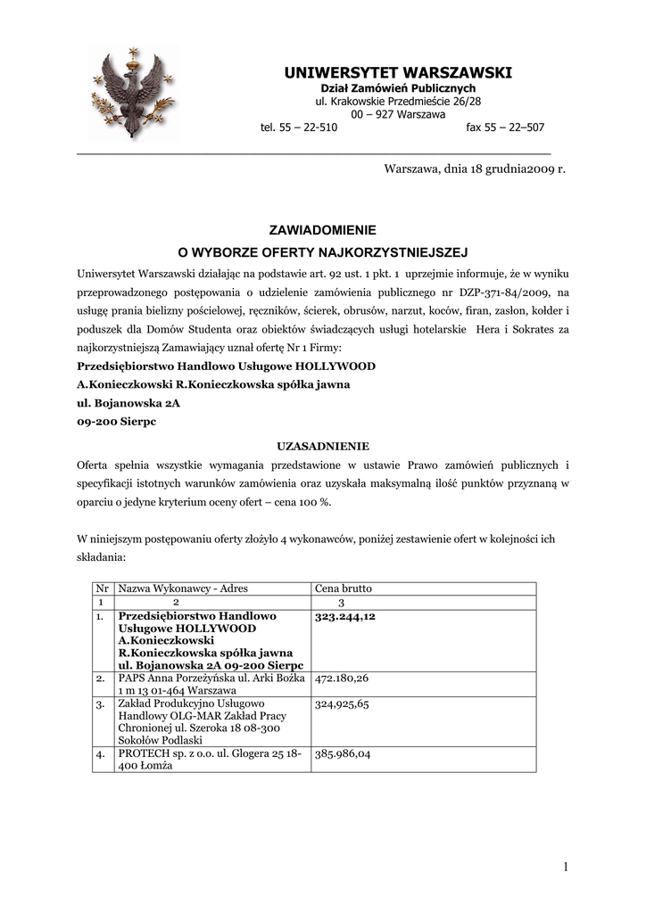 UNIWERSYTET WARSZAWSKI Dział Zamówień Publicznych ul. Krakowskie Przedmieście 26/28 00 – 927 Warszawa tel. 55 – 22-510 fax 55 – 22–507 ________________________________________________________________________________ Warszawa, dnia 18 grudnia2009 r. ZAWIADOMIENIE O WYBORZE OFERTY NAJKORZYSTNIEJSZEJ Uniwersytet Warszawski działając na podstawie art. 92 ust. 1 pkt. 1 uprzejmie informuje, że w wyniku przeprowadzonego postępowania o udzielenie zamówienia publicznego nr DZP-371-84/2009, na usługę prania bielizny pościelowej, ręczników, ścierek, obrusów, narzut, koców, firan, zasłon, kołder i poduszek dla Domów Studenta oraz obiektów świadczących usługi hotelarskie Hera i Sokrates za najkorzystniejszą Zamawiający uznał ofertę Nr 1 Firmy: Przedsiębiorstwo Handlowo Usługowe HOLLYWOOD A.Konieczkowski R.Konieczkowska spółka jawna ul. Bojanowska 2A 09-200 Sierpc UZASADNIENIE Oferta spełnia wszystkie wymagania przedstawione w ustawie Prawo zamówień publicznych i specyfikacji istotnych warunków zamówienia oraz uzyskała maksymalną ilość punktów przyznaną w oparciu o jedyne kryterium oceny ofert – cena 100 %. W niniejszym postępowaniu oferty złożyło 4 wykonawców, poniżej zestawienie ofert w kolejności ich składania: Nr Nazwa Wykonawcy - Adres 1 2 1. Przedsiębiorstwo Handlowo Usługowe HOLLYWOOD A.Konieczkowski R.Konieczkowska spółka jawna ul. Bojanowska 2A 09-200 Sierpc 2. PAPS Anna Porzeżyńska ul. Arki Bożka 1 m 13 01-464 Warszawa 3. Zakład Produkcyjno Usługowo Handlowy OLG-MAR Zakład Pracy Chronionej ul. Szeroka 18 08-300 Sokołów Podlaski 4. PROTECH sp. z o.o. ul. Glogera 25 18400 Łomża Cena brutto 3 323.244,12 472.180,26 324,925,65 385.986,04 1 STRESZCZENIE OCENY i PORÓWNANIA ZŁOŻONYCH OFERT Won(wskaźnik oceny oferty) Razem pkt. 1 100,00 100,00 2 68,45 68,45 3 99.48 99.48 4 83,74 83,74 NR ofe rty W przeprowadzonym postępowaniu żaden wykonawca nie został wykluczony i żadna oferta nie została odrzucona. Z poważaniem Pełnomocnik Rektora ds. planowania strategicznego i zamówień publicznych mgr Kazimierz Dukaczewski 2