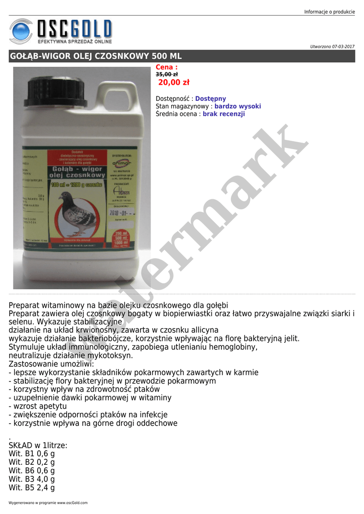 Informacje o produkcie Utworzono 07-03-2017 GOŁĄB-WIGOR OLEJ CZOSNKOWY 500 ML Cena : 35,00 zł 20,00 zł at er m ar k Dostępność : Dostępny Stan magazynowy : bardzo wysoki Średnia ocena : brak recenzji w Preparat witaminowy na bazie olejku czosnkowego dla gołębi Preparat zawiera olej czosnkowy bogaty w biopierwiastki oraz łatwo przyswajalne związki siarki i selenu. Wykazuje stabilizacyjne działanie na układ krwionośny, zawarta w czosnku allicyna wykazuje działanie bakteriobójcze, korzystnie wpływając na florę bakteryjną jelit. Stymuluje układ immunologiczny, zapobiega utlenianiu hemoglobiny, neutralizuje działanie mykotoksyn. Zastosowanie umożliwi: - lepsze wykorzystanie składników pokarmowych zawartych w karmie - stabilizację flory bakteryjnej w przewodzie pokarmowym - korzystny wpływ na zdrowotność ptaków - uzupełnienie dawki pokarmowej w witaminy - wzrost apetytu - zwiększenie odporności ptaków na infekcje - korzystnie wpływa na górne drogi oddechowe . SKŁAD w 1litrze: Wit. B1 0,6 g Wit. B2 0,2 g Wit. B6 0,6 g Wit. B3 4,0 g Wit. B5 2,4 g Wygenerowano w programie www.oscGold.com Sorbitol 3,0 g olejki: czosnkowy, kolendra wypełniacz do 1000 ml w at er m ar k DAWKOWANIE: Gołębie dorosłe -1-2 ml/ 1 L wody przez 3-5 dni zalecane powtórzenia co 7-10 dni Gołębie młode – 0,5-1 ml/ 1 L wody przez 3-5 dni zalecane powtórzenia co 7-10 dni Do podawania z karma należy 1ml preparaty rozcieńczyć w 5 ml wody i następnie wymieszać z karmą