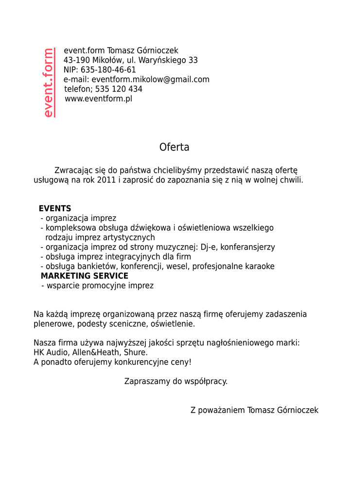 event.form Tomasz Górnioczek 43-190 Mikołów, ul. Waryńskiego 33 NIP: 635-180-46-61 e-mail: [email protected] telefon; 535 120 434 www.eventform.pl Oferta Zwracając się do państwa chcielibyśmy przedstawić naszą ofertę usługową na rok 2011 i zaprosić do zapoznania się z nią w wolnej chwili. EVENTS - organizacja imprez - kompleksowa obsługa dźwiękowa i oświetleniowa wszelkiego rodzaju imprez artystycznych - organizacja imprez od strony muzycznej: Dj-e, konferansjerzy - obsługa imprez integracyjnych dla firm - obsługa bankietów, konferencji, wesel, profesjonalne karaoke MARKETING SERVICE - wsparcie promocyjne imprez Na każdą imprezę organizowaną przez naszą firmę oferujemy zadaszenia plenerowe, podesty sceniczne, oświetlenie. Nasza firma używa najwyższej jakości sprzętu nagłośnieniowego marki: HK Audio, Allen&Heath, Shure. A ponadto oferujemy konkurencyjne ceny! Zapraszamy do współpracy. Z poważaniem Tomasz Górnioczek