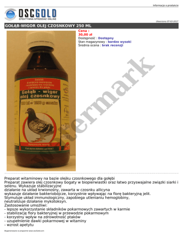 Informacje o produkcie Utworzono 07-03-2017 GOŁĄB-WIGOR OLEJ CZOSNKOWY 250 ML Cena : 30,00 zł w at er m ar k Dostępność : Dostępny Stan magazynowy : bardzo wysoki Średnia ocena : brak recenzji Preparat witaminowy na bazie olejku czosnkowego dla gołębi Preparat zawiera olej czosnkowy bogaty w biopierwiastki oraz łatwo przyswajalne związki siarki i selenu. Wykazuje stabilizacyjne działanie na układ krwionośny, zawarta w czosnku allicyna wykazuje działanie bakteriobójcze, korzystnie wpływając na florę bakteryjną jelit. Stymuluje układ immunologiczny, zapobiega utlenianiu hemoglobiny, neutralizuje działanie mykotoksyn. Zastosowanie umożliwi: - lepsze wykorzystanie składników pokarmowych zawartych w karmie - stabilizację flory bakteryjnej w przewodzie pokarmowym - korzystny wpływ na zdrowotność ptaków - uzupełnienie dawki pokarmowej w witaminy - wzrost apetytu Wygenerowano w programie www.oscGold.com - zwiększenie odporności ptaków na infekcje - korzystnie wpływa na górne drogi oddechowe . SKŁAD w 1litrze: Wit. B1 0,6 g Wit. B2 0,2 g Wit. B6 0,6 g Wit. B3 4,0 g Wit. B5 2,4 g Sorbitol 3,0 g olejki: czosnkowy, kolendra wypełniacz do 1000 ml w at er m ar k DAWKOWANIE: Gołębie dorosłe -1-2 ml/ 1 L wody przez 3-5 dni zalecane powtórzenia co 7-10 dni Gołębie młode – 0,5-1 ml/ 1 L wody przez 3-5 dni zalecane powtórzenia co 7-10 dni Do podawania z karma należy 1ml preparaty rozcieńczyć w 5 ml wody i następnie wymieszać z karmą