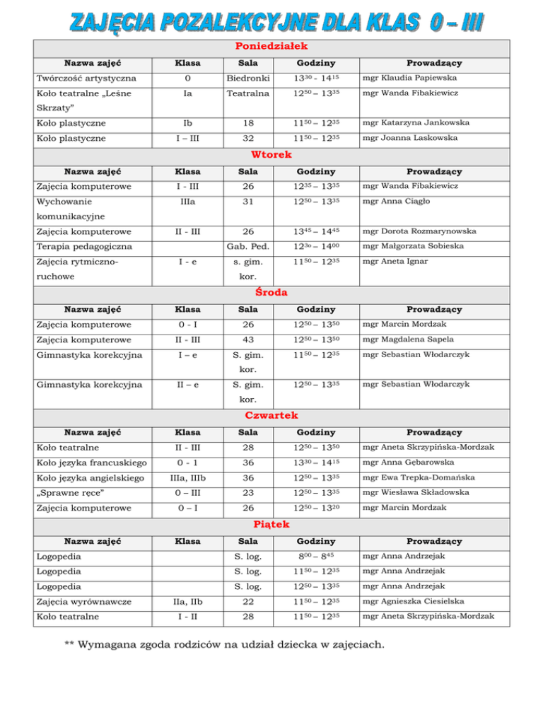 ** Wymagana zgoda rodziców na udział dziecka w zajęciach