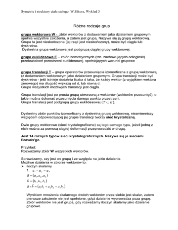 Symetrie i struktury ciała stałego. W.Sikora, Wyklad 3 RóŜne rodzaje grup grupa wektorowa W - zbiór wektorów z dodawaniem jako działaniem grupowym spełnia wszystkie załoŜenia, a zatem jest grupą. Nazywa się ją grupą wektorową. Grupa ta jest nieskończona (jej rząd jest nieskończony), moŜe być ciągła lub dyskretna. Dyskretna grupa wektorowa jest podgrupą ciągłej grupy wektorowej. grupa euklidesowa E – zbiór izometrycznych (tzn. zachowujących odległość) przekształceń przestrzeni euklidesowej, spełniających warunki grupowe grupa translacji T – grupa operatorów przesunięcia izomorficzna z grupą wektorową (z dodawaniem wektorowym jako działaniem grupowym. Grupa translacji moŜe być dyskretna - jeśli istnieje dodatnia liczba d taka, Ŝe kaŜdy wektor (z wyjątkiem wektora zerowego) ma długość większą od d, lub równą d. Grupa wszystkich moŜliwych translacji jest ciągła. Grupa translacji jest po prostu grupą utworzoną z wektorów (wektorów przesunięć), o jakie moŜna dokonać przesunięcia danego punktu przestrzeni. Grupa translacji jest podgrupą grupy euklidesowej ( T ⊂ E ). Dyskretny zbiór punktów izomorficzny z dyskretną grupą wektorową, niezmienniczy względem odpowiadającej jej grupie translacji tworzy sieć krystaliczną. Dwie grupy wektorowe (sieci krystalograficzne) są tego samego typu, jeŜeli jedną z nich moŜna za pomocą ciągłej deformacji przeprowadzić w drugą. Jest 14 róŜnych typów sieci krystalograficznych. Nazywa się je sieciami Bravais'go. Przykład: RozwaŜamy zbiór W wszystkich wektorów. Sprawdzamy, czy jest on grupą i ze względu na jakie działanie. MoŜliwe działania w zbiorze wektorów to: iloczyn skalarny 1. g i o g j = g n r a = (a1 , a 2 , a 3 ) r b = (b1 , b2 , b3 ) r r a o b = (a1b1 + a 2 b2 + a3 b3 ) Wynikiem mnoŜenia skalarnego dwóch wektorów przez siebie jest skalar, zatem pierwsze załoŜenie nie jest spełnione, gdyŜ działanie wyprowadza poza grupę. Zbiór wektorów nie jest grupą, gdy rozwaŜamy iloczyn skalarny jako działanie grupowe. Symetrie i struktury ciała stałego. W.Sikora, Wyklad 3 iloczyn wektorowy 1. g i o g j = g n r a = (a1 , a 2 , a3 ) r b = (b1 , b2 , b3 ) ˆj kˆ iˆ r r a × b = a1 a2 a3 = iˆ(a 2 b3 − b2 a3 ) − ˆj (a1b3 − b1 a3 ) + kˆ (a1b2 − b1 a 2 ) = b1 b2 b3 r = (a 2 b3 − b2 a 3 , b1 a 3 − a1b3 , a1b2 − b1 a 2 ) = m Pierwsze załoŜenie jest spełnione, gdyŜ w wyniku mnoŜenia wektorowego dwóch wektorów otrzymujemy wektor. 2. g i o (g j o g k ) = (g i o g j ) o g k r a = (a1 , a 2 , a3 ) r b = (b1 , b2 , b3 ) r c = (c1 , c 2 , c3 ) iˆ r r r r a × b × c = a × b1 c1 ( ) ˆj b2 c2 kˆ r b3 = a × iˆ(b2 c3 − c 2 b3 ) − ˆj (b1c3 − c1b3 ) + kˆ(b1c 2 − c1b2 ) = c3 [ ] iˆ r = a × [(b2 c3 − c 2 b3 , c1b3 − b1c3 , b1c 2 − c1b2 )] = a1 b2 c3 − c 2 b3 ˆj a2 c1b3 − b1c3 kˆ = a3 b1c 2 − c1b2 = iˆ[a 2 (b1c 2 − c1b2 ) − a3 (c1b3 − b1c3 )] − ˆj[a1 (b1c 2 − c1b2 ) − a3 (b2 c3 − c 2 b3 )] + + kˆ[a1 (c1b3 − b1c3 ) − a 2 (b2 c3 − c 2 b3 )] = iˆ(a 2 b1c 2 − a 2 b2 c1 − a3b3 c1 + a3b1c3 ) + r + ˆj (a b c − a b c − a b c + a b c ) + kˆ(a b c − a b c − a b c + a b c ) = l 3 2 3 3 3 2 1 1 2 1 2 1 1 3 1 1 1 3 2 2 3 2 3 2 Symetrie i struktury ciała stałego. W.Sikora, Wyklad 3 iˆ r r r a × b × c = a1 ˆj a2 kˆ r r a 3 × c = iˆ(a 2 b3 − b2 a3 ) − ˆj (a1b3 − b1 a3 ) + kˆ(a1b2 − b1a 2 ) × c = b1 b2 b3 ( ) [ ] iˆ r = (a 2 b3 − b2 a 3 , b1 a 3 − a1b3 , a1b2 − b1 a 2 ) × c = a 2 b3 − b2 a3 c1 kˆ ˆj b1 a 3 − a1b3 a1b2 − b1 a 2 = c2 c3 = iˆ[c3 (b1 a 3 − a1b3 ) − c 2 (a1b2 − b1 a 2 )] − ˆj[c3 (a 2 b3 − b2 a3 ) − c1 (a1b2 − b1 a 2 )] + + kˆ[c 2 (a 2 b3 − b2 a 3 ) − c1 (b1 a 3 − a1b3 )] = iˆ(a 3b1c3 − a1b3 c3 − a1b2 c 2 + a 2 b1c 2 ) + r + ˆj (a b c − a b c − a b c + a b c ) + kˆ(a b c − a b c − a b c + a b c ) = m 1 2 1 2 1 1 2 3 3 3 2 3 2 3 2 3 2 2 3 1 1 1 3 1 r r l ≠ m zatem drugie załoŜenie nie jest spełnione. Zbiór wektorów nie jest grupą gdy rozwaŜamy iloczyn wektorowy jako działanie grupowe. MoŜna to zresztą zobaczyć łatwo i bez Ŝmudnych obliczeń rozwaŜając załoŜenie trzecie. Iloczyn wektorowy nie moŜe mieć elementu jednostkowego, gdyŜ wynikiem tego działania jest zawsze wektor prostopadły do dwóch mnoŜonych. Nie moŜna więc znaleźć elementu, który przemnoŜony przez dowolny element zbioru dawałby ten sam element dodawanie wektorowe 1. g i o g j = g n r a = (a1 , a 2 , a3 ) r b = (b1 , b2 , b3 ) r r a + b = (a1 + b1 , a 2 + b2 , a3 + b3 ) - pierwsze załoŜenie jest spełnione, w wyniku dodawania otrzymujemy wektor 2. g i o (g j o g k ) = (g i o g j ) o g k r a = (a1 , a 2 , a3 ) r b = (b1 , b2 , b3 ) r c = (c1 , c 2 , c3 ) r r r r a + b + c = a + (b1 + c1 , b2 + c 2 , b3 + c3 ) = (a1 + b1 + c1 , a 2 + b2 + c 2 , a3 + b3 + c3 ) r r r r a + b + c = (a1 + b1 , a 2 + b2 , a3 + b3 ) + c = (a1 + b1 + c1 , a 2 + b2 + c 2 , a3 + b3 + c3 ) ( ( ) ) Drugie załoŜenie równieŜ jest spełnione. 3. Istnieje e ∈ G - element jednostkowy gi o e = e o gi = gi r Dla dodawania elementem jednostkowym jest wektor zerowy : 0 = (0,0,0 ) r a = (a1 , a 2 , a3 ) r 0 = (0,0,0 ) Symetrie i struktury ciała stałego. W.Sikora, Wyklad 3 r r r r r a + 0 = 0 + a = a = (a1 , a 2 , a3 ) −1 4. Istnieje g i ∈ G - element odwrotny −1 −1 gi o gi = gi o gi = e r W przypadku dodawania wektorów elementem odwrotnym do wektora x jest r wektor do niego przeciwny: − x . r a = (a1 , a 2 , a 3 ) r − a = (− a1 ,−a 2 ,−a3 ) r r r a + (− a ) = (a1 , a 2 , a3 ) + (− a1 ,−a 2 ,−a3 ) = (0,0,0) = 0 Zbiór wektorów z dodawaniem jako działaniem grupowym spełnia wszystkie załoŜenia, a zatem jest grupą. Zanim przejdziemy do wyszukiwania podgrup grupy translacji, zastanówmy się przez chwilę nad definicją dyskretnej grupy translacji (istnieje dodatnia liczba d taka, Ŝe kaŜdy wektor (z wyjątkiem zerowego) ma d