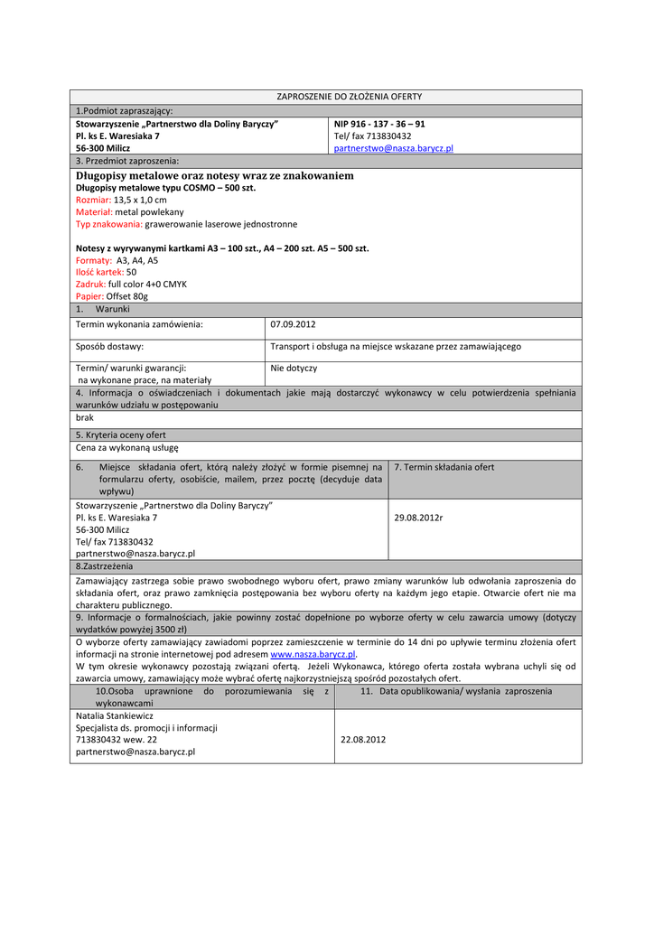 ZAPROSZENIE DO ZŁOŻENIA OFERTY 1.Podmiot zapraszający: Stowarzyszenie „Partnerstwo dla Doliny Baryczy” NIP 916 - 137 - 36 – 91 Pl. ks E. Waresiaka 7 Tel/ fax 713830432 56-300 Milicz [email protected] 3. Przedmiot zaproszenia: Długopisy metalowe oraz notesy wraz ze znakowaniem Długopisy metalowe typu COSMO – 500 szt. Rozmiar: 13,5 x 1,0 cm Materiał: metal powlekany Typ znakowania: grawerowanie laserowe jednostronne Notesy z wyrywanymi kartkami A3 – 100 szt., A4 – 200 szt. A5 – 500 szt. Formaty: A3, A4, A5 Ilość kartek: 50 Zadruk: full color 4+0 CMYK Papier: Offset 80g 1. Warunki Termin wykonania zamówienia: 07.09.2012 Sposób dostawy: Transport i obsługa na miejsce wskazane przez zamawiającego Termin/ warunki gwarancji: Nie dotyczy na wykonane prace, na materiały 4. Informacja o oświadczeniach i dokumentach jakie mają dostarczyć wykonawcy w celu potwierdzenia spełniania warunków udziału w postępowaniu brak 5. Kryteria oceny ofert Cena za wykonaną usługę 6. Miejsce składania ofert, którą należy złożyć w formie pisemnej na 7. Termin składania ofert formularzu oferty, osobiście, mailem, przez pocztę (decyduje data wpływu) Stowarzyszenie „Partnerstwo dla Doliny Baryczy” Pl. ks E. Waresiaka 7 29.08.2012r 56-300 Milicz Tel/ fax 713830432 [email protected] 8.Zastrzeżenia Zamawiający zastrzega sobie prawo swobodnego wyboru ofert, prawo zmiany warunków lub odwołania zaproszenia do składania ofert, oraz prawo zamknięcia postępowania bez wyboru oferty na każdym jego etapie. Otwarcie ofert nie ma charakteru publicznego. 9. Informacje o formalnościach, jakie powinny zostać dopełnione po wyborze oferty w celu zawarcia umowy (dotyczy wydatków powyżej 3500 zł) O wyborze oferty zamawiający zawiadomi poprzez zamieszczenie w terminie do 14 dni po upływie terminu złożenia ofert informacji na stronie internetowej pod adresem www.nasza.barycz.pl. W tym okresie wykonawcy pozostają związani ofertą. Jeżeli Wykonawca, którego oferta została wybrana uchyli się od zawarcia umowy, zamawiający może wybrać ofertę najkorzystniejszą spośród pozostałych ofert. 10.Osoba uprawnione do porozumiewania się z 11. Data opublikowania/ wysłania zaproszenia wykonawcami Natalia Stankiewicz Specjalista ds. promocji i informacji 713830432 wew. 22 22.08.2012 [email protected]