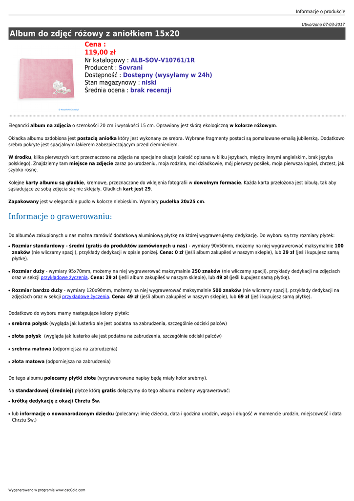 Informacje o produkcie Utworzono 07-03-2017 Album do zdjęć różowy z aniołkiem 15x20 Cena : 119,00 zł Nr katalogowy : ALB-SOV-V10761/1R Producent : Sovrani Dostępność : Dostępny (wysyłamy w 24h) Stan magazynowy : niski Średnia ocena : brak recenzji Elegancki album na zdjęcia o szerokości 20 cm i wysokości 15 cm. Oprawiony jest skórą ekologiczną w kolorze różowym. Okładka albumu ozdobiona jest postacią aniołka który jest wykonany ze srebra. Wybrane fragmenty postaci są pomalowane emalią jubilerską. Dodatkowo srebro pokryte jest spacjalnym lakierem zabezpieczającym przed ciemnieniem. W środku, kilka pierwszych kart przeznaczono na zdjęcia na specjalne okazje (całość opisana w kilku językach, między innymi angielskim, brak języka polskiego). Znajdziemy tam miejsce na zdjęcie zaraz po urodzeniu, moja rodzina, moi dziadkowie, mój pierwszy posiłek, moja pierwsza kąpiel, chrzest, jak szybko rosnę. Kolejne karty albumu są gładkie, kremowe, przeznaczone do wklejenia fotografii w dowolnym formacie. Każda karta przełożona jest bibułą, tak aby sąsiadujące ze sobą zdjęcia się nie sklejały. Gładkich kart jest 29. Zapakowany jest w eleganckie pudło w kolorze niebieskim. Wymiary pudełka 20x25 cm. Informacje o grawerowaniu: Do albumów zakupionych u nas można zamówić dodatkową aluminiową płytkę na której wygrawerujemy dedykację. Do wyboru są trzy rozmiary płytek: ● ● ● Rozmiar standardowy - średni (gratis do produktów zamówionych u nas) - wymiary 90x50mm, możemy na niej wygrawerować maksymalnie 100 znaków (nie wliczamy spacji), przykłady dedykacji w opisie poniżej. Cena: 0 zł (jeśli album zakupiłeś w naszym sklepie), lub 29 zł (jeśli kupujesz samą płytkę). Rozmiar duży - wymiary 95x70mm, możemy na niej wygrawerować maksymalnie 250 znaków (nie wliczamy spacji), przykłady dedykacji na zdjęciach oraz w sekcji przykładowe życzenia. Cena: 29 zł (jeśli album zakupiłeś w naszym sklepie), lub 49 zł (jeśli kupujesz samą płytkę). Rozmiar bardzo duży - wymiary 120x90mm, możemy na niej wygrawerować maksymalnie 500 znaków (nie wliczamy spacji), przykłady dedykacji na zdjęciach oraz w sekcji przykładowe życzenia. Cena: 49 zł (jeśli album zakupiłeś w naszym sklepie), lub 69 zł (jeśli kupujesz samą płytkę). Dodatkowo do wyboru mamy następujące kolory płytek: ● srebrna połysk (wygląda jak lusterko ale jest podatna na zabrudzenia, szczególnie odciski palców) ● złota połysk (wygląda jak lusterko ale jest podatna na zabrudzenia, szczególnie odciski palców) ● srebrna matowa (odporniejsza na zabrudzenia) ● złota matowa (odporniejsza na zabrudzenia) Do tego albumu polecamy płytki złote (wygrawerowane napisy będą miały kolor srebrny). Na standardowej (średniej) płytce którą gratis dołączymy do tego albumu możemy wygrawerować: ● ● krótką dedykację z okazji Chrztu Św. lub informację o nowonarodzonym dziecku (polecamy: imię dziecka, data i godzina urodzin, waga i długość w momencie urodzin, miejscowość i data Chrztu Św.) Wygenerowano w programie www.oscGold.com Na większych płytkach (dużej i bardzo dużej) polecamy wygrawerować wierszyk okolicznościowy, a następnie krótką dedykację, np. "Markowi w dniu Chrztu Świętego Chrzestna Anna. Nazwa miejscowości i data Chrztu". Jeżeli życzycie sobie Państwo płytkę do tego albumu proszę wybrać w opcjach wielkość i kolor płytki, a treść dedykacji lub informacje o dziecku podać w polu "Komentarz do zamówienia" które pojawi się w procesie składania zamówienia (tam gdzie będziemy wybierać sposób wysyłki i płatności) lub przesłać do nas e-mailem na adres: [email protected] podając w temacie wiadomości numer zamówienia. Do każdej płytki przyklejamy mocną cienką taśmę dwustronną zabezpieczoną od zewnątrz i w takiej postaci dołączamy do zamówienia. Każdy kupujący po otrzymaniu przesyłki po ściągnięciu z taśmy warstwy zabezpieczającej (proponujemy użyć ostrego nożyka) mocuje płytkę do produktu samodzielnie. Zgodnie z obowiązującym prawem oraz naszymi procedurami, możecie Państwo zwrócić zakupiony u nas towar bez podawania przyczyny przez 10 dni od dnia dostarczenia przesyłki. Ważne: przyjmujemy jedynie te produkty do których płytka nie została jeszcze przyklejona. Prosimy zatem o dokładne obejrzenie towaru i podjęcie decyzji o ewentualnym zwrocie przed przyklejeniem dostarczonej płytki. Zgodnie z art. 10 pkt. 4 ustawy z dnia 2 marca 2002 roku o ochronie praw konsumentów przy sprzedaży na odległość informujemy, że produkty z grawerunkiem (także z przyklejoną już płytką) są przygotowywane indywidualnie na "zamówienie specjalne", z tego powodu nie ma możliwości ich zwrotu lub anulowania zamówienia. Potrzebujesz więcej informacji? Zobacz: opis produktów z grawerowaniem. PRZYKŁADOWE DEDYKACJE NA PŁYTKACH STANDARDOWYCH (ŚREDNICH) Ze względu na niewielkie rozmiary obrazka tekst grawerowany na płytce powinien być możliwie krótki. Przykładowe dedykacje: Piotrusiowi Piotrusiowi w dniu Chrztu Św. chrzestna Anna z okazji Chrztu Św. Ania i Tomek Kowalscy Warszawa 15.04.2014 Warszawa 15.04.2014 W dniu Chrztu Św. Piotrusiowi wszelkich pomyślności dziadek Tomek Piotruś ur. 01.11.2013, godz. 14:15 waga 3450g, dł. 53cm Warszawa 15.04.2014 Uwaga: nie należy zbyt mocno uciskać powierzchni obrazka, może to spowodować jego wgniecenie. Sposób pielęgnacji: 1. Obrazek należy czyścić wyłącznie czystą i delikatną ściereczką flanelową. 2. Stosować wyłącznie letnią wodę, by nie uszkodzić powłoki ochronnej. Gorąca woda może powodować rozpuszczenie się lakieru chroniącego powierzchnię. 3. Nie używać do czyszczenia zakupionego produktu detergentów, alkoholu i ściernych środków czyszczących, jak też ściereczek przeznaczonych do czyszczenia srebra. Szerokość [cm]: 20 Wysokość [cm]: 15 Kraj pochodzenia: Włochy