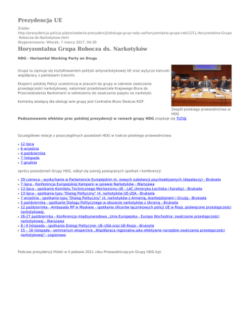 Prezydencja UE Źródło: http://prezydencja.policja.pl/pre/zadania-prezydencji/obsluga-grup-rady-ue/horyzontalna-grupa-rob/1251,Horyzontalna-Grupa -Robocza-ds-Narkotykow.html Wygenerowano: Wtorek, 7 marca 2017, 04:28 Horyzontalna Grupa Robocza ds. Narkotyków HDG - Horizontal Working Party on Drugs Grupa ta zajmuje się kształtowaniem polityki antynarkotykowej UE oraz wytycza kierunki współpracy z państwami trzecimi. Eksperci polskiej Policji uczestniczą w pracach tej grupy w zakresie zwalczania przestępczości narkotykowej, natomiast przedstawiciele Krajowego Biura ds. Przeciwdziałania Narkomanii w odniesieniu do zwalczania popytu na narkotyki. Komórką wiodącą dla obsługi w/w grupy jest Centralne Biuro Śledcze KGP. Zespół polskiego przewodnictwa w HDG Podsumowanie efektów prac polskiej prezydencji w ramach grupy HDG znajduje się TUTAJ Szczegółowe relacje z poszczególnych posiedzeń HDG w trakcie polskiego przewodnictwa: ● ● ● ● ● 12 lipca 6 września 4 października 7 listopada 7 grudnia oprócz posiedznień Grupy HDG, odbył się szereg powiązanych spotkań i konferencji: ● ● ● ● ● ● ● ● ● ● 29 czerwca - wysłuchanie w Parlamencie Europejskim nt. nowych substancji psychoaktywnych (dopalaczy) - Bruksela 7 lipca - Konferencja Europejskiej Kampanii w sprawie Narkotyków - Warszawa 13 lipca - spotkanie Komitetu Technicznego Mechanizmu UE - LAC (Ameryka Łacińska i Karaiby) - Bruksela 13 lipca - spotkania typu "Dialog Polityczny" nt. narkotyków UE-USA - Bruksela 7 września - spotkania typu "Dialog Polityczny" nt. narkotyków z Armenią, Azerbejdżanem i Gruzją - Bruksela 5 października - spotkanie Dialogu Politycznego w obszarze narkotyków z Ukrainą - Bruksela 12 października - Ambasada RP w Moskwie - spotkanie oficerów łącznikowych policji UE w Rosji, poświęcone przestępczości narkotykowej. 26-27 października - Konferencja międzynarodowa „Unia Europejska - Europa Wschodnia: zwalczanie przestępczości narkotykowej - Warszawa 8 i 9 listopada - spotkania Dialogi Polityczne: UE–USA oraz UE-Rosja - Bruksela 15 – 16 listopada - seminarium eksperckie „Współpraca regionalna jako efektywne narzędzie zwalczania przestępczości narkotykowej”- Legionowo Podczas prezydencji Polski w II połowie 2011 roku Przewodniczącym Grupy HDG był: podinsp. dr Waldemar Krawczyk Centralne Biuro Śledcze KGP Ocena: 0/5 (0) Data publikacji 10.01.2012