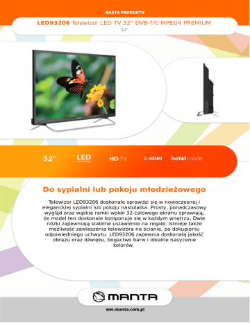 LED93206TelewizorLEDTV32"DVB-T/CMPEG4PREMIUM 32" Dosypialnilubpokojumłodzieżowego TelewizorLED93206doskonalesprawdzisięwnowoczesneji eleganckiejsypialnilubpokojunastolatka.Prosty,ponadczasowy wyglądorazwąskieramkiwokół32-calowegoekranusprawiają, żemodeltendoskonalekomponujesięwkażdymwnętrzu.Dwie nóżkizapewniająstabilneustawienienaregale.Istniejetakże możliwośćzawieszeniatelewizoranaścianie,podokupieniu odpowiedniegouchwytu.LED93206zapewniadoskonałąjakość obrazuorazdźwięku,bogactwobarwiidealnenasycenie kolorów. LED93206TelewizorLEDTV32"DVB-T/CMPEG4PREMIUM 32" Specyfikacja Złączaimożliwości TelewizorLED93206mawbudowanyzestawgniazd izłączyumożliwiającychpodłączeniewielu różnychurządzeń.DwagniazdaHDMIpozwalają urządzeniatakiejakkonsoladogier,odtwarzacz DVD,odtwarzaczBlu-ray,czykameracyfrowa. GniazdoSCART(EURO)pozwalapodłączyćstarsze urządzenia,naprzykładmagnetowid.Dziękizłączu VGAmożliwejestpodłączeniekomputeraPCi wykorzystanietelewizorajakomonitor komputerowy.Led93206wyposażonowtuner cyfrowyDVB-T/C,dziękiktóremumożliwejest oglądanietelewizjicyfrowejnaziemnejoraz kablowej.DekoderdźwiękuDolbyDigital+(E-AC3) zapewniamożliwośćodbieraniawysokiejjakości dźwiękucyfrowegotowarzyszącegoaudycjom telewizyjnym. Zapraszamydoświata produktówpremium! Najwyższejjakościwykonanieiwyselekcjonowane materiałysągwarancjąsatysfakcjizużytkowania. Jużterazzapoznajsięzcałągamąnaszych PremiumProduct! Zapisz Przekątnaekranu 32” Rozdzielczość 1366x768HDReady TunerDTV DVB-T/CMPEG-4 Jasność 200cd/m² Kontrast 1000:1 Czasreakcji 6.5ms EPG Tak Teletekst Tak HDMI 2 EURO(SCART) Tak Wejściekomponentowe(Y/Pb/Pr) Tak Wejściekompozytowe(A/V) Tak ZłączeCI Tak Słuchawki Tak Wbudowanegłośniki 2 Mocgłośników 2x10W Zasilanie AC110-240~50/60Hz Pobórprądu(czuwanie) 0.5W Pobórprądu(Max) 56W GniazdoUSB TAK http://www.manta.com.pl/pl/led93206 EAN:5902510607074