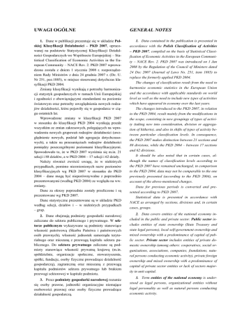 UWAGI OGÓLNE GENERAL NOTES 1. Dane w publikacji prezentuje się w układzie Polskiej Klasyfikacji Działalności – PKD 2007, opracowanej na podstawie Statystycznej Klasyfikacji Działalności Gospodarczych we Wspólnocie Europejskiej – Statistical Classification of Economic Activities in the European Community – NACE Rev. 2. PKD 2007 wprowadzona została z dniem 1 stycznia 2008 r. rozporządzeniem Rady Ministrów z dnia 24 grudnia 2007 r. (Dz. U. Nr 251, poz.1885), w miejsce stosowanej dotychczas klasyfikacji PKD 2004. Zmiany klasyfikacji wynikają z potrzeby harmonizacji statystyk gospodarczych w ramach Unii Europejskiej i zgodności z obowiązującymi standardami na poziomie światowym oraz potrzeby uwzględnienia nowych rodzajów działalności, które pojawiły się w gospodarce w ciągu ostatnich lat. Wprowadzone zmiany w klasyfikacji PKD 2007 w stosunku do klasyfikacji PKD 2004 wynikają przede wszystkim ze zmian zakresowych, polegających na wprowadzeniu nowych grupowań rodzajów działalności (uwzględnienie nowych, podział lub agregacja dotychczasowych), a także na przesunięciach rodzajów działalności pomiędzy poszczególnymi poziomami klasyfikacyjnymi. Spowodowało to, że w PKD 2007 wyróżnia się m.in. 21 sekcji i 88 działów, a w PKD 2004 – 17 sekcji i 62 działy. Należy również zwrócić uwagę, że w niektórych przypadkach, pomimo niezmienionych nazw poziomów klasyfikacyjnych wg PKD 2007 w stosunku do PKD 2004 – dane mogą być nieporównywalne z poprzednio prezentowanymi (według PKD 2004) ze względu na ww. zmiany. Dane za okresy poprzednie zostały przeliczone i są prezentowane wg PKD 2007. Dane statystyczne prezentowane są w układzie PKD według sekcji, działów i – w niektórych przypadkach – grup. 1. Data contained in the publication is presented in accordance with the Polish Classification of Activities 2. Dane obejmują podmioty gospodarki narodowej zaliczane do sektora publicznego i prywatnego. W sektorze publicznym wykazywane są podmioty stanowiące własność państwową (Skarbu Państwa i państwowych osób prawnych), własność jednostek samorządu terytorialnego oraz mieszaną z przewagą kapitału sektora publicznego. Do sektora prywatnego zaliczane są podmioty stanowiące własność prywatną krajową (m.in. spółdzielnie, organizacje społeczne, stowarzyszenia, spółki, fundacje, osoby fizyczne prowadzące działalność gospodarczą), zagraniczną oraz mieszaną z przewagą kapitału podmiotów sektora prywatnego lub brakiem przewagi sektorowej w kapitale podmiotu. 3. Przez podmioty gospodarki narodowej rozumie się osoby prawne, jednostki organizacyjne niemające osobowości prawnej oraz osoby fizyczne prowadzące działalność gospodarczą. – PKD 2007, compiled on the basis of Statistical Classification of Economic Activities in the European Community – NACE Rev. 2. PKD 2007 was introduced on 1 Jan 2008 by the Regulation of the Council of Ministers dated 24 Dec 2007 (Journal of Laws No. 251, item 1885) to replace the formerly applied PKD 2004. The changes of classification result from the need to harmonize economic statistics in the European Union and the accordance with applicable standards on world level as well as the need to include new types of activities which have appeared in economy over the last years. The changes introduced to the PKD 2007, in relation to the PKD 2004, result mainly from the modifications in the scope, consisting in new groupings of types of activity (taking new into consideration, division or aggregation of hitherto), and also in shifts of types of activity between particular classification levels. In consequence, the PKD 2007 makes distinction between 21 sections and 88 divisions, while the PKD 2004 – between 17 sections and 62 divisions. It should be also noted that in certain cases, although the names of classification levels according to the PKD 2007 have remained unchanged, in comparison to the PKD 2004, data may not be comparable to the one previously presented (according to the PKD 2004), on account of the above-mentioned changes. Data for previous periods is converted and presented according to PKD 2007. Statistical data is presented in accordance with NACE as arranged by sections, divisions and, in certain cases, groups. 2. Data covers entities of the national economy included in the public and private sector. Public sector includes entities of state ownership (State Treasury and state legal persons), local self-government ownership and mixed ownership with a predominance of capital of public sector. Private sector includes entities of private domestic ownership (among others: cooperatives, social organizations, associations, companies, foundations, natural persons conducting economic activity), private foreign ownership and mixed ownership with a predominance of capital of private sector entities or lack of sectors majority in unit capital. 3. Term entities of the national economy is understood as legal persons, organizational entities without legal personality as well as natural persons conducting economic activity. 8 Pod pojęciem podmiotów gospodarczych rozumie się podmioty prowadzące działalność gospodarczą, tj. produkcyjną i usługową, na własny rachunek w celu osiągnięcia zysku. 4. Biorąc pod uwagę liczbę pracujących, podmioty podzielono na trzy grupy: jednostki małe o liczbie pracujących do 9 osób, jednostki średnie o liczbie pracujących od 10 do 49 osób, jednostki duże o liczbie pracujących powyżej 49 osób. W niniejszej publikacji – jeśli nie zaznaczono inaczej – dane o sprzedaży produkcji, zatrudnieniu i wynagrodzeniach w sektorze przedsiębiorstw, wynikach finansowych i aktywach obrotowych przedsiębiorstw oraz nakładach inwestycyjnych dotyczą jednostek średnich i dużych. Pozostałe dane dotyczą wszystkich jednostek (bez względu na liczbę pracujących). 5. Sektor przedsiębiorstw obejmuje podmioty prowadzące działalno