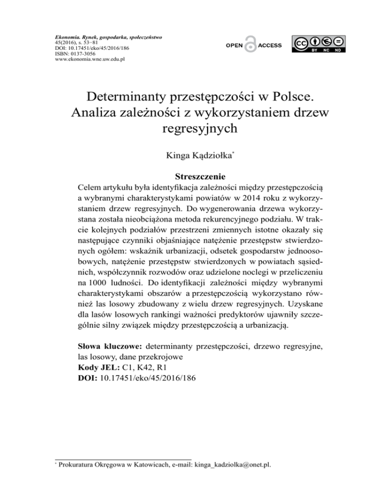 Ekonomia nr 45/2016 Ekonomia. Rynek, gospodarka, społeczeństwo 45(2016), s. 53−81 DOI: 10.17451/eko/45/2016/186 ISBN: 0137-3056 www.ekonomia.wne.uw.edu.pl Determinanty przestępczości w Polsce. Analiza zależności z wykorzystaniem drzew regresyjnych Kinga Kądziołka* Streszczenie Celem artykułu była identyfikacja zależności między przestępczością a wybranymi charakterystykami powiatów w 2014 roku z wykorzystaniem drzew regresyjnych. Do wygenerowania drzewa wykorzystana została nieobciążona metoda rekurencyjnego podziału. W trakcie kolejnych podziałów przestrzeni zmiennych istotne okazały się następujące czynniki objaśniające natężenie przestępstw stwierdzonych ogółem: wskaźnik urbanizacji, odsetek gospodarstw jednoosobowych, natężenie przestępstw stwierdzonych w powiatach sąsiednich, współczynnik rozwodów oraz udzielone noclegi w przeliczeniu na 1000 ludności. Do identyfikacji zależności między wybranymi charakterystykami obszarów a przestępczością wykorzystano również las losowy zbudowany z wielu drzew regresyjnych. Uzyskane dla lasów losowych rankingi ważności predyktorów ujawniły szczególnie silny związek między przestępczością a urbanizacją. Słowa kluczowe: determinanty przestępczości, drzewo regresyjne, las losowy, dane przekrojowe Kody JEL: C1, K42, R1 DOI: 10.17451/eko/45/2016/186 * Prokuratura Okręgowa w Katowicach, e-mail: [email protected]. 53 54 Kinga Kądziołka 1. Wprowadzenie Przestępczość jest zjawiskiem, które nie występuje z takim samym nasileniem na całym obszarze Polski. Ponadprzeciętnym natężeniem przestępstw charakteryzują się głównie obszary miejskie, a także powiaty zlokalizowane w pobliżu zachodniej granicy. Natężenie przestępstw (współczynnik przestępczości) to liczba przestępstw stwierdzonych1 dla danego roku obliczeniowego, przypadająca na pewną umownie przyjmowaną stałą liczbę ludności zamieszkałej na danym terenie (Bułat et al. 2007, 71). Najczęściej przyjmuje się liczbę przestępstw przypadającą na 100 tys. lub 10 tys. ludności. W prowadzonych tu analizach natężenie przestępstw wyznaczano jako liczbę przestępstw stwierdzonych, przypadającą na 100 tys. ludności. Na mapie (Rycina 1) przedstawiono przestrzenne zróżnicowanie powiatów pod względem natężenia przestępstw stwierdzonych ogółem w 2014 roku. Obszary zostały podzielone na dwie grupy: grupa 1: obiekty, dla których: xi ≤ grupa 2: obiekty, dla których: xi > gdzie xi oznacza wartość natężenia przestępstw w i – tym powiecie, – przeciętna wartość natężenia przestępstw w powiatach w 2014 roku. grupa 1 grupa 2 Rycina 1. Przestrzenne zróżnicowanie natężenia przestępstw w 2014 roku Źródło: opracowanie własne na podstawie danych GUS. Przestępczość stwierdzona to ogół czynów, których charakter jako przestępstw został potwierdzony w wyniku postępowania przygotowawczego (Hołyst 2001, 52). 1 Ekonomia nr 45/2016 55 W 2014 roku największym natężeniem przestępstw stwierdzonych charakteryzowały się powiaty: m. Sopot (6334), m. Legnica (6012), m. Katowice (5734), m. Wałbrzych (5564), m. Nowy Sącz (5002), m. Wrocław (4453). Najmniejsze natężenie przestępstw stwierdzonych charakteryzowało powiat krośnieński (475). W Warszawie natężenie przestępstw stwierdzonych ogółem w 2014 roku wynosiło 2889 i plasowało stolicę na 54 miejscu pod względem zagrożenia przestępczością stwierdzoną (licząc od obszaru charakteryzującego się największym natężeniem przestępstw do obszaru o najmniejszym zagrożeniu przestępczością stwierdzoną). Większość powiatów charakteryzujących się ponadprzeciętnym natężeniem przestępstw stwierdzonych zlokalizowana jest na terenie województw graniczących z Niemcami. Skupienie obszarów wysokiej przestępczości można też zaobserwować m.in. na terenie województwa śląskiego oraz wokół Warszawy. Celem artykułu jest identyfikacja zależności między natężeniem przestępstw stwierdzonych w powiatach w 2014 roku a wybranymi charakterystykami obszarów z wykorzystaniem drzew regresyjnych. Drzewa regresyjne dostarczają wyników łatwych w interpretacji i wizualizacji. Ponadto ta metoda, w przeciwieństwie do metod ekonometrycznych (wykorzystywanych w pracach polskich autorów do identyfikacji czynników wpływających na przestępczość), nie zakłada znajomości postaci analitycznej związku między zmienną objaśnianą a zmiennymi objaśniającymi. Nie jest także wymagane dokonywanie transformacji danych wejściowych ani redukcji początkowego zestawu potencjalnych zmiennych objaśniających, gdyż ich dobór następuje automatycznie na podstawie przyjętego wcześniej kryterium (Gatnar 2001, 8). Źródłem informacji będą ogólnodostępne dane publikowane na stronach internetowych Głównego Urzędu Statystycznego (Bank Danych Lokalnych) oraz Centralnego Zarządu Służby Więziennej. Możliwość zastosowania drzew regresyjnych do identyfikacji zależności między przestępczością a wybranymi charakterystykami obszarów zaprezentowana została w pracy Arbii i Tabasso (2013). Autorzy analizowali zależność między natężeniem zabójstw a wybranymi charakterystykami społeczno-ekonomicznymi na południowym obszarze USA. Wykorzystali do tego cztery rodzaje modeli drzew regresyjnych. Pierwszy model zawierał jako zmienne objaśniające tylko społeczno-ekonomiczne charakterystyki obszarów. W modelu drugim dodatkowo uwzględniono współrzędne geograficzne środków ciężkości obszarów. W modelu trzecim wykorzystano jako zmienne objaśniające czynniki społeczno-ekonomiczne oraz opóźnioną przestrzennie zmienną objaśnianą. W modelu tym współrzędne geograficzne zostały pominięte. W ostatnim z modeli wykorzystano jako zmienne objaśniające społeczno-ekonomiczne charakterystyki obszarów, współrzędne geograficzne oraz opóźnioną przestrzennie zmienną objaśnianą. 