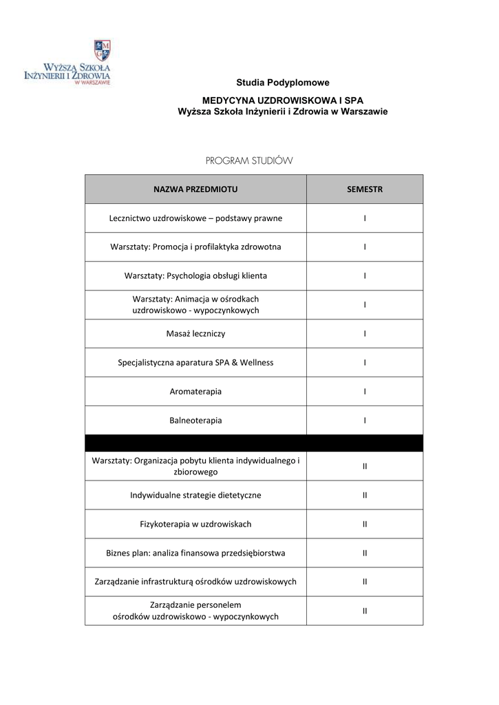 Studia Podyplomowe MEDYCYNA UZDROWISKOWA I SPA Wyższa Szkoła Inżynierii i Zdrowia w Warszawie PROGRAM STUDIÓW NAZWA PRZEDMIOTU SEMESTR Lecznictwo uzdrowiskowe – podstawy prawne I Warsztaty: Promocja i profilaktyka zdrowotna I Warsztaty: Psychologia obsługi klienta I Warsztaty: Animacja w ośrodkach uzdrowiskowo - wypoczynkowych I Masaż leczniczy I Specjalistyczna aparatura SPA & Wellness I Aromaterapia I Balneoterapia I Warsztaty: Organizacja pobytu klienta indywidualnego i zbiorowego II Indywidualne strategie dietetyczne II Fizykoterapia w uzdrowiskach II Biznes plan: analiza finansowa przedsiębiorstwa II Zarządzanie infrastrukturą ośrodków uzdrowiskowych II Zarządzanie personelem ośrodków uzdrowiskowo - wypoczynkowych II Public Relations: profesjonalne kształtowanie wizerunku ośrodków uzdrowiskowo - wypoczynkowych II
