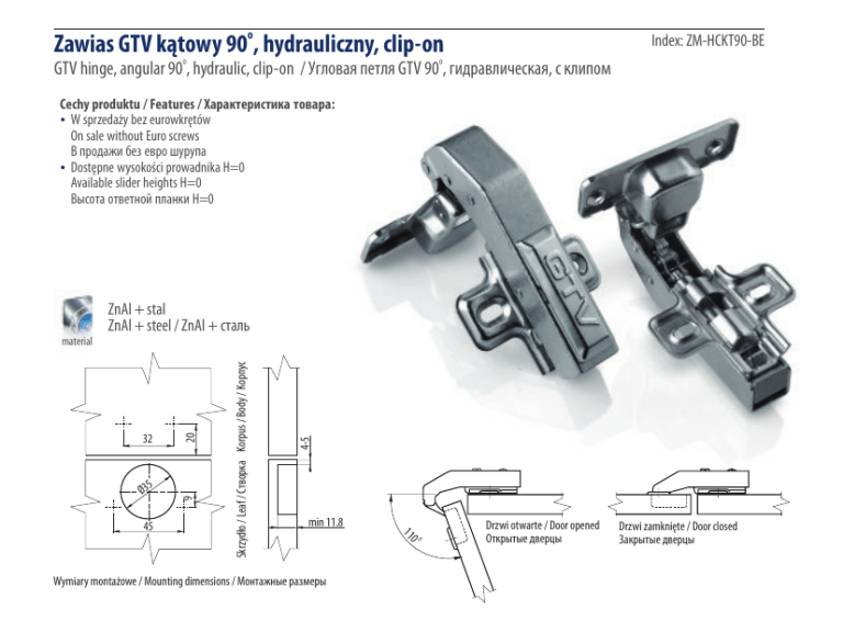 Zawias GTV kątowy 90o, hydrauliczny, clip-on Index: ZM-HCKT90-BE GTV hinge, angular 90o, hydraulic, clip-on / Угловая петля GTV 90о, гидравлическая, с клипом Cechy produktu / Features / Характеристика товара: W sprzedaży bez eurowkrętów On sale without Euro screws В продажи без евро шурупа Dostępne wysokości prowadnika H=0 Available slider heights H=0 Высота ответной планки H=0 ZnAl + stal ZnAl + steel / ZnAl + сталь 4-5 min 11.8 0 O Wymiary montażowe / Mounting dimensions / Монтажные размеры 11 45 9 5 Ø3 Skrzydło / Leaf / Створка Korpus / Body / Корпус 32 20 material Drzwi otwarte / Door opened Открытые дверцы Drzwi zamknięte / Door closed Закрытые дверцы