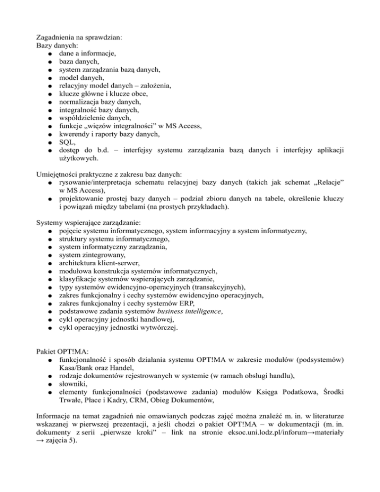Zagadnienia na sprawdzian: Bazy danych: ● dane a informacje, ● baza danych, ● system zarządzania bazą danych, ● model danych, ● relacyjny model danych – założenia, ● klucze główne i klucze obce, ● normalizacja bazy danych, ● integralność bazy danych, ● współdzielenie danych, ● funkcje „więzów integralności” w MS Access, ● kwerendy i raporty bazy danych, ● SQL, ● dostęp do b.d. – interfejsy systemu zarządzania bazą danych i interfejsy aplikacji użytkowych. Umiejętności praktyczne z zakresu baz danych: ● rysowanie/interpretacja schematu relacyjnej bazy danych (takich jak schemat „Relacje” w MS Access), ● projektowanie prostej bazy danych – podział zbioru danych na tabele, określenie kluczy i powiązań między tabelami (na prostych przykładach). Systemy wspierające zarządzanie: ● pojęcie systemu informatycznego, system informacyjny a system informatyczny, ● struktury systemu informatycznego, ● system informatyczny zarządzania, ● system zintegrowany, ● architektura klient-serwer, ● modułowa konstrukcja systemów informatycznych, ● klasyfikacje systemów wspierających zarządzanie, ● typy systemów ewidencyjno-operacyjnych (transakcyjnych), ● zakres funkcjonalny i cechy systemów ewidencyjno operacyjnych, ● zakres funkcjonalny i cechy systemów ERP, ● podstawowe zadania systemów business intelligence, ● cykl operacyjny jednostki handlowej, ● cykl operacyjny jednostki wytwórczej. Pakiet OPT!MA: ● funkcjonalność i sposób działania systemu OPT!MA w zakresie modułów (podsystemów) Kasa/Bank oraz Handel, ● rodzaje dokumentów rejestrowanych w systemie (w ramach obsługi handlu), ● słowniki, ● elementy funkcjonalności (podstawowe zadania) modułów Księga Podatkowa, Środki Trwałe, Płace i Kadry, CRM, Obieg Dokumentów, Informacje na temat zagadnień nie omawianych podczas zajęć można znaleźć m. in. w literaturze wskazanej w pierwszej prezentacji, a jeśli chodzi o pakiet OPT!MA – w dokumentacji (m. in. dokumenty z serii „pierwsze kroki” – link na stronie eksoc.uni.lodz.pl/inforum→materiały → zajęcia 5).