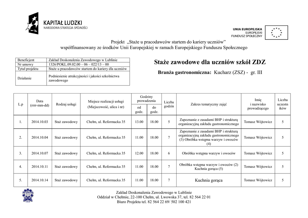 Projekt „Staże u pracodawców startem do kariery uczniów” współfinansowany ze środków Unii Europejskiej w ramach Europejskiego Funduszu Społecznego Beneficjent Nr umowy Tytuł projektu Zakład Doskonalenia Zawodowego w Lublinie 1326/POKL.09.02.00 – 06 – 022/13 – 00 Staże u pracodawców startem do kariery dla uczniów Działanie Podniesienie atrakcyjności i jakości szkolnictwa zawodowego L.p Data (rrrr-mm-dd) Rodzaj usługi 1. 2014.10.03 Staż zawodowy Miejsce realizacji usługi (Miejscowość, ulica i nr) Chełm, ul. Reformacka 35 Staże zawodowe dla uczniów szkół ZDZ Branża gastronomiczna: Kucharz (ZSZ) - gr. III Godziny prowadzenia od godz. do godz. 13.00 18.00 Liczba godzin Zakres tematyczny zajęć Imię i nazwisko prowadzącego Liczba uczestn ików 5 Zapoznanie z zasadami BHP i strukturą organizacyjną zakładu gastronomicznego Tomasz Wójtowicz 5 Tomasz Wójtowicz 5 2. 2014.10.04 Staż zawodowy Chełm, ul. Reformacka 35 11.00 18.00 7 Zapoznanie z zasadami BHP i strukturą organizacyjną zakładu gastronomicznego (3) Obróbka wstępna warzyw i owoców (4) 3. 2014.10.07 Staż zawodowy Chełm, ul. Reformacka 35 12.00 18.00 6 Obróbka wstępna warzyw i owoców Tomasz Wójtowicz 5 4. 2014.10.11 Staż zawodowy Chełm, ul. Reformacka 35 11.00 18.00 7 Obróbka wstępna warzyw i owoców (2) Kuchnia gorąca (5) Tomasz Wójtowicz 5 5. 2014.10.14 Staż zawodowy Chełm, ul. Reformacka 35 11.00 18.00 7 Kuchnia gorąca Tomasz Wójtowicz 5 Zakład Doskonalenia Zawodowego w Lublinie Oddział w Chełmie, 22-100 Chełm, ul. Lwowska 37, tel. 82 564 22 01 Biuro Projektu tel. 82 564 22 69/ 502 100 421 Projekt „Staże u pracodawców startem do kariery uczniów” współfinansowany ze środków Unii Europejskiej w ramach Europejskiego Funduszu Społecznego 6. 2014.10.18 Staż zawodowy Chełm, ul. Reformacka 35 11.00 18.00 7 Kuchnia gorąca Tomasz Wójtowicz 5 7. 2014.10.21 Staż zawodowy Chełm, ul. Reformacka 35 12.00 18.00 6 Kuchnia gorąca Tomasz Wójtowicz 5 8. 2014.10.25 Staż zawodowy Chełm, ul. Reformacka 35 11.00 18.00 7 Kuchnia gorąca Tomasz Wójtowicz 5 9. 2014.10.28 Staż zawodowy Chełm, ul. Reformacka 35 12.00 18.00 6 Kuchnia gorąca Tomasz Wójtowicz 5 10. 2014.11.06 Staż zawodowy Chełm, ul. Reformacka 35 12.00 18.00 6 Kuchnia gorąca (2). Ekspedycja potraw (4). Tomasz Wójtowicz 5 11. 2014.11.08 Staż zawodowy Chełm, ul. Reformacka 35 11.00 18.00 7 Ekspedycja potraw Tomasz Wójtowicz 5 12. 2014.11.10 Staż zawodowy Chełm, ul. Reformacka 35 11.00 18.00 7 Ekspedycja potraw (3). Pracownia garmażeryjna (4) Tomasz Wójtowicz 5 13. 2014.11.15 Staż zawodowy Chełm, ul. Reformacka 35 11.00 18.00 7 Pracownia garmażeryjna Tomasz Wójtowicz 5 14. 2014.11.18 Staż zawodowy Chełm, ul. Reformacka 35 12.00 18.00 6 Pracownia garmażeryjna Tomasz Wójtowicz 5 15. 2014.11.22 Staż zawodowy Chełm, ul. Reformacka 35 11.00 18.00 7 Pracownia garmażeryjna Tomasz Wójtowicz 5 Zakład Doskonalenia Zawodowego w Lublinie Oddział w Chełmie, 22-100 Chełm, ul. Lwowska 37, tel. 82 564 22 01 Biuro Projektu tel. 82 564 22 69/ 502 100 421 Projekt „Staże u pracodawców startem do kariery uczniów” współfinansowany ze środków Unii Europejskiej w ramach Europejskiego Funduszu Społecznego 16. 2014.11.25 Staż zawodowy Chełm, ul. Reformacka 35 12.00 18.00 6 Pracownia garmażeryjna Tomasz Wójtowicz 5 17. 2014.11.29 Staż zawodowy Chełm, ul. Reformacka 35 11.00 18.00 7 Pracownia garmażeryjna Tomasz Wójtowicz 5 18. 2014.12.02 Staż zawodowy Chełm, ul. Reformacka 35 12.00 18.00 6 Pracownia garmażeryjna (1). Deserownia/Ciastkarnia (5) Tomasz Wójtowicz 5 19. 2014.12.06 Staż zawodowy Chełm, ul. Reformacka 35 11.00 18.00 7 Deserownia/Ciastkarnia Tomasz Wójtowicz 5 20. 2014.12.09 Staż zawodowy Chełm, ul. Reformacka 35 12.00 18.00 6 Deserownia/Ciastkarnia Tomasz Wójtowicz 5 21. 2014.12.13 Staż zawodowy Chełm, ul. Reformacka 35 11.00 18.00 7 Deserownia/Ciastkarnia Tomasz Wójtowicz 5 22. 2014.12.16 Staż zawodowy Chełm, ul. Reformacka 35 12.00 18.00 6 Deserownia/Ciastkarnia (5). Zaopatrzenie/Magazynowanie/ Rozliczenie Tomasz Wójtowicz 5 23. 2014.12.20 Staż zawodowy Chełm, ul. Reformacka 35 11.00 18.00 7 Zaopatrzenie/Magazynowanie/Ro zliczenie Tomasz Wójtowicz 5 Zakład Doskonalenia Zawodowego w Lublinie Oddział w Chełmie, 22-100 Chełm, ul. Lwowska 37, tel. 82 564 22 01 Biuro Projektu tel. 82 564 22 69/ 502 100 421
