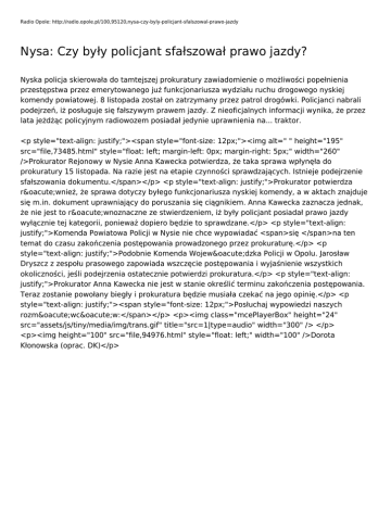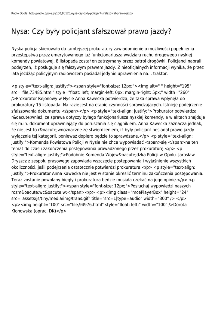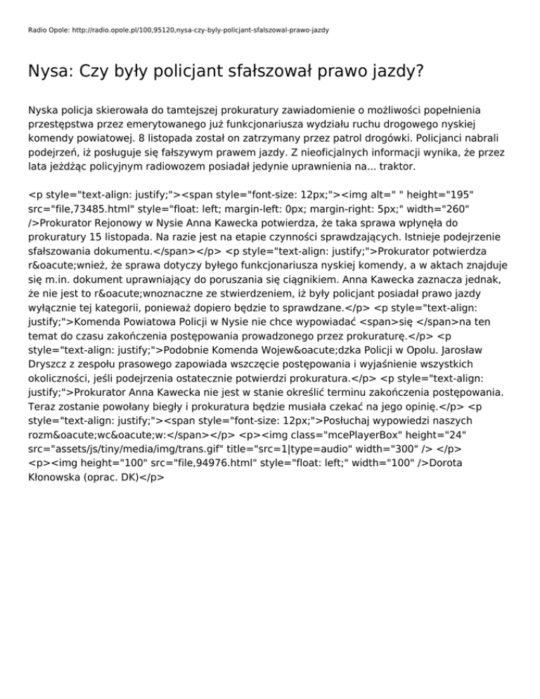 Radio Opole: http://radio.opole.pl/100,95120,nysa-czy-byly-policjant-sfalszowal-prawo-jazdy Nysa: Czy były policjant sfałszował prawo jazdy? Nyska policja skierowała do tamtejszej prokuratury zawiadomienie o możliwości popełnienia przestępstwa przez emerytowanego już funkcjonariusza wydziału ruchu drogowego nyskiej komendy powiatowej. 8 listopada został on zatrzymany przez patrol drogówki. Policjanci nabrali podejrzeń, iż posługuje się fałszywym prawem jazdy. Z nieoficjalnych informacji wynika, że przez lata jeżdżąc policyjnym radiowozem posiadał jedynie uprawnienia na... traktor. <p style="text-align: justify;"><span style="font-size: 12px;"><img alt=" " height="195" src="file,73485.html" style="float: left; margin-left: 0px; margin-right: 5px;" width="260" />Prokurator Rejonowy w Nysie Anna Kawecka potwierdza, że taka sprawa wpłynęła do prokuratury 15 listopada. Na razie jest na etapie czynności sprawdzających. Istnieje podejrzenie sfałszowania dokumentu.</span></p> <p style="text-align: justify;">Prokurator potwierdza również, że sprawa dotyczy byłego funkcjonariusza nyskiej komendy, a w aktach znajduje się m.in. dokument uprawniający do poruszania się ciągnikiem. Anna Kawecka zaznacza jednak, że nie jest to równoznaczne ze stwierdzeniem, iż były policjant posiadał prawo jazdy wyłącznie tej kategorii, ponieważ dopiero będzie to sprawdzane.</p> <p style="text-align: justify;">Komenda Powiatowa Policji w Nysie nie chce wypowiadać <span>się </span>na ten temat do czasu zakończenia postępowania prowadzonego przez prokuraturę.</p> <p style="text-align: justify;">Podobnie Komenda Wojewódzka Policji w Opolu. Jarosław Dryszcz z zespołu prasowego zapowiada wszczęcie postępowania i wyjaśnienie wszystkich okoliczności, jeśli podejrzenia ostatecznie potwierdzi prokuratura.</p> <p style="text-align: justify;">Prokurator Anna Kawecka nie jest w stanie określić terminu zakończenia postępowania. Teraz zostanie powołany biegły i prokuratura będzie musiała czekać na jego opinię.</p> <p style="text-align: justify;"><span style="font-size: 12px;">Posłuchaj wypowiedzi naszych rozmówców:</span></p> <p><img class="mcePlayerBox" height="24" src="assets/js/tiny/media/img/trans.gif" title="src=1|type=audio" width="300" /> </p> <p><img height="100" src="file,94976.html" style="float: left;" width="100" />Dorota Kłonowska (oprac. DK)</p>